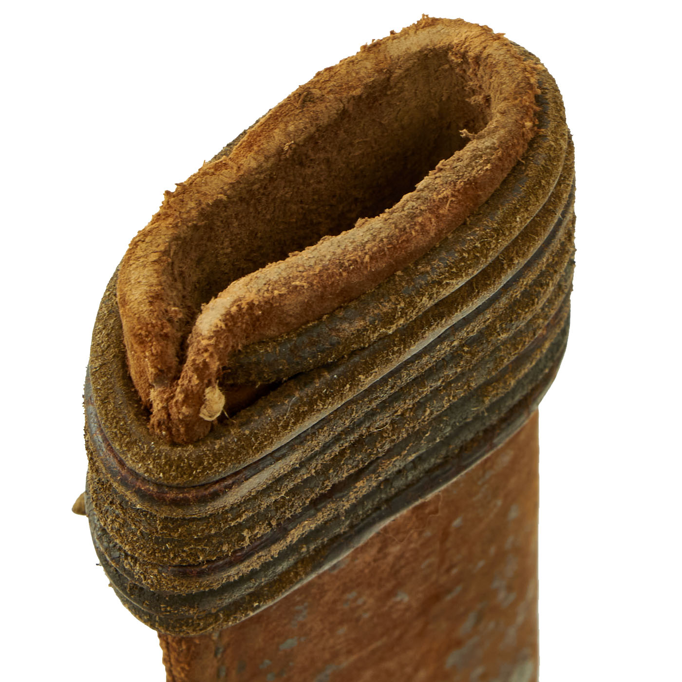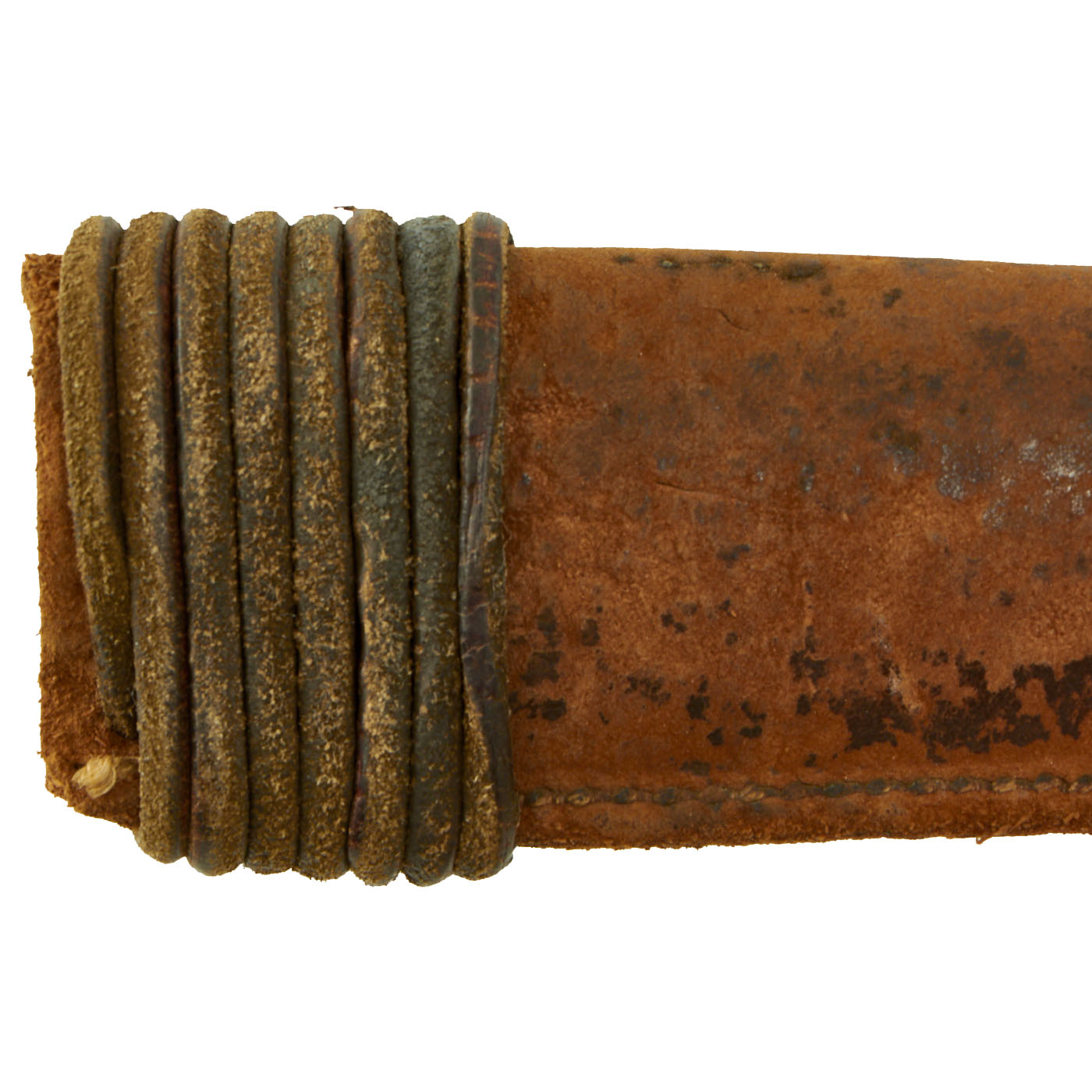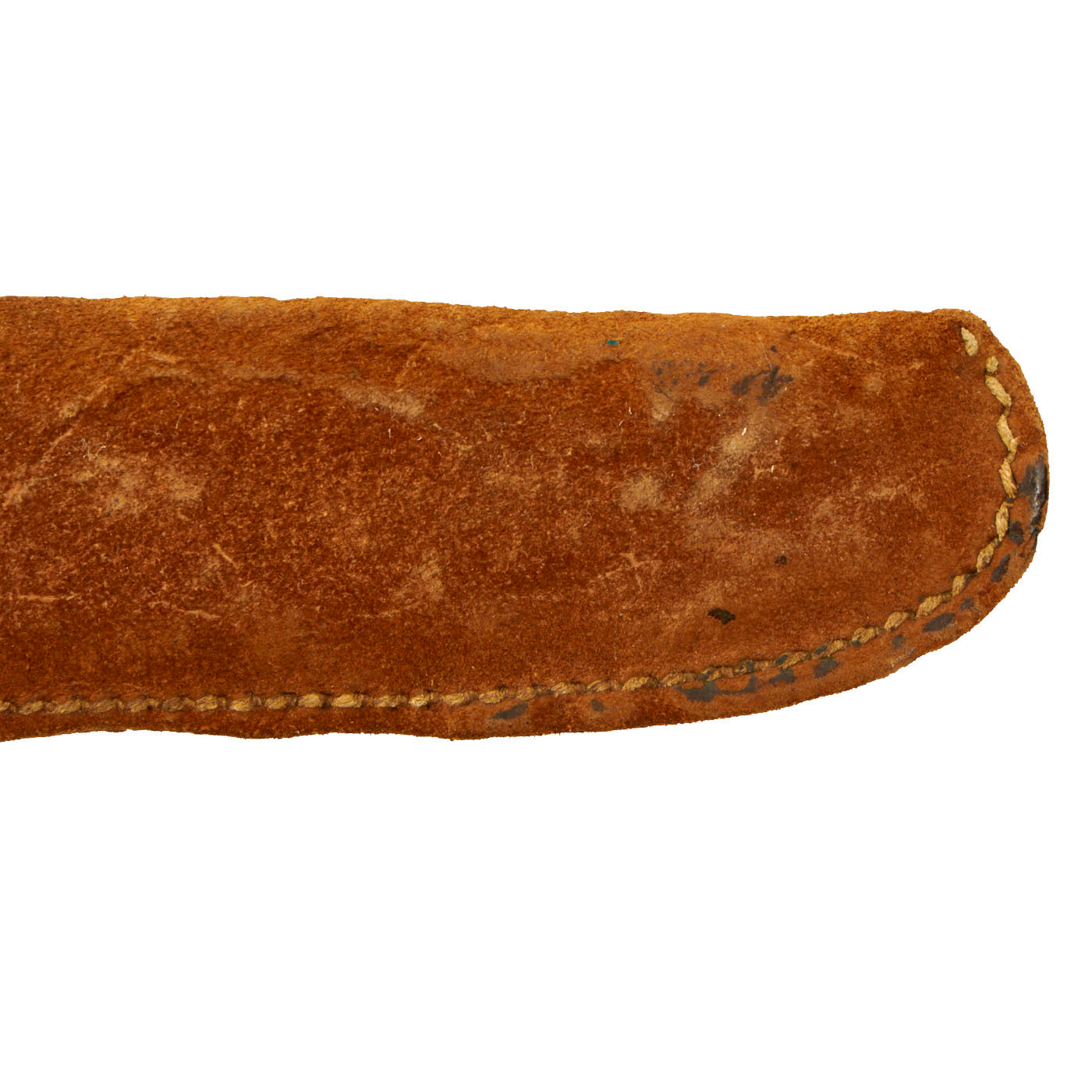 The overall condition of the knife is good but there is some oxidation present as well has pitting and staining on all metal components exempt for the knuckle guard part. The included leather scabbard does appear to be a solid WWII era made example and was more than likely made from scrap leather that was found. There is no external belt loop present but there are two slits cut into the reverse which was used to pass a belt through in order to carry the knife. The sheath is in good condition but almost all of the original finish is worn away.