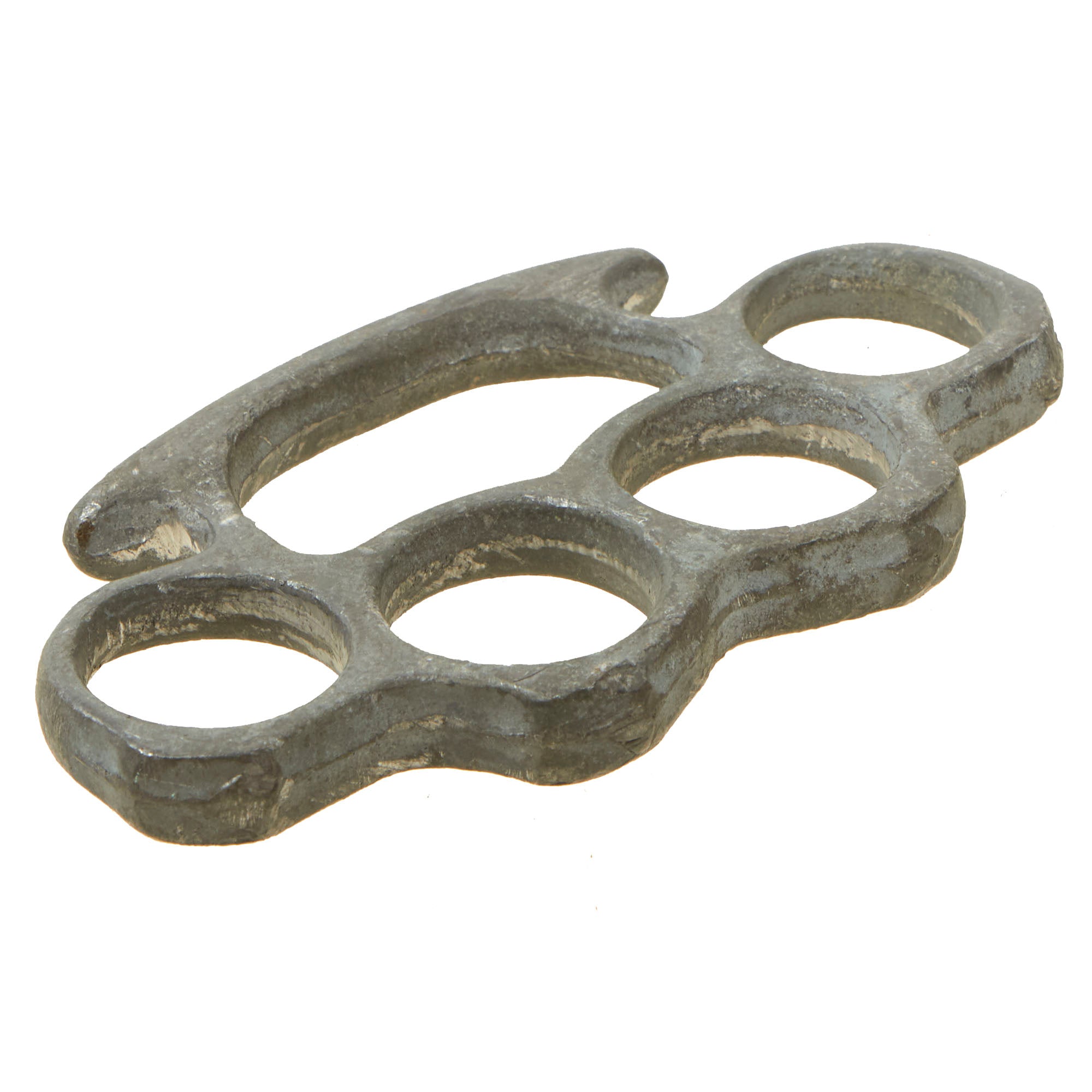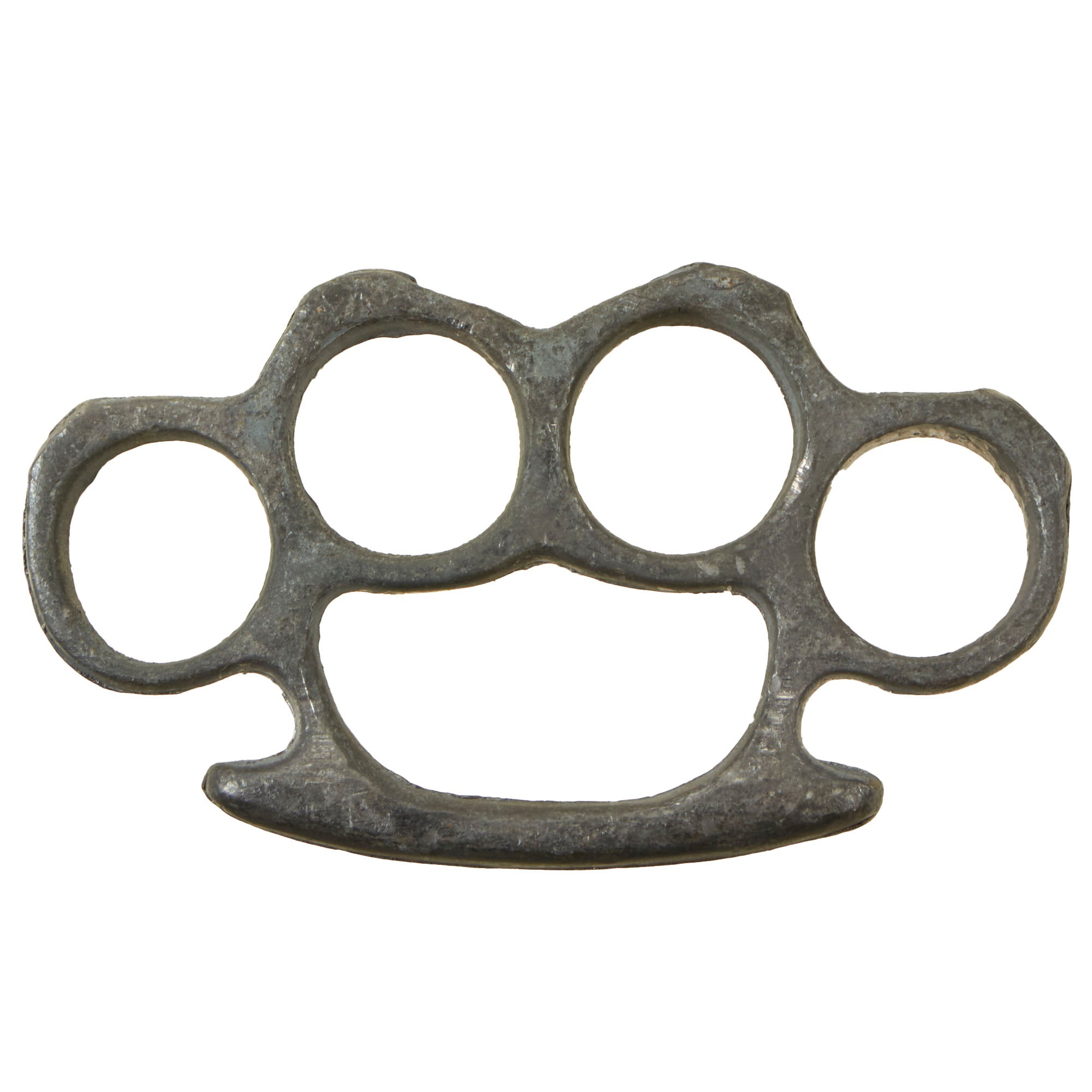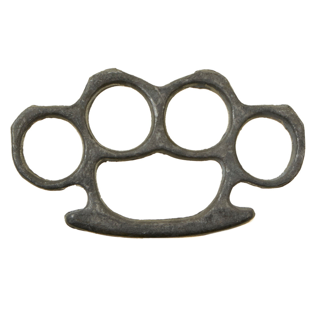 Original Item: Only One Available. This is a very nice example of a U.S. WWII set of Custom Made Lead or Zinc Knuckle Dusters, used for close combat in the field. These were often cast aboard large ships, who necessarily had small foundries and metalworkers needed to effect repairs on the various parts of a ship. Compared to their usual work, making cast knuckles was relatively simple. The look of the surface texture suggests that they were sand cast, a very old and effective way of casting metal. The original model for these was probably made using other more precise methods, and the mold marks from the original can still be seen even with the distortion from sand casting.