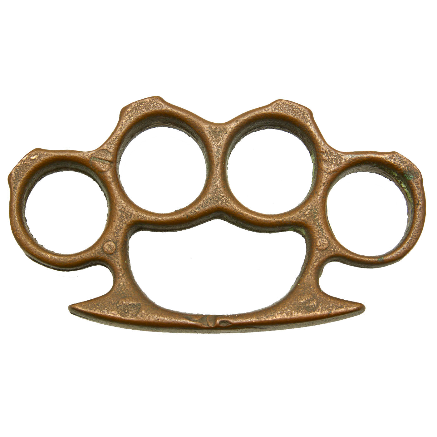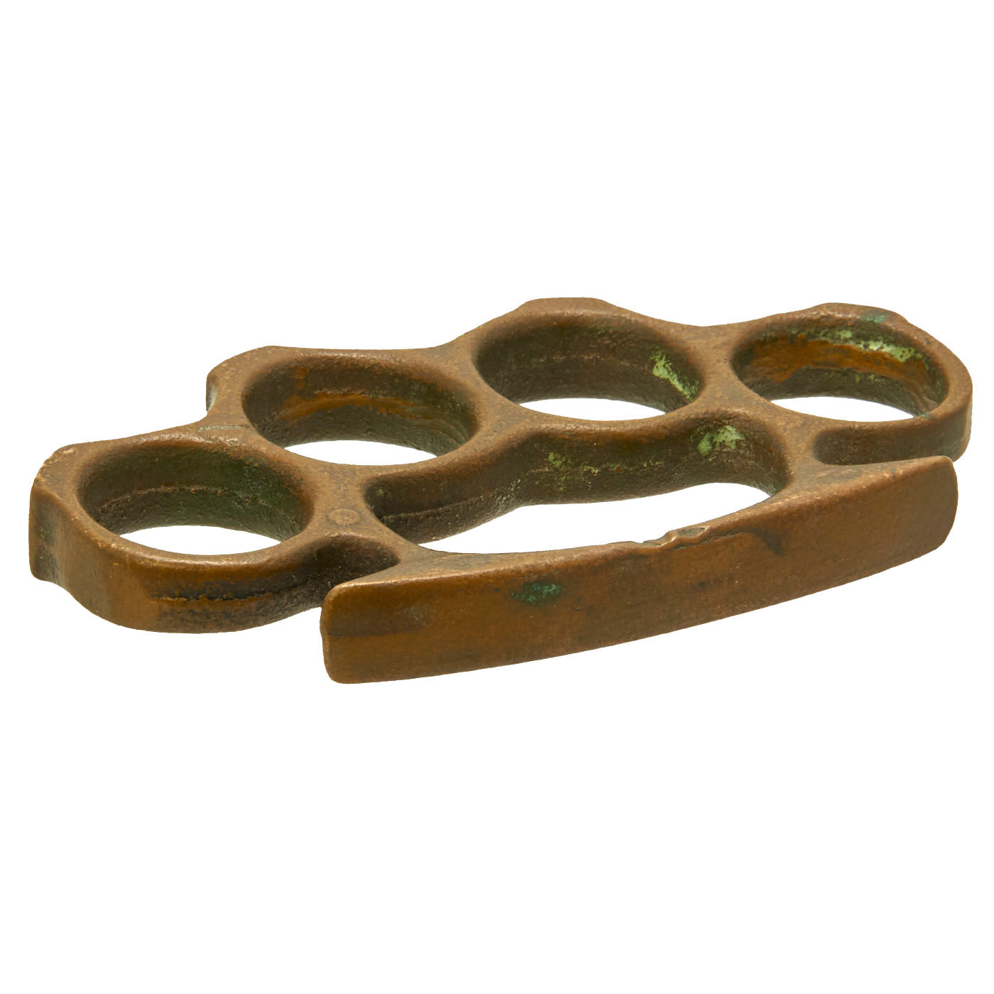 Original Item: Only One Available. Here we have a very nice example of a U.S. WWII set of Custom Made Brass Knuckle Duster, used for close combat in the field. These were often cast aboard large ships, who necessarily had small foundries and metalworkers needed to effect repairs on the various parts of a ship. Compared to their usual work, making cast brass knuckles was relatively simple. The look of the surface texture suggests that they were sand cast, a very old and effective way of casting metal.