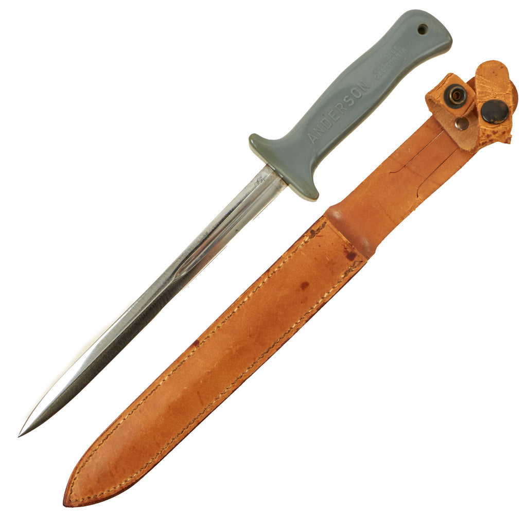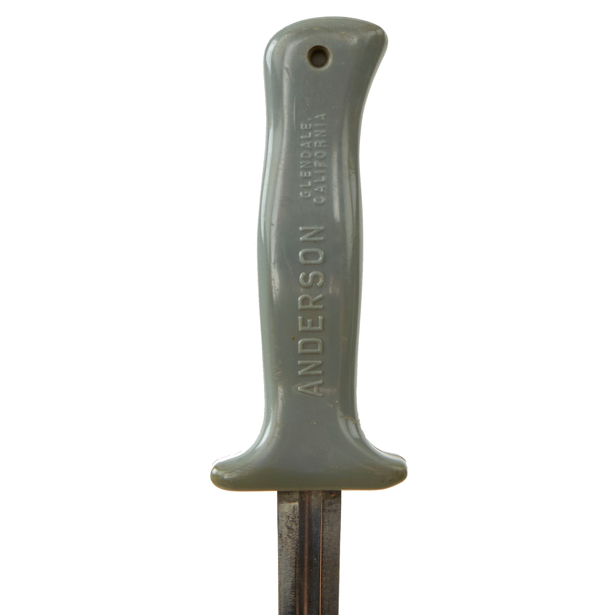 Original Item: Only One Available. During WW2 the need for fighting knives was so great that many private makers geared up to equip America's fighting men. Tom Anderson of Glendale, California took advantage of the government's release of quality blade steel in the form of the old M-1913 "Patton" cavalry sabers to make high quality private purchase fighting knives. Each Patton saber would yield three usable sections of high quality blade steel, to which Anderson affixed his patented injection molded plastic handle. It was a high tech procedure for the early 1940s.