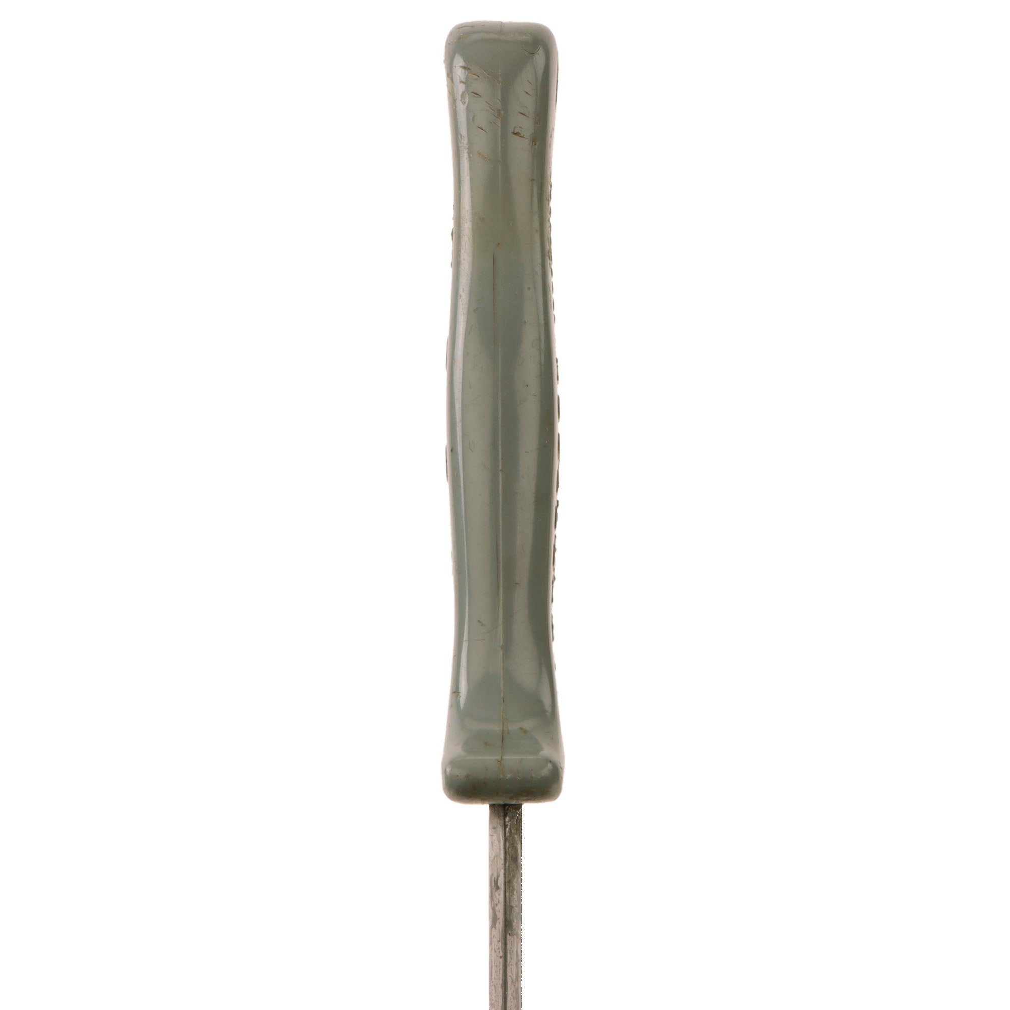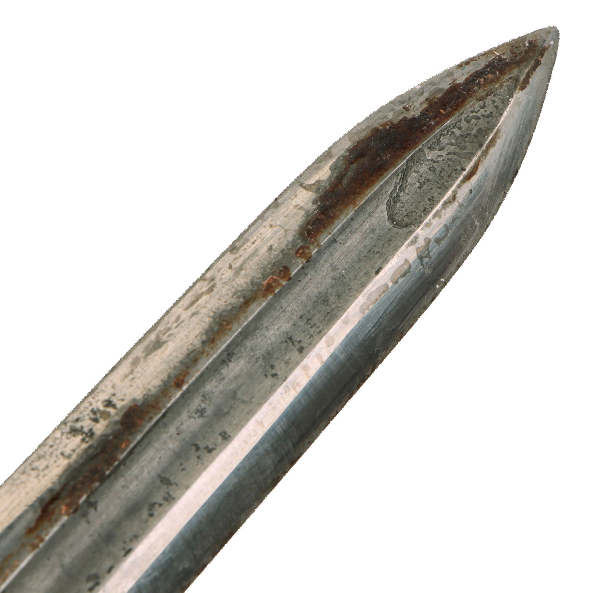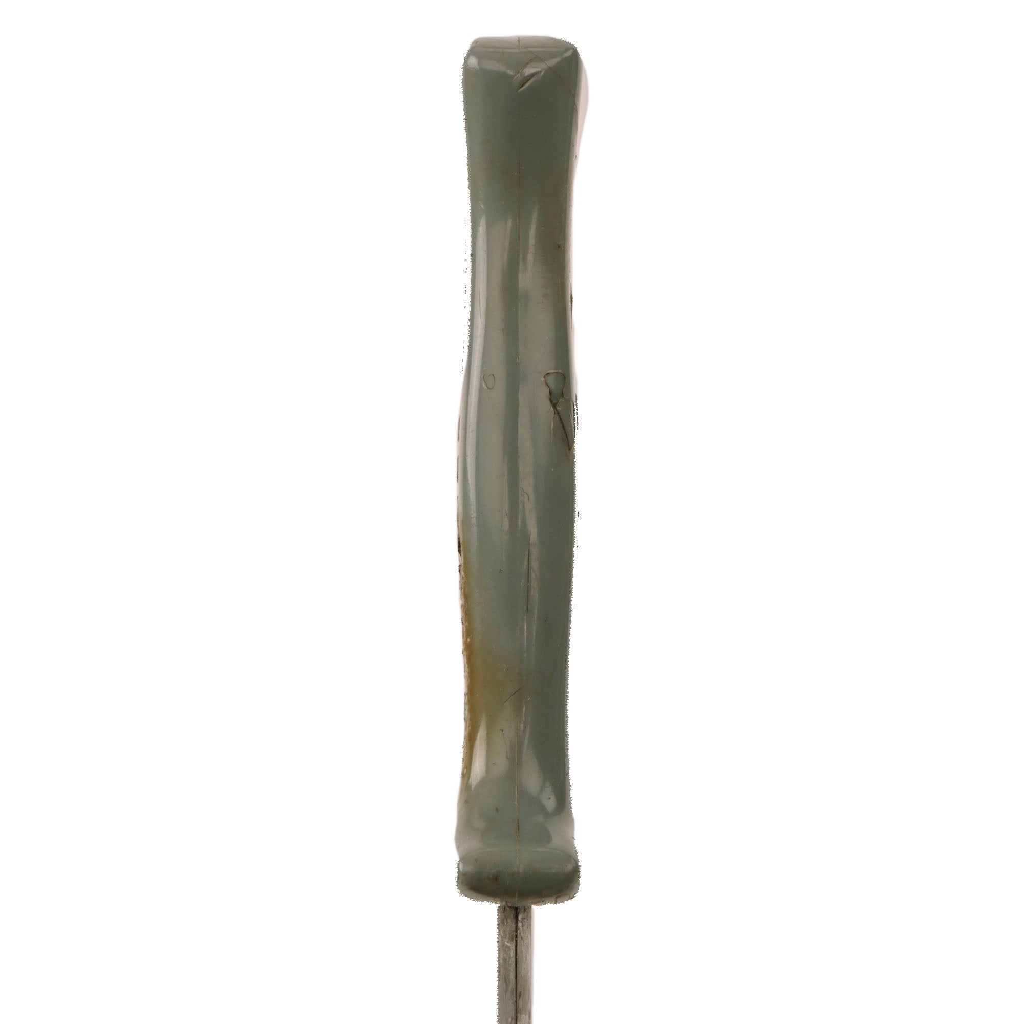This original US Army USMC WW2 Custom Anderson "Modern Grind" Fighting Knife is in excellent, field used condition, with rust, pitting, and staining on the blade. The handle is affixed to a point section of an M-1913 Cavalry saber, and is not marked anywhere on the blade. The injection molded plastic handle is marked ANDERSON / GLENDALE CALIFORNIA on one side and MADE IN USA on the reverse. There is heavy scratching, cracking, and burn marks on the plastic.