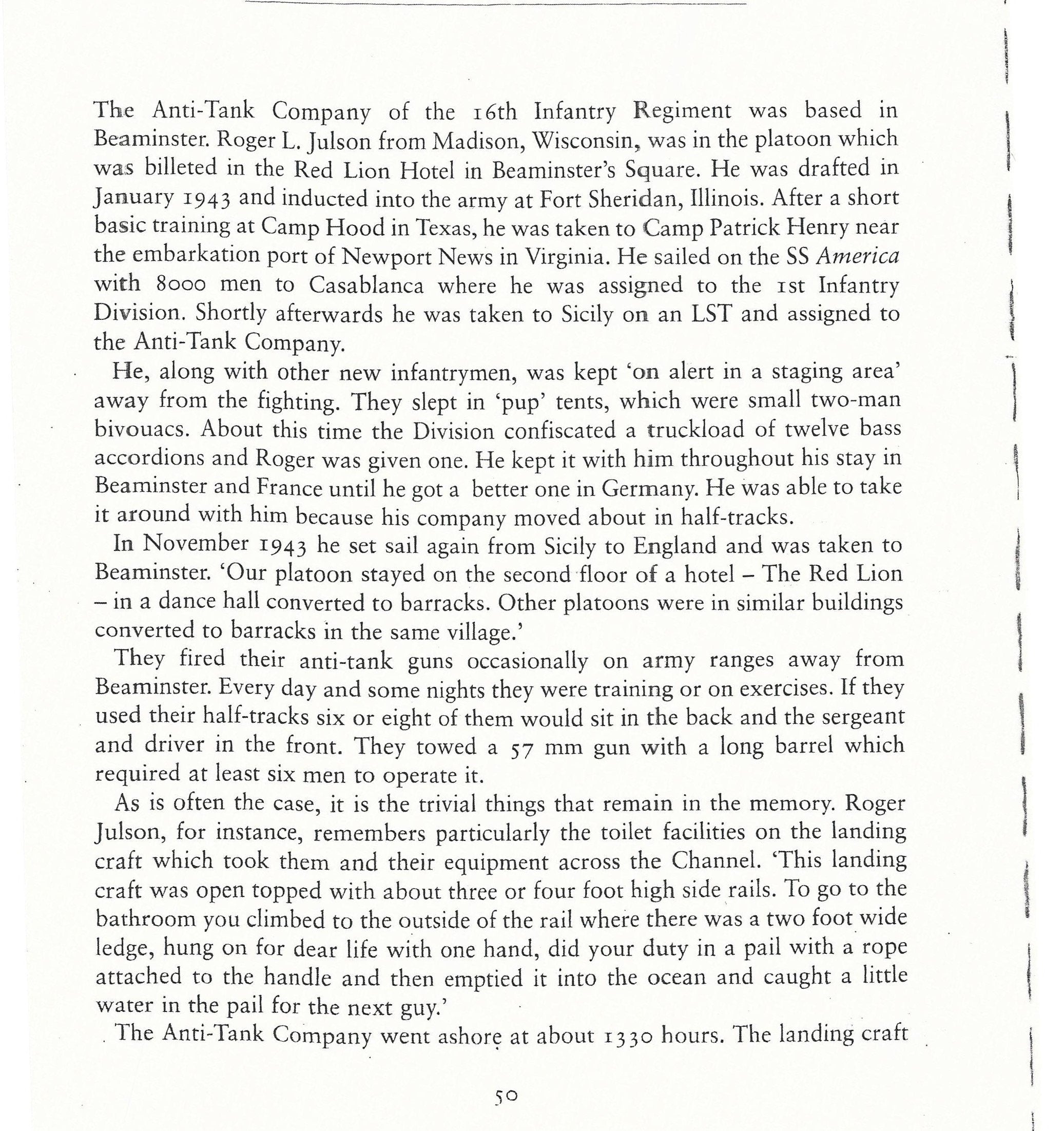 The Anti-Tank Company of the 16th Infantry Regiment was based in Beaminster. Roger L. Julson from Madison, Wisconsin, was in the platoon which was billeted in the Red Lion Hotel in Beaminster's Square. He was drafted in January 1943 and inducted into the army at Fort Sheridan, Illinois. After a short basic training at Camp Hood in Texas, he was taken to Camp Patrick Henry near the embarkation port of Newport News in Virginia. He sailed on the SS America with 8000 men to Casablanca where he was assigned to the 1st Infantry Division. Shortly afterwards he was taken to Sicily on an LST and assigned to the Anti-Tank Company.
