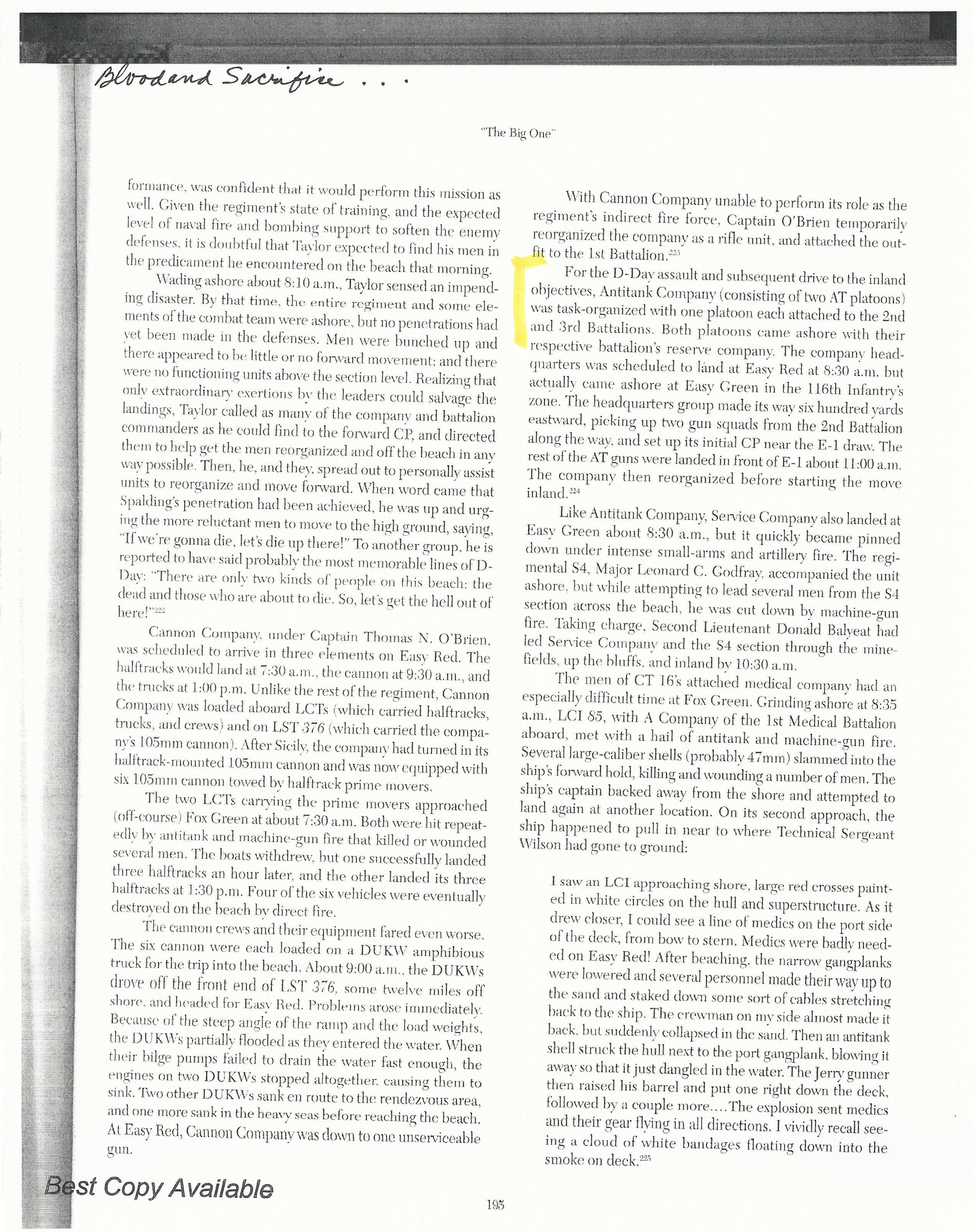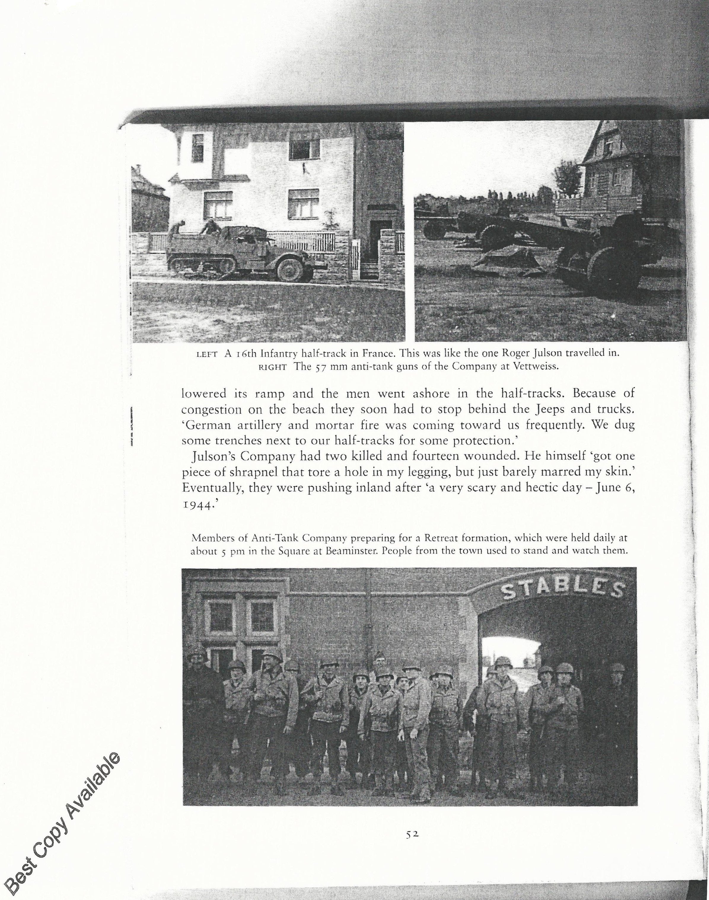 The Anti-Tank Company went ashore at about 133o hours. The landing craft lowered its ramp and the men went ashore in the half-tracks, Because of congestion on the beach they soon had to stop behind the Jeeps and trucks. `German artillery and mortar fire was coming toward us frequently. We dug some trenches next to our half-tracks for some protection.' Julson's Company had two killed and fourteen wounded. He himself 'got one piece of shrapnel that tore a hole in my legging, but just barely marred my skin.' Eventually, they were pushing inland after 'a very scary and hectic day — June 6, 1944.'
