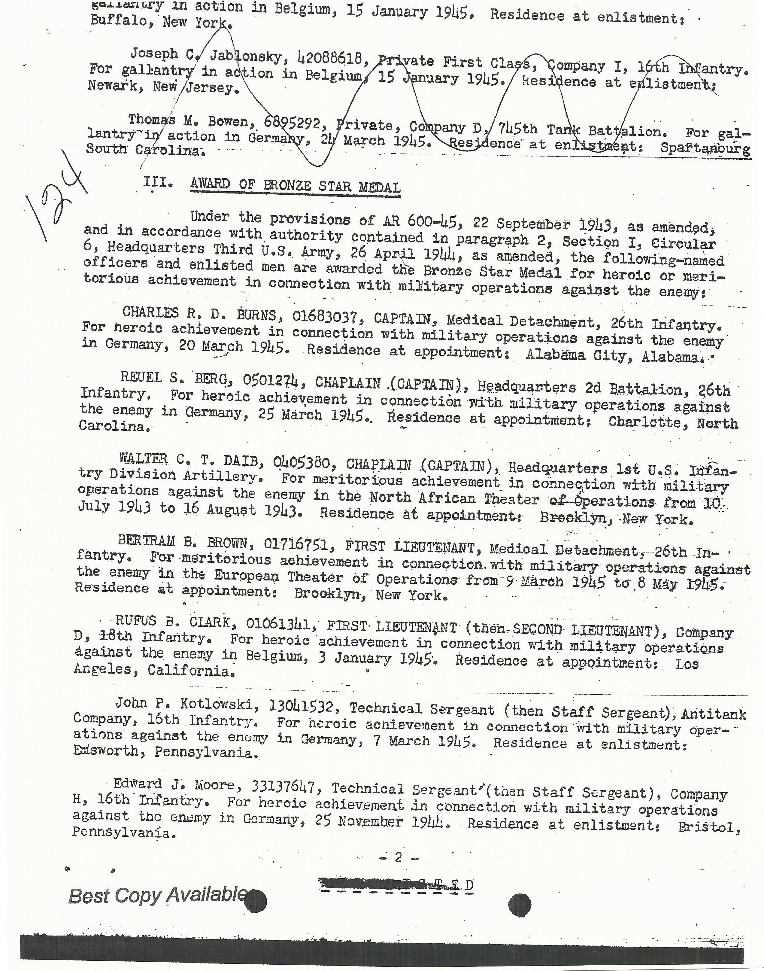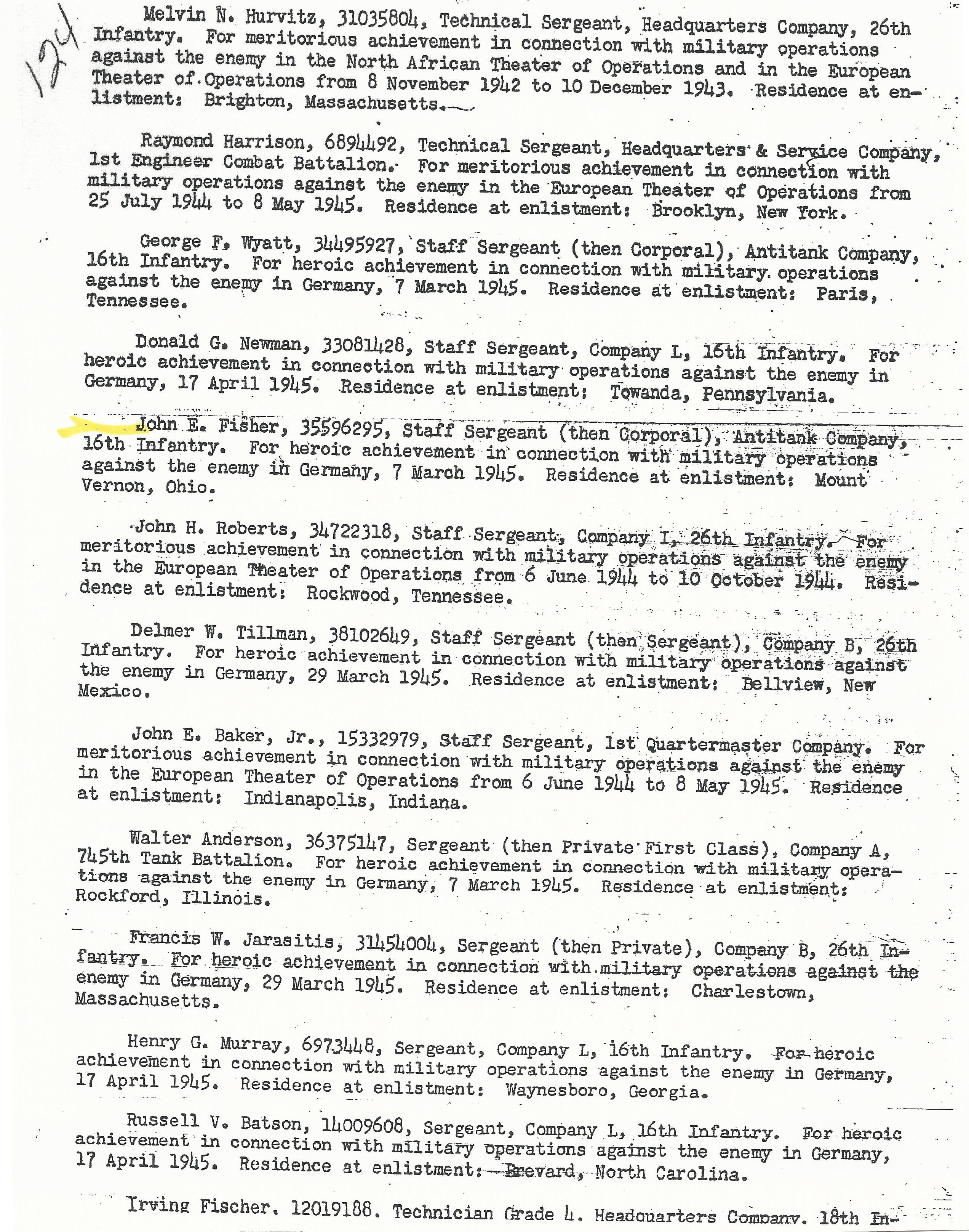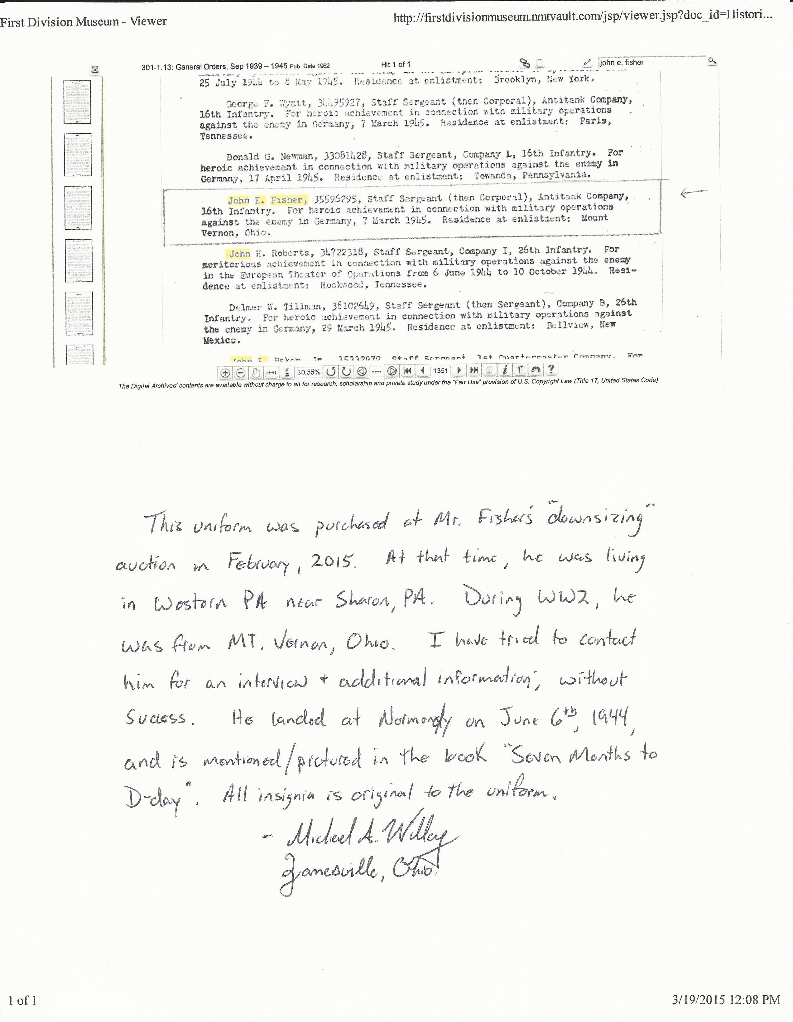 - Research binder with copies of Fisher's wartime documents such as his Bronze Star Citation, pages from Seven Months to D-Day: An American Regiment which include group photos of Fisher and other members of the 16th Infantry Regiment Anti-Tank Company, notes from the collector that sourced this material from Fischer's wife Violet and much more.