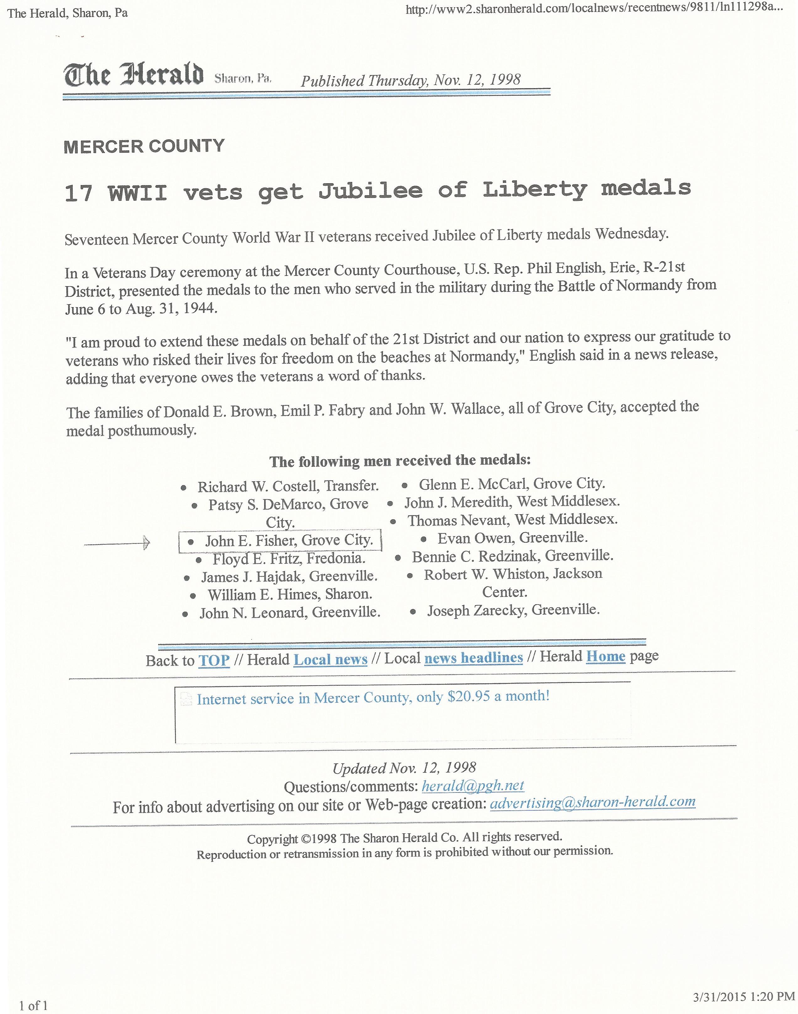 John E. Fisher, 35596295, Staff Sergeant (then Corporal) was awarded the Bronze Star Medal "For Heroic achievement in connection with military operations against the enemy in the European Theater of Operation from 6 June 1944 to 10 October 1944. Residence at enlistment: Mount Vernon, Ohio." Both the original Bronze Star Medal and copy of citation are included in this set.