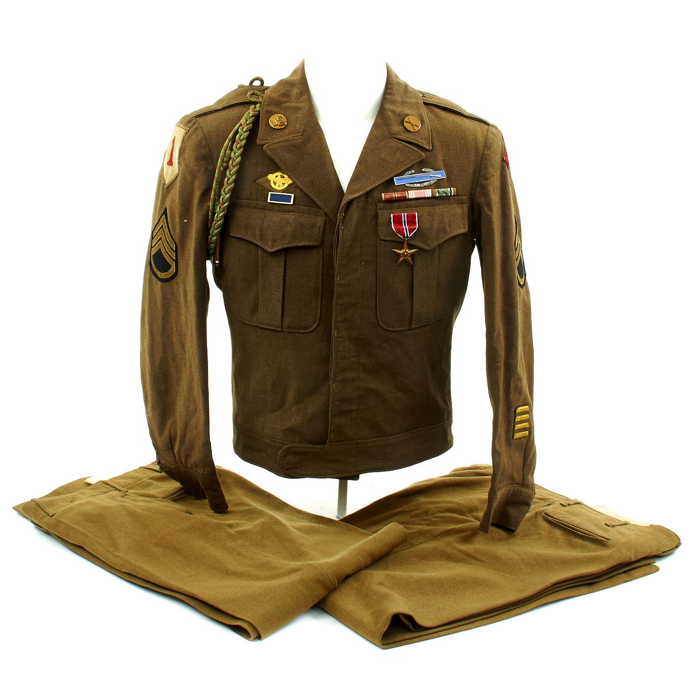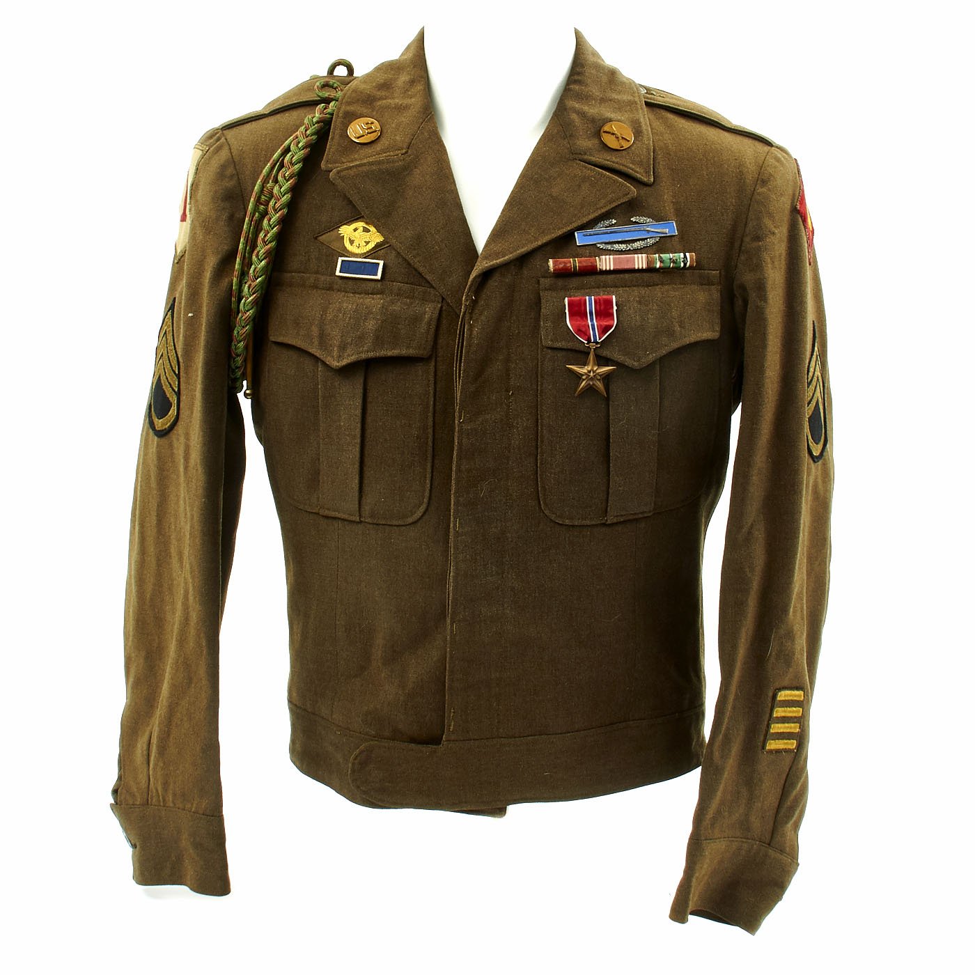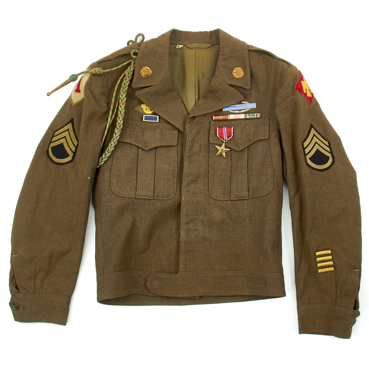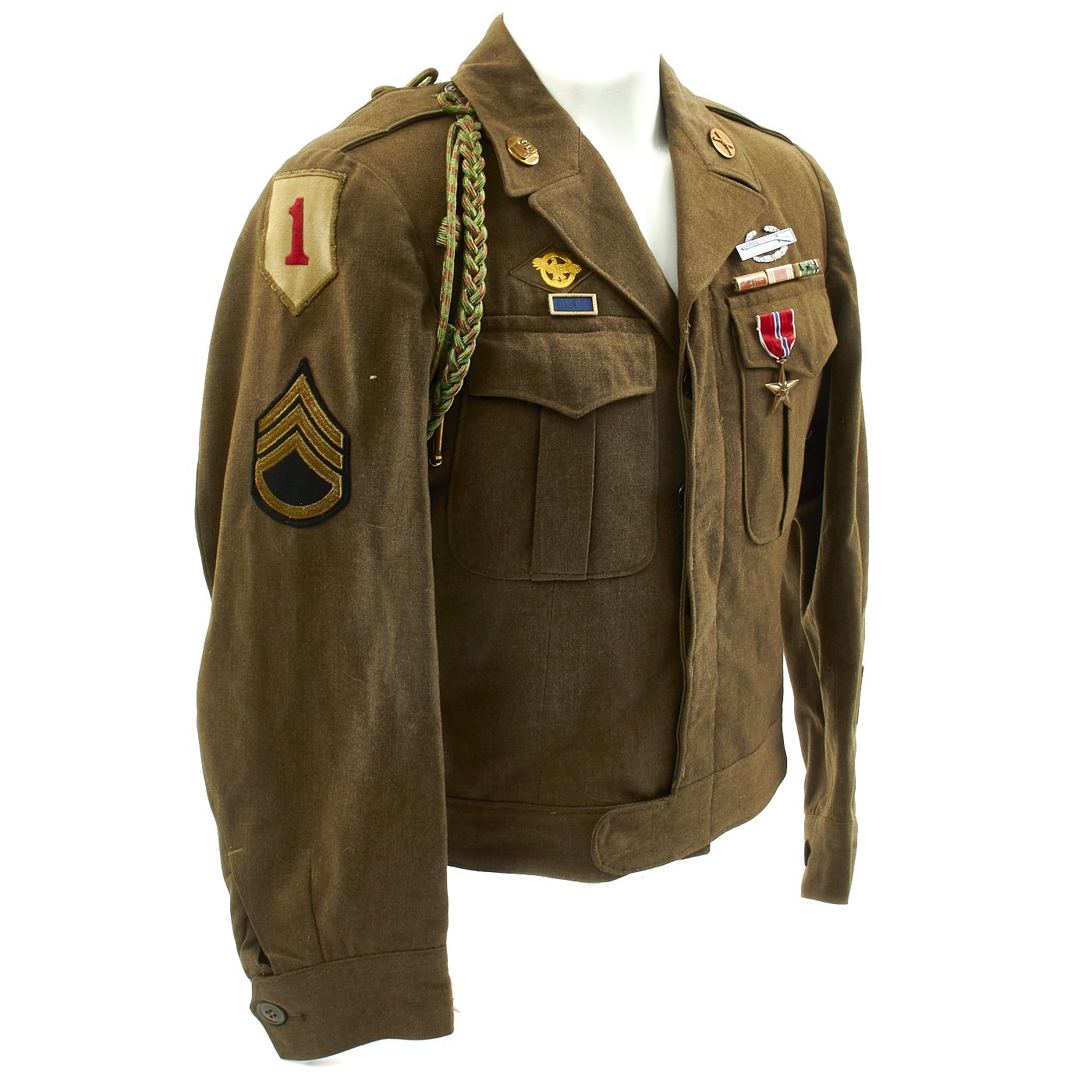 - Original WWII issue Ike Jacket in size 36R in excellent condition with 1st Infantry Division "Big Red One" patch on the right shoulder and 45th Infantry Division on right shoulder (he came home with the 45th). Bronze Star Medal, Sterling Silver WWII Combat Infantryman Badge CIB, Artillery lapel pins and Medal ribbons that include: Bronze Star Medal, Good Conduct, European–African–Middle Eastern Campaign Medal with an Invasion Arrowhead (D-Day) and 2 Campaign Stars, Presidential Unit Citation, Ruptured Duck Patch, French Croix De Guerre Fourragère shoulder cord, Chevrons, four overseas service bars on the left sleeve indicating 2+ years in overseas service. The inside of the jacket is clearly ink marked F6295 (which stands for Fisher, Army Serial Number 35596295).