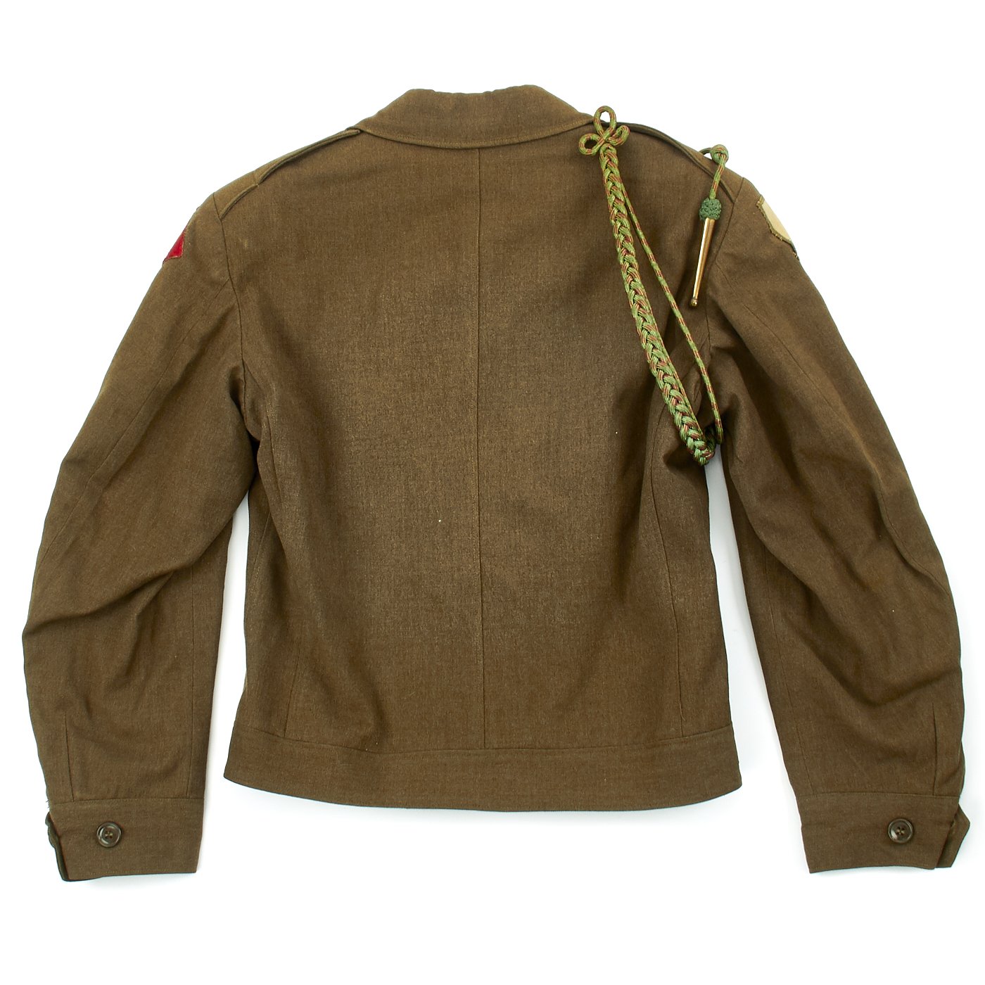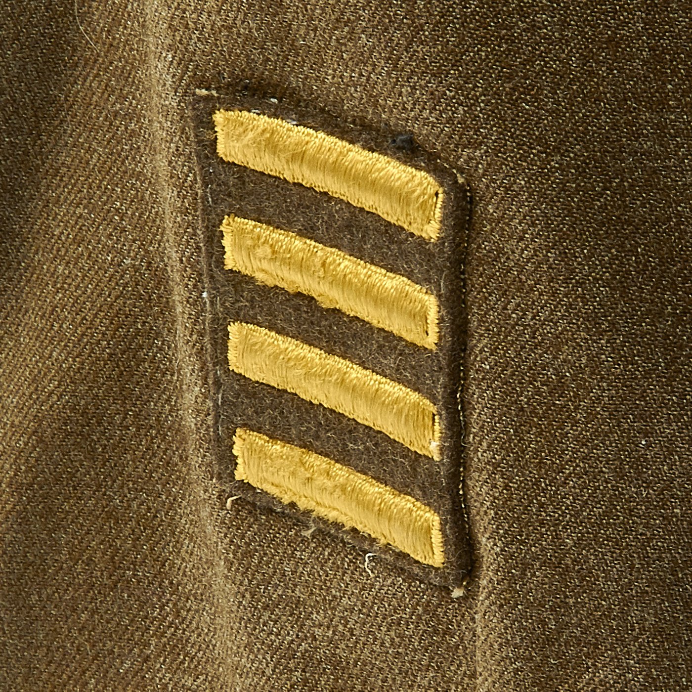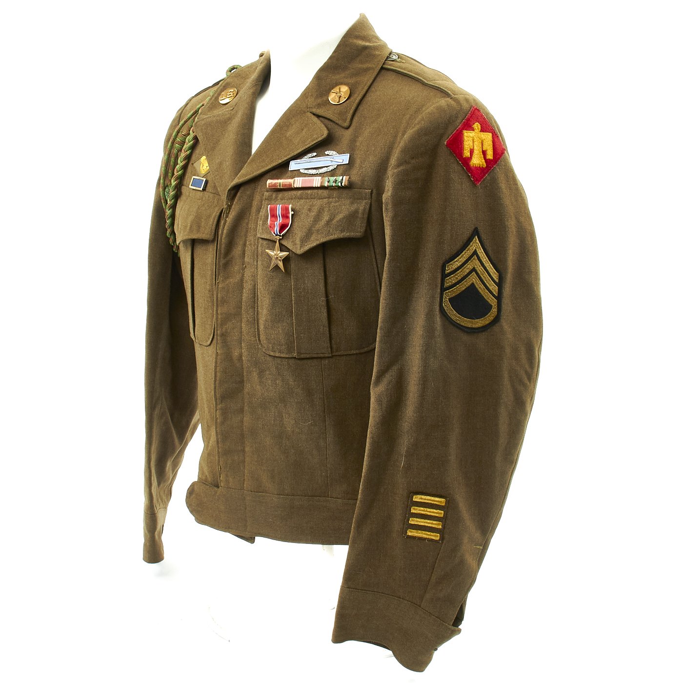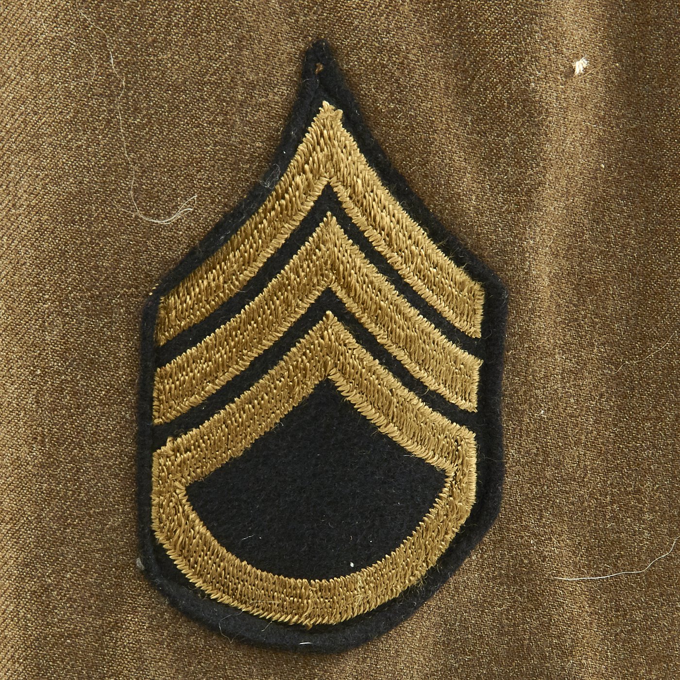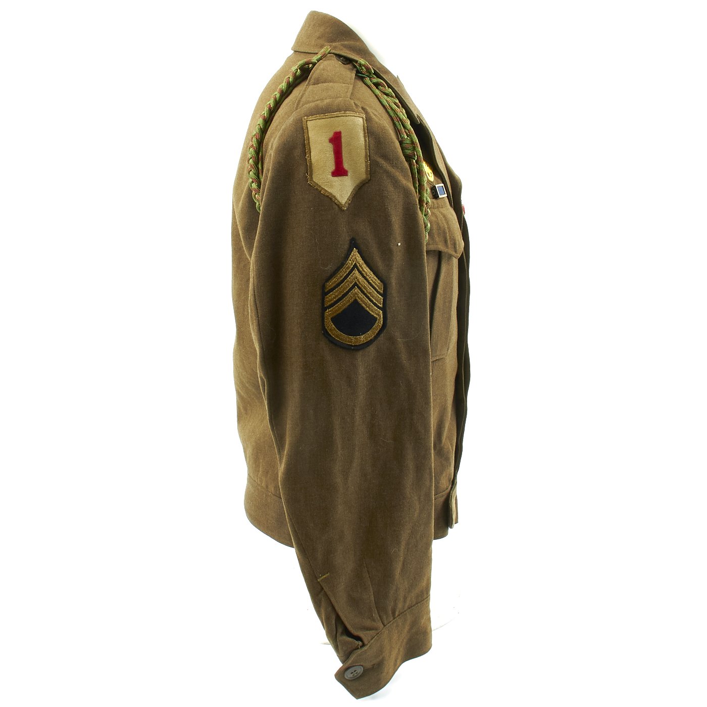 - Original WWII issue Ike Jacket in size 36R in excellent condition with 1st Infantry Division "Big Red One" patch on the right shoulder and 45th Infantry Division on right shoulder (he came home with the 45th). Bronze Star Medal, Sterling Silver WWII Combat Infantryman Badge CIB, Artillery lapel pins and Medal ribbons that include: Bronze Star Medal, Good Conduct, European–African–Middle Eastern Campaign Medal with an Invasion Arrowhead (D-Day) and 2 Campaign Stars, Presidential Unit Citation, Ruptured Duck Patch, French Croix De Guerre Fourragère shoulder cord, Chevrons, four overseas service bars on the left sleeve indicating 2+ years in overseas service. The inside of the jacket is clearly ink marked F6295 (which stands for Fisher, Army Serial Number 35596295).