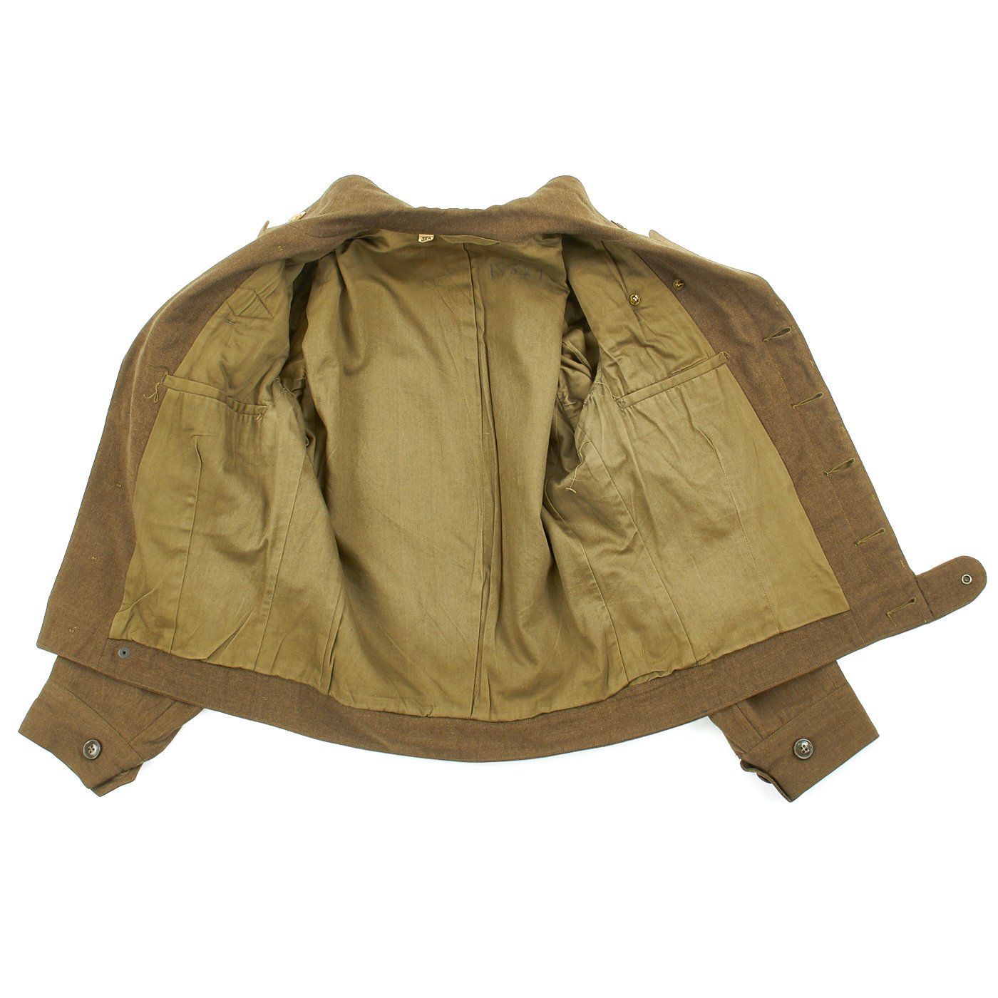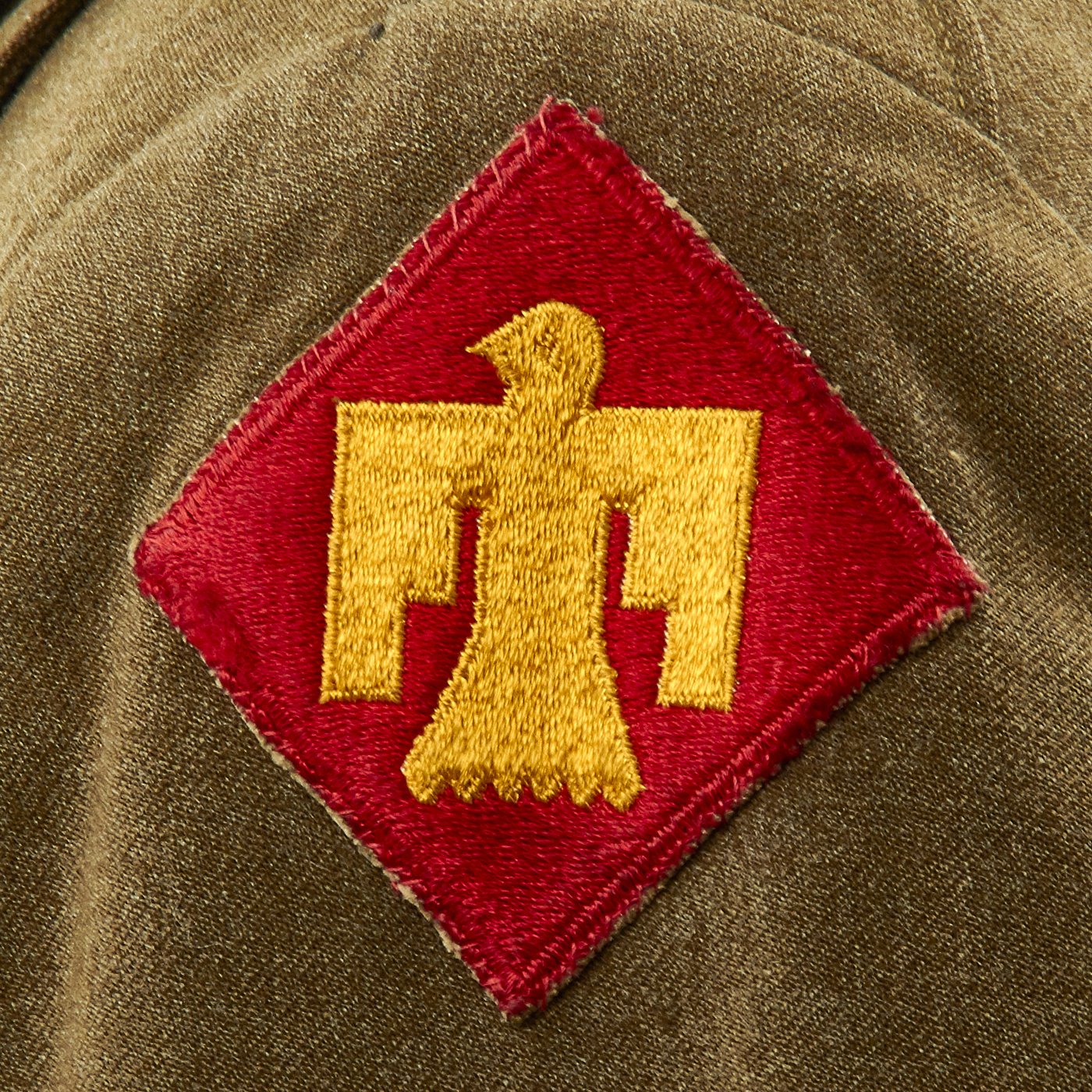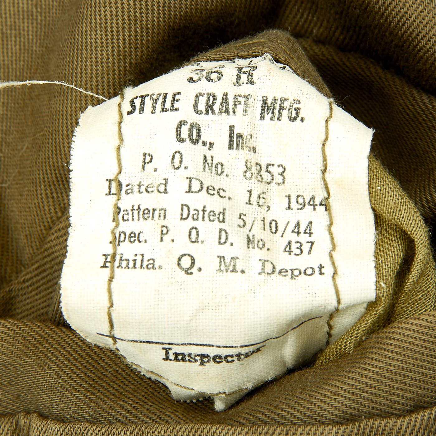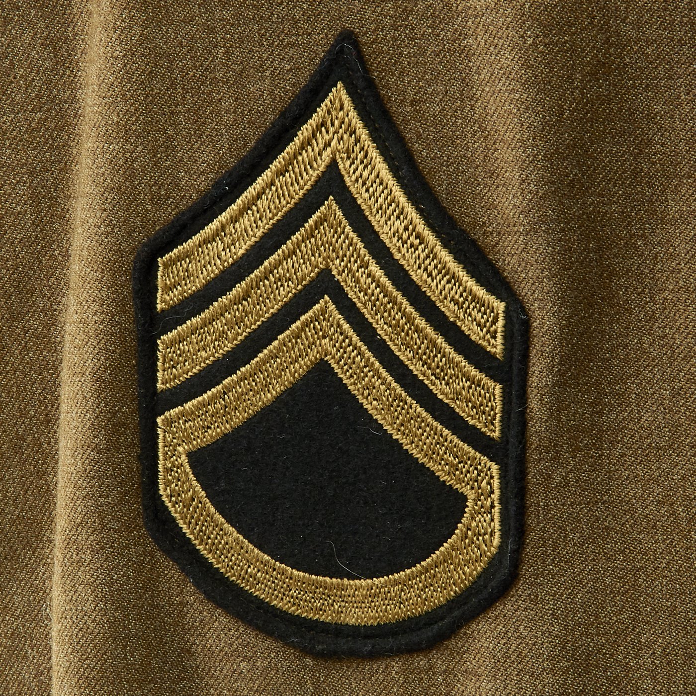 - Original WWII issue Ike Jacket in size 36R in excellent condition with 1st Infantry Division "Big Red One" patch on the right shoulder and 45th Infantry Division on right shoulder (he came home with the 45th). Bronze Star Medal, Sterling Silver WWII Combat Infantryman Badge CIB, Artillery lapel pins and Medal ribbons that include: Bronze Star Medal, Good Conduct, European–African–Middle Eastern Campaign Medal with an Invasion Arrowhead (D-Day) and 2 Campaign Stars, Presidential Unit Citation, Ruptured Duck Patch, French Croix De Guerre Fourragère shoulder cord, Chevrons, four overseas service bars on the left sleeve indicating 2+ years in overseas service. The inside of the jacket is clearly ink marked F6295 (which stands for Fisher, Army Serial Number 35596295).