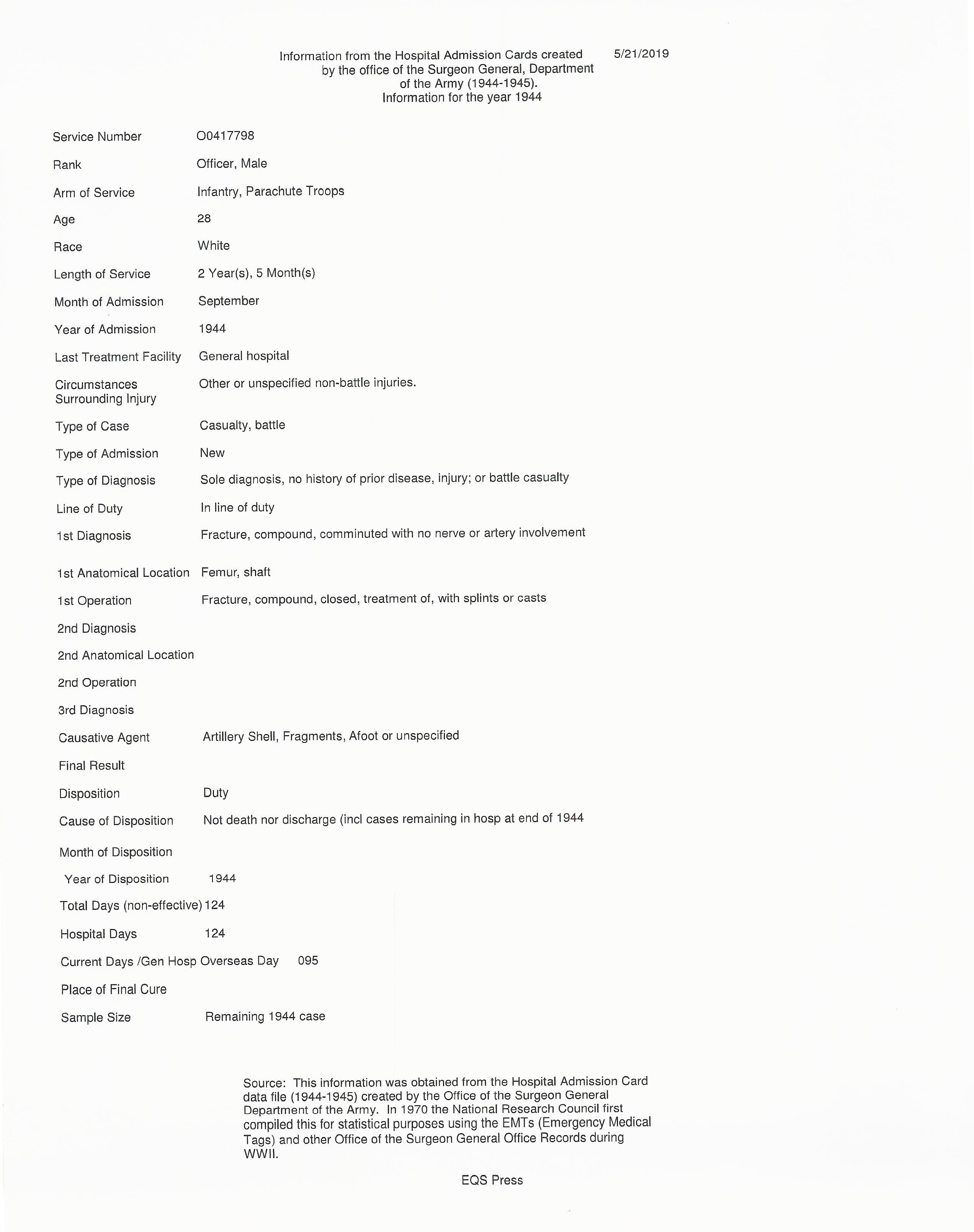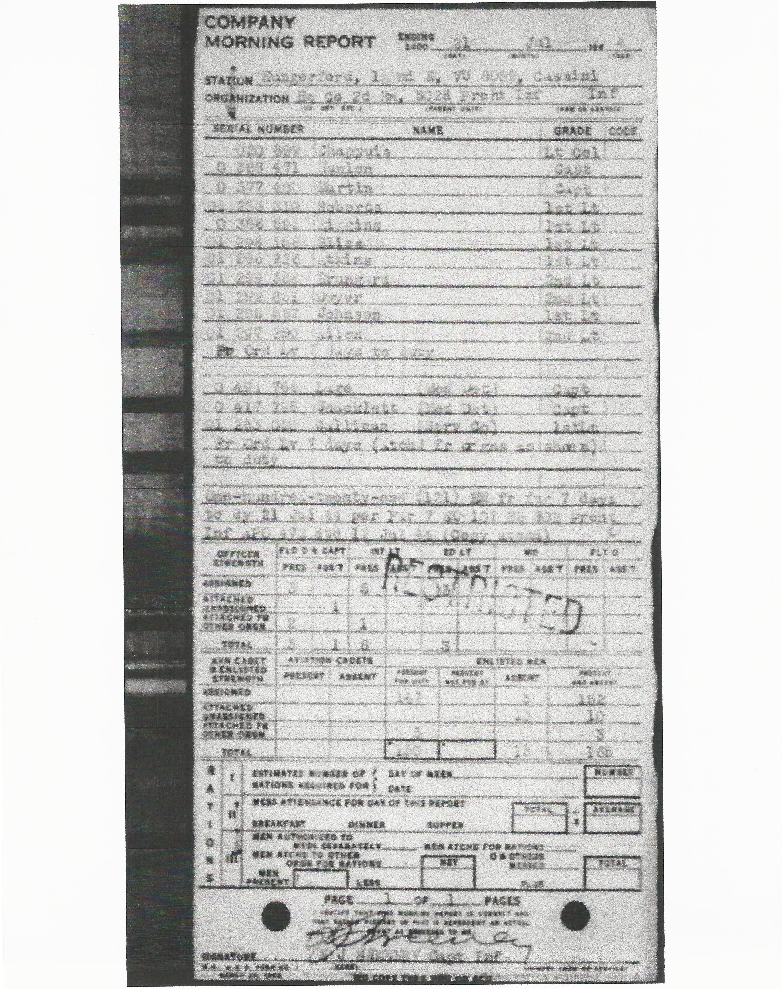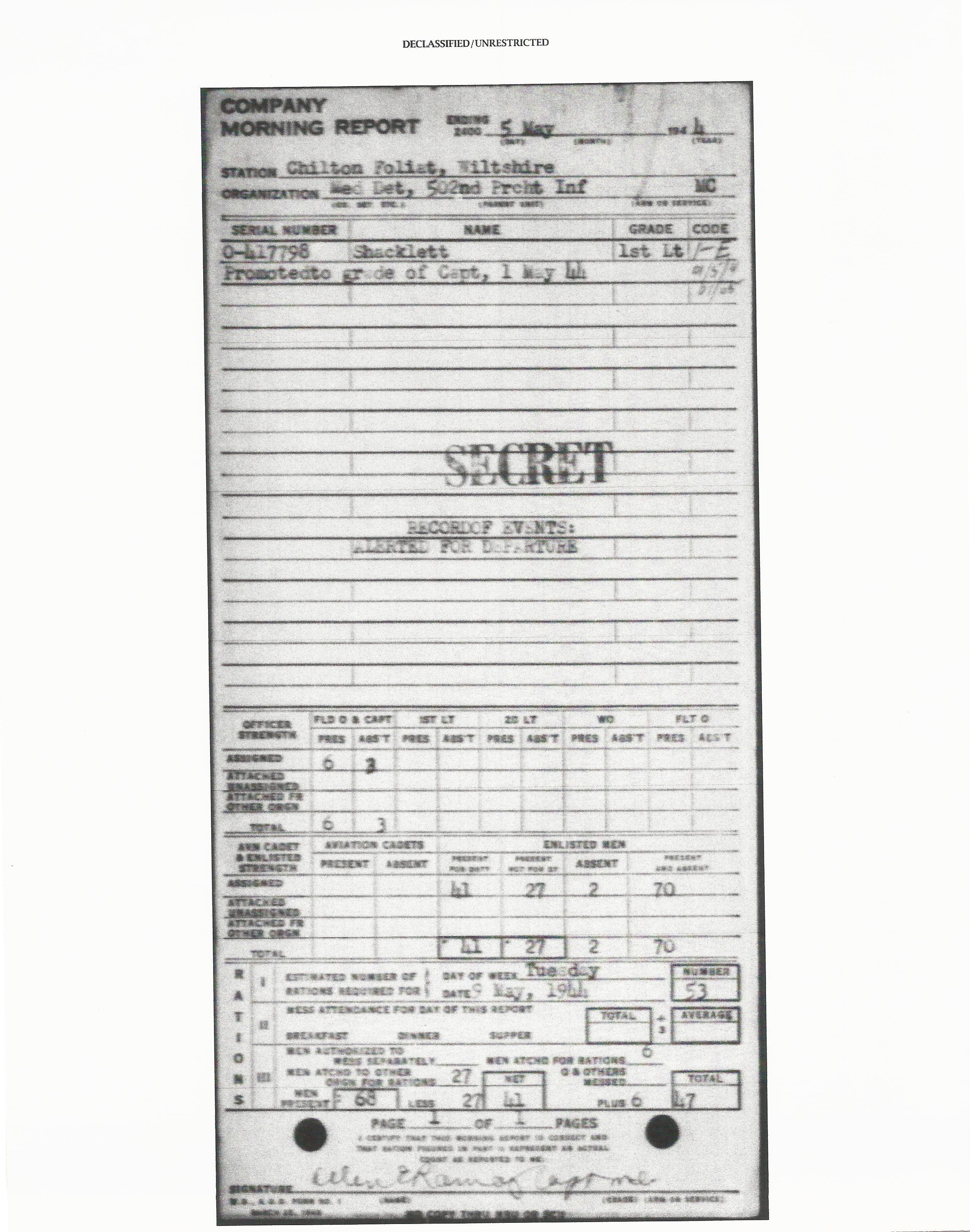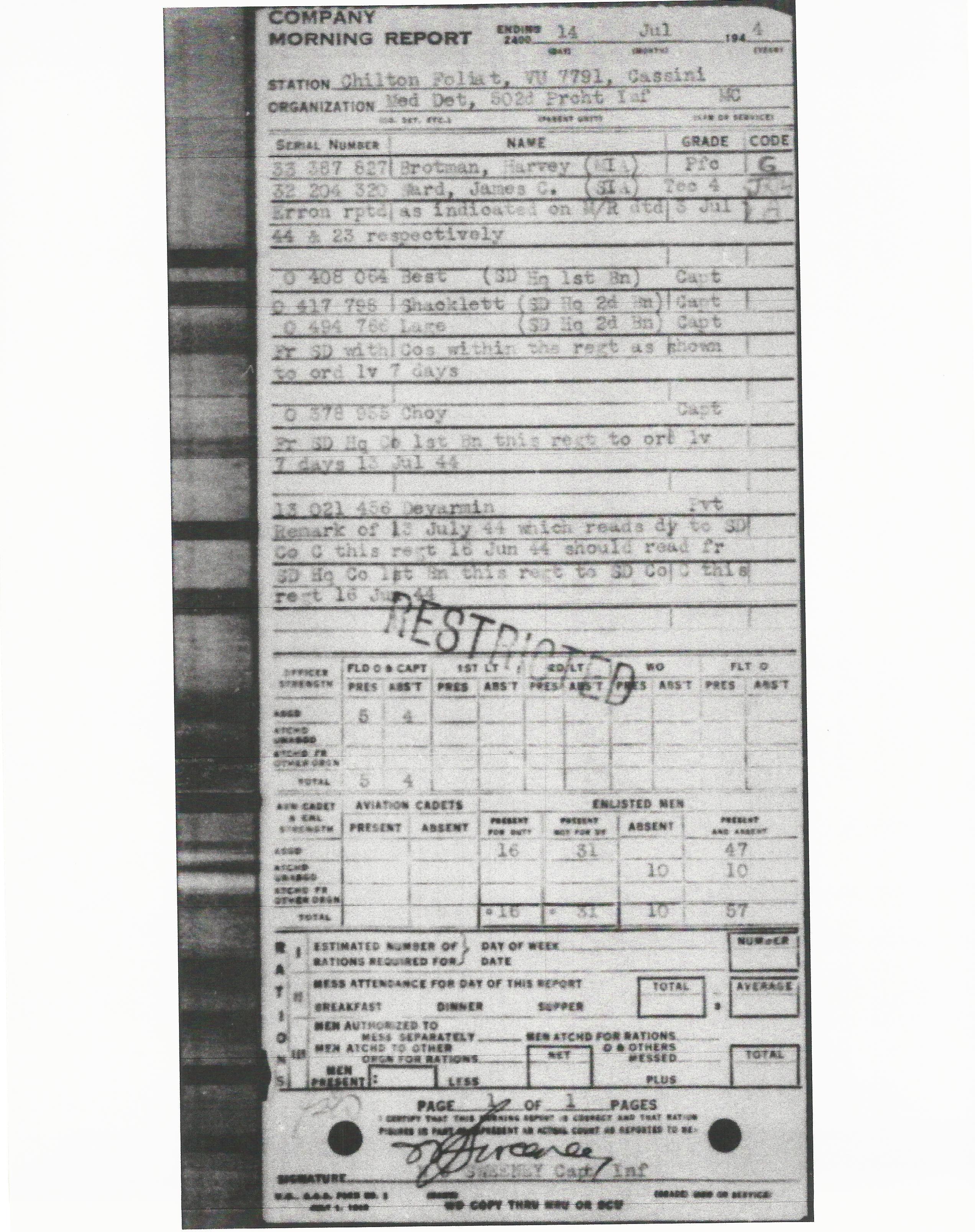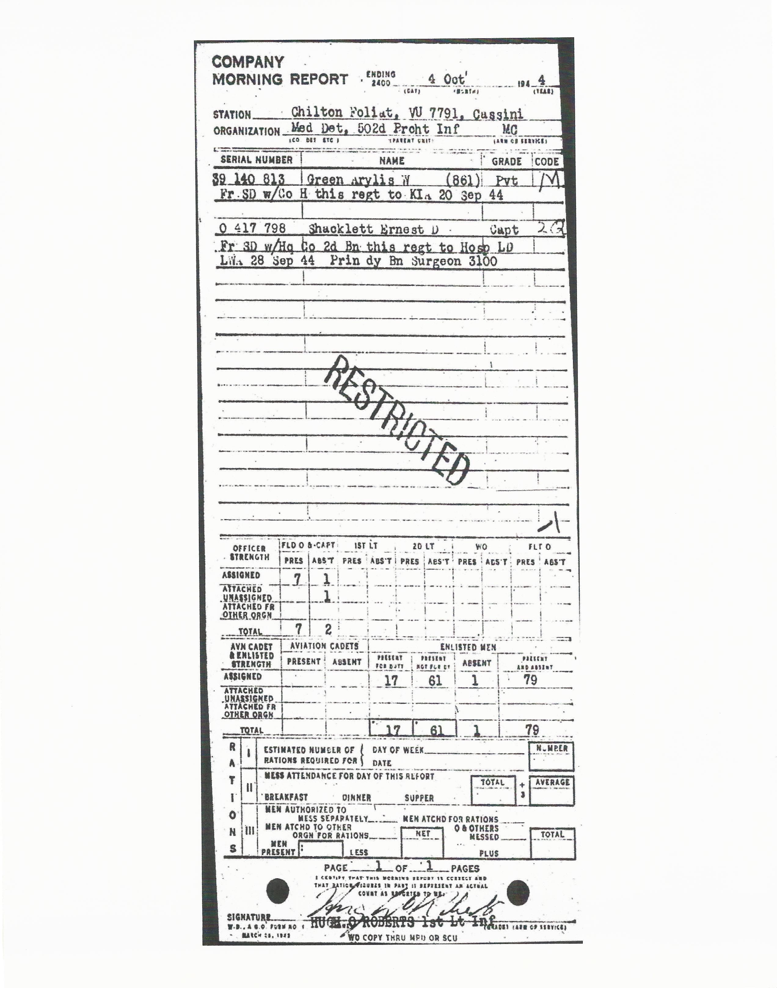 - Research binder with multiple pages of copies of original wartime documents naming Shacklett, including Company Morning Reports from July - October 1944 as well as information about his wound and hospitalization.