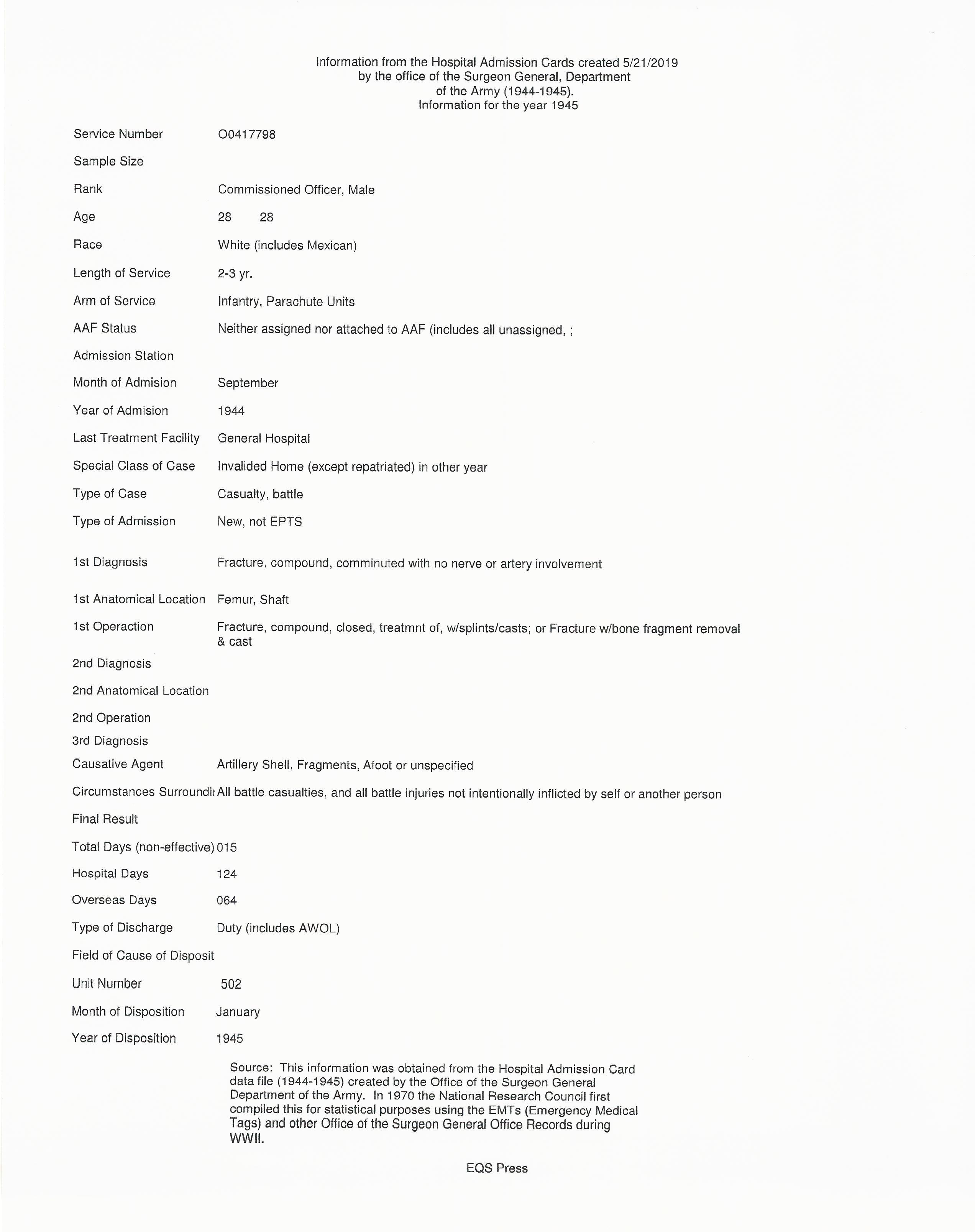 Original Items: One-of-a-kind Set. Captain Ernest D. Shacklett was a medical officer and Surgeon in the 2nd Battalion, 502nd Parachute Infantry Regiment, 101st Airborne Division. After the war Shacklett became the Director of the VA Medical Hospital in Coatsville, Pennsylvania until his death on April 27, 1979. Capt. Shacklett was with the 502nd jumping into France 6 hours prior to the D-Day invasion and was Wounded in Action (broken femur) in Belgium receiving the Purple Heart and the Bronze Star.