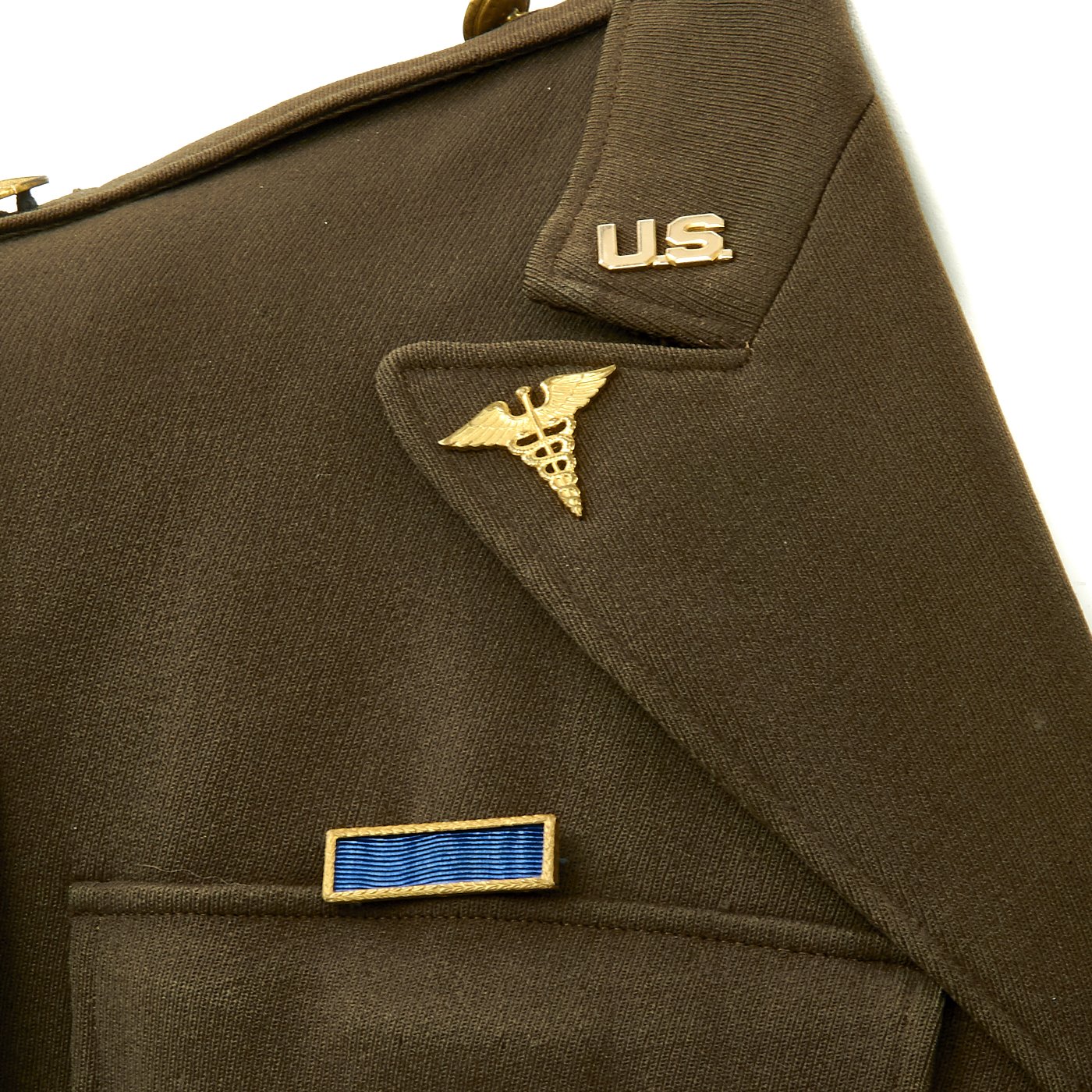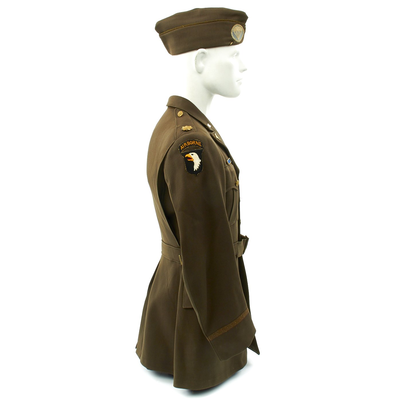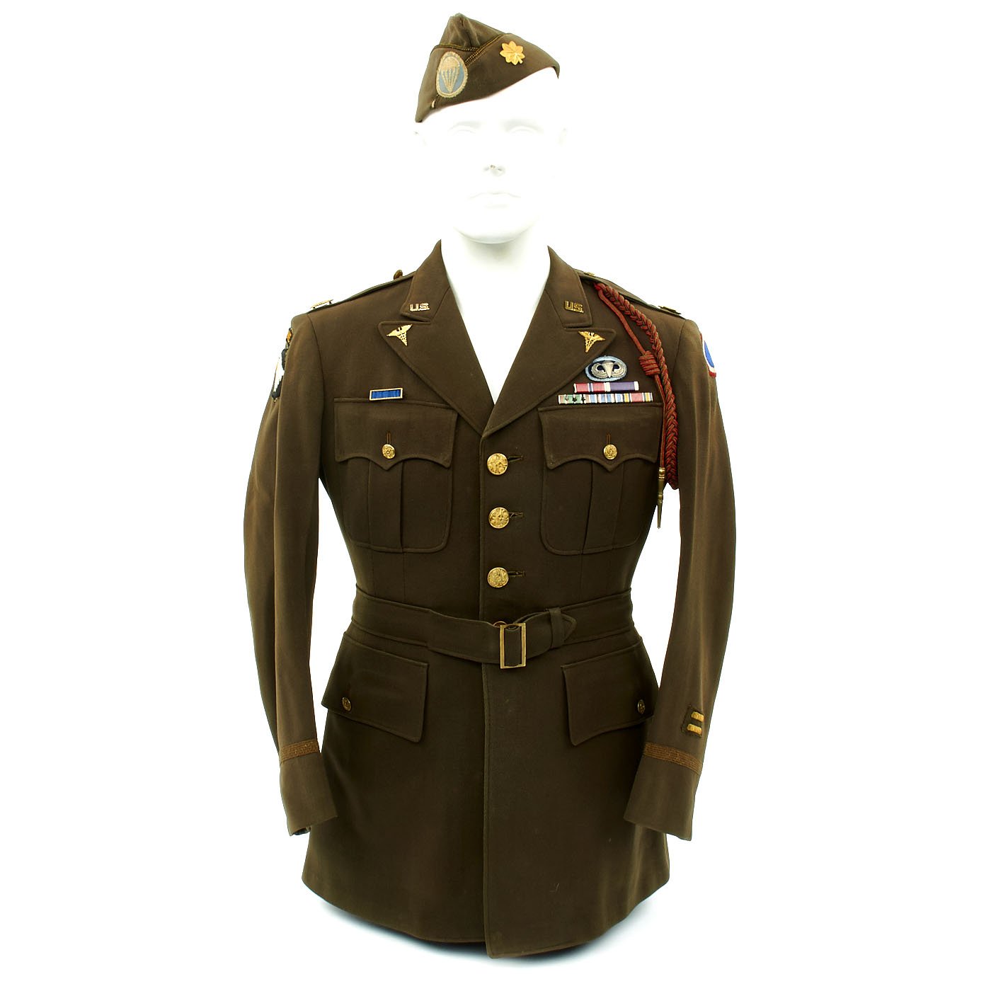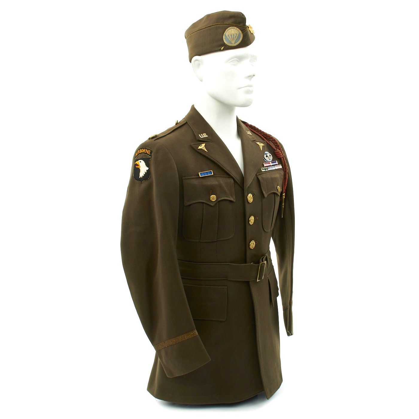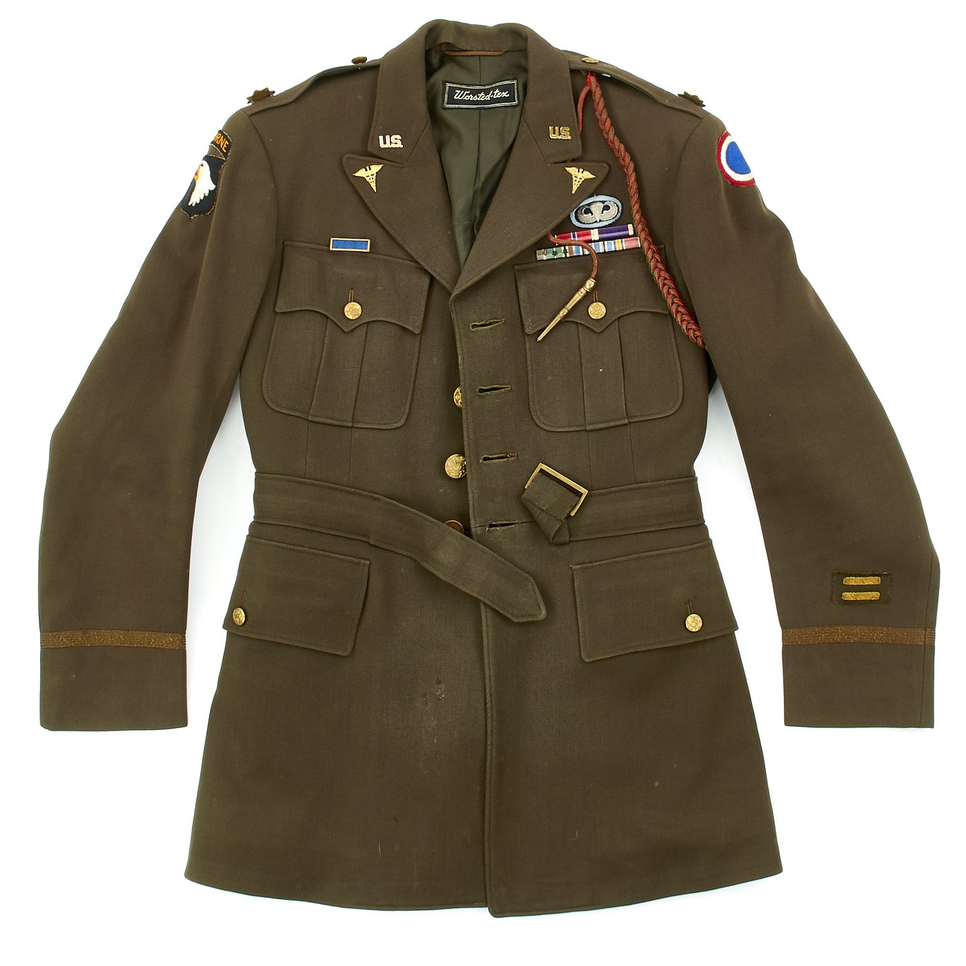 - Class A Jacket (size 38) with sterling silver paratrooper wings with 502nd PIR oval backing. Medal ribbon bar with the following awards: Bronze Star, Purple Heart, European- Africa- Middle Eastern Campaign Medal with Invasion Arrow Head (D-Day Jump) and 2 battle stars, American Campaign Medal, WWII Victory Medal. Presidential unit citation, Belgian Red and Green Fourragère shoulder cord, 101st airborne patch on right shoulder. Medical officer collar tabs and Captain oak leaves on each epaulet. Two overseas service bars on left sleeve indicating 12+ months of overseas service. Interior armpit is named in ink to Shacklett.