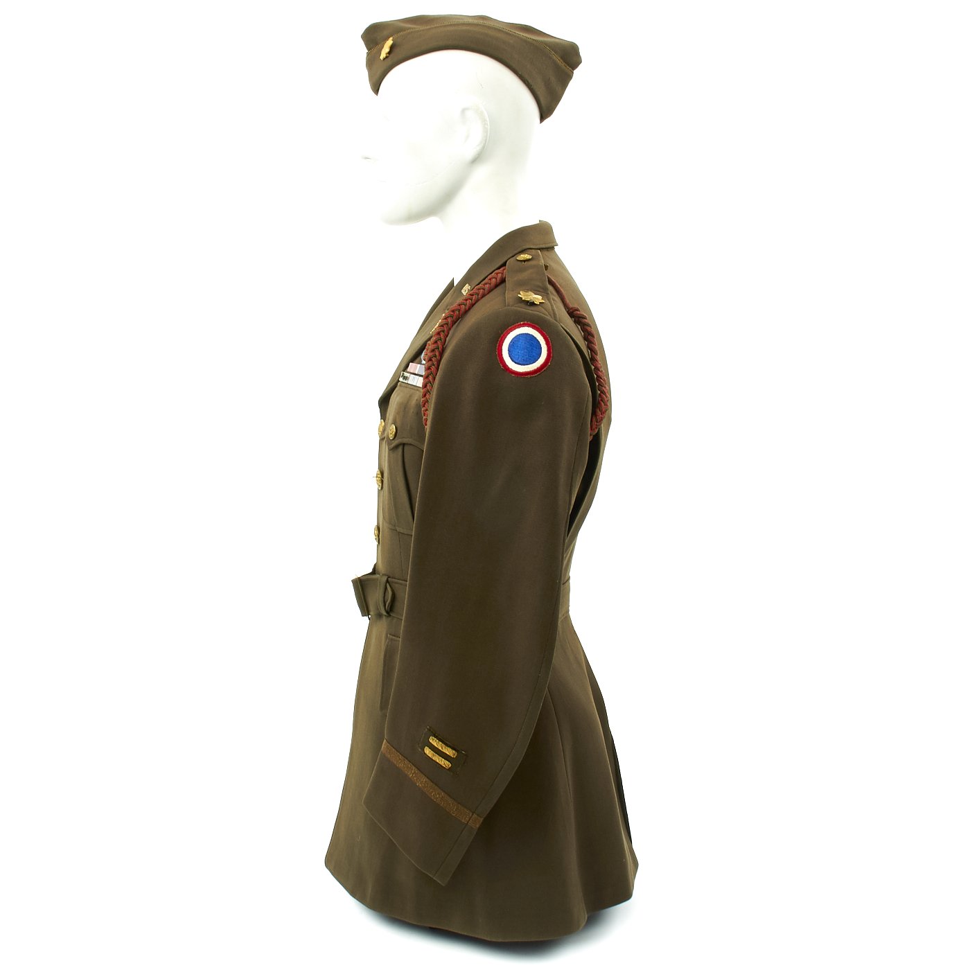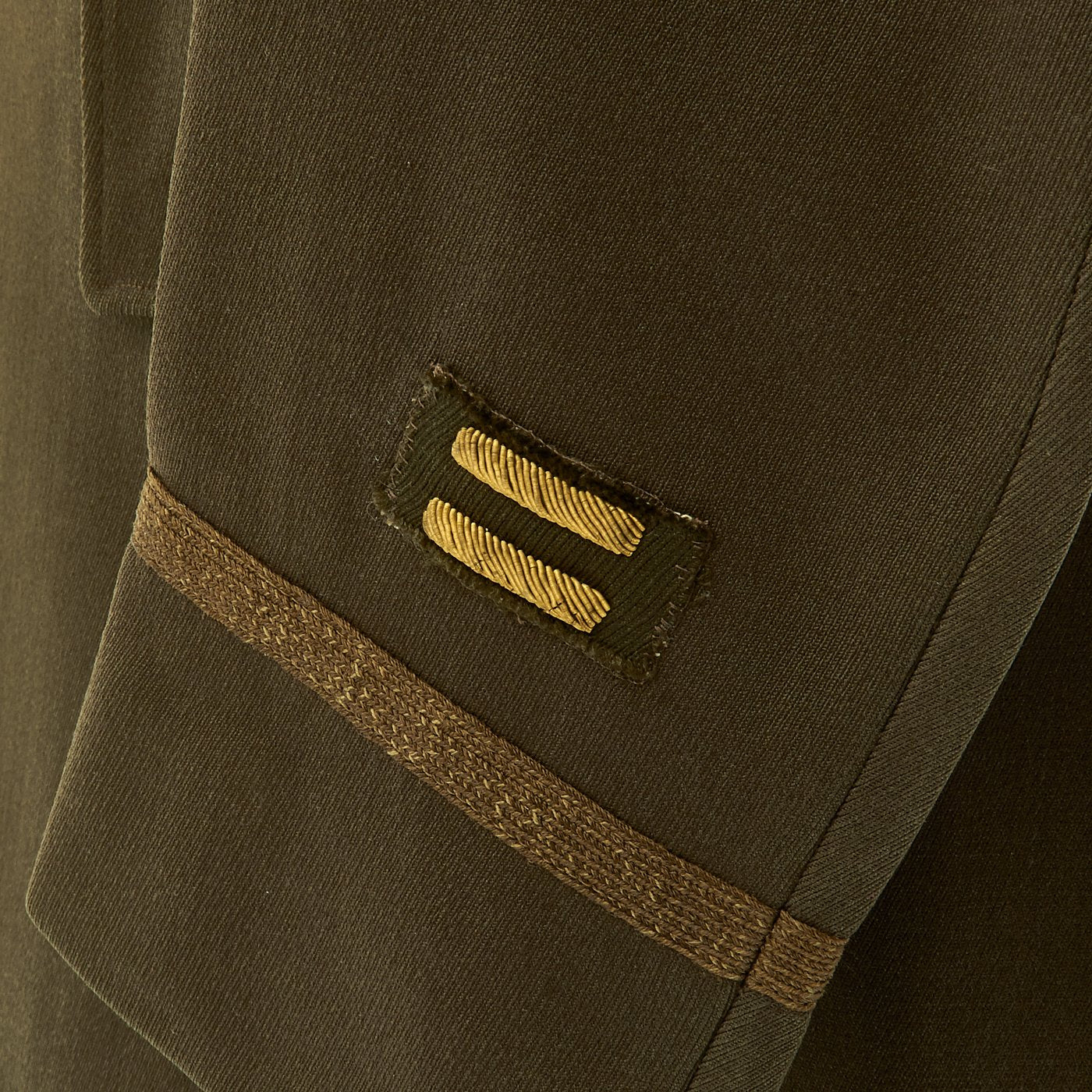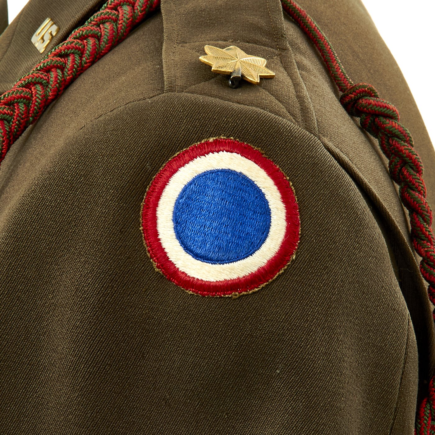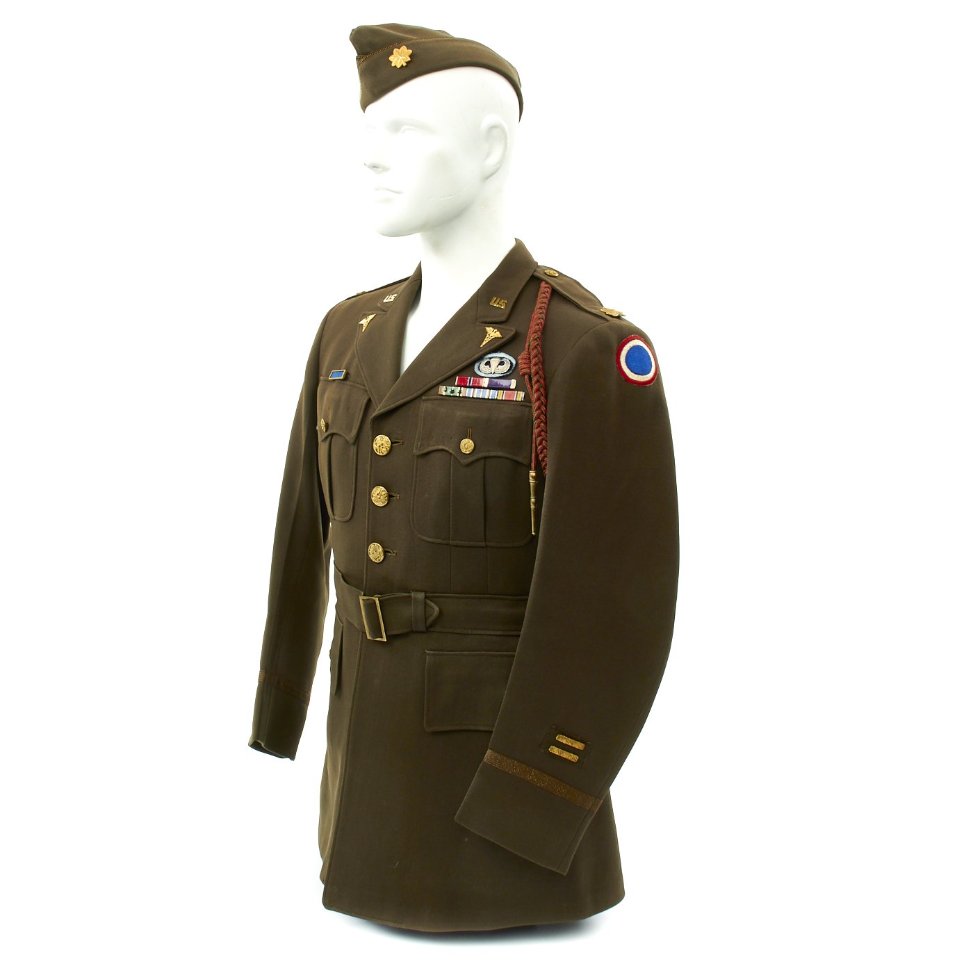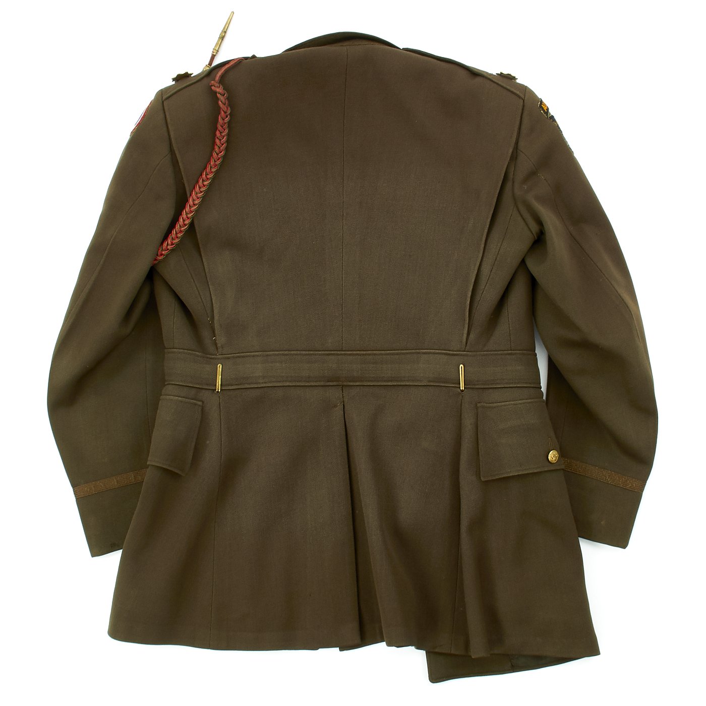 - Class A Jacket (size 38) with sterling silver paratrooper wings with 502nd PIR oval backing. Medal ribbon bar with the following awards: Bronze Star, Purple Heart, European- Africa- Middle Eastern Campaign Medal with Invasion Arrow Head (D-Day Jump) and 2 battle stars, American Campaign Medal, WWII Victory Medal. Presidential unit citation, Belgian Red and Green Fourragère shoulder cord, 101st airborne patch on right shoulder. Medical officer collar tabs and Captain oak leaves on each epaulet. Two overseas service bars on left sleeve indicating 12+ months of overseas service. Interior armpit is named in ink to Shacklett.