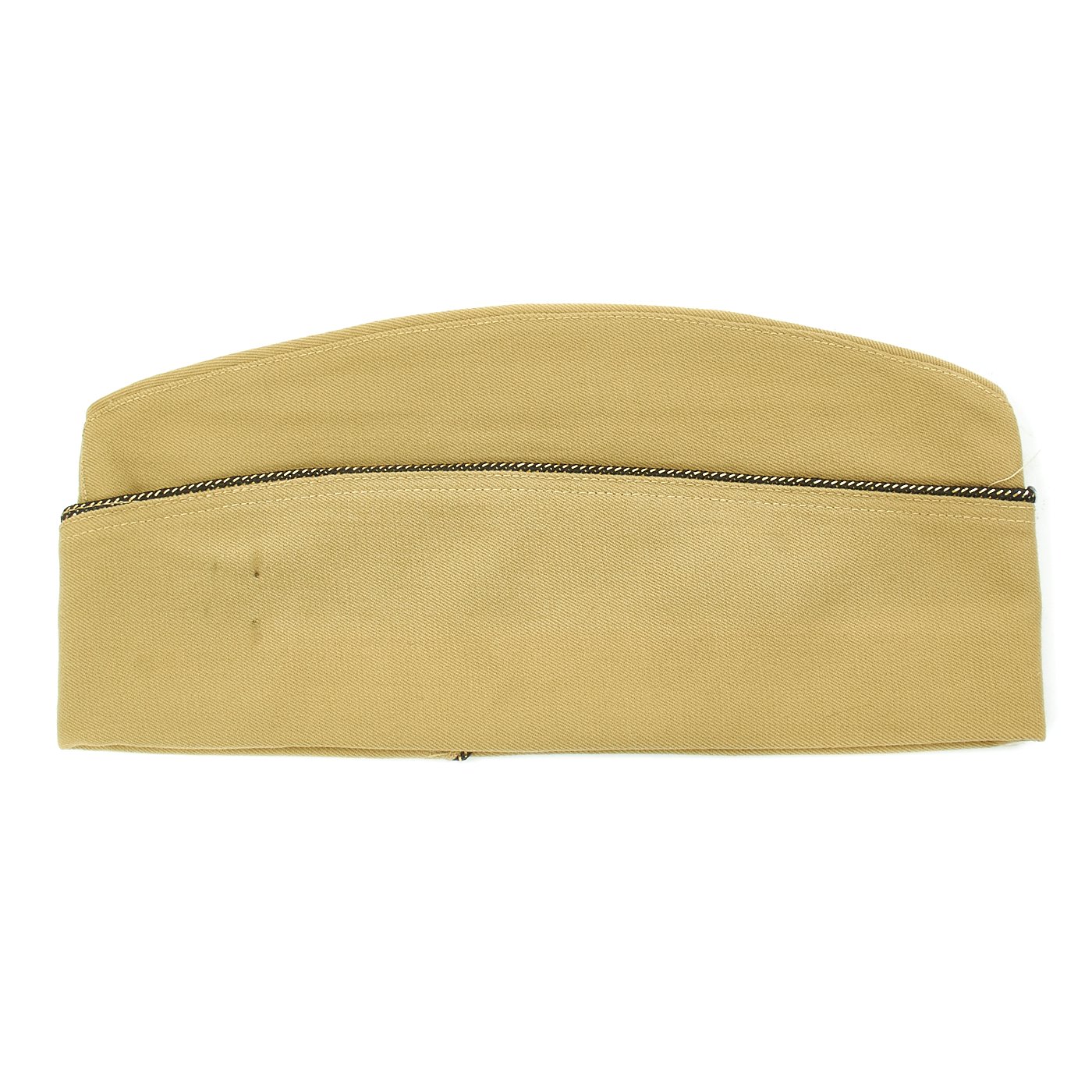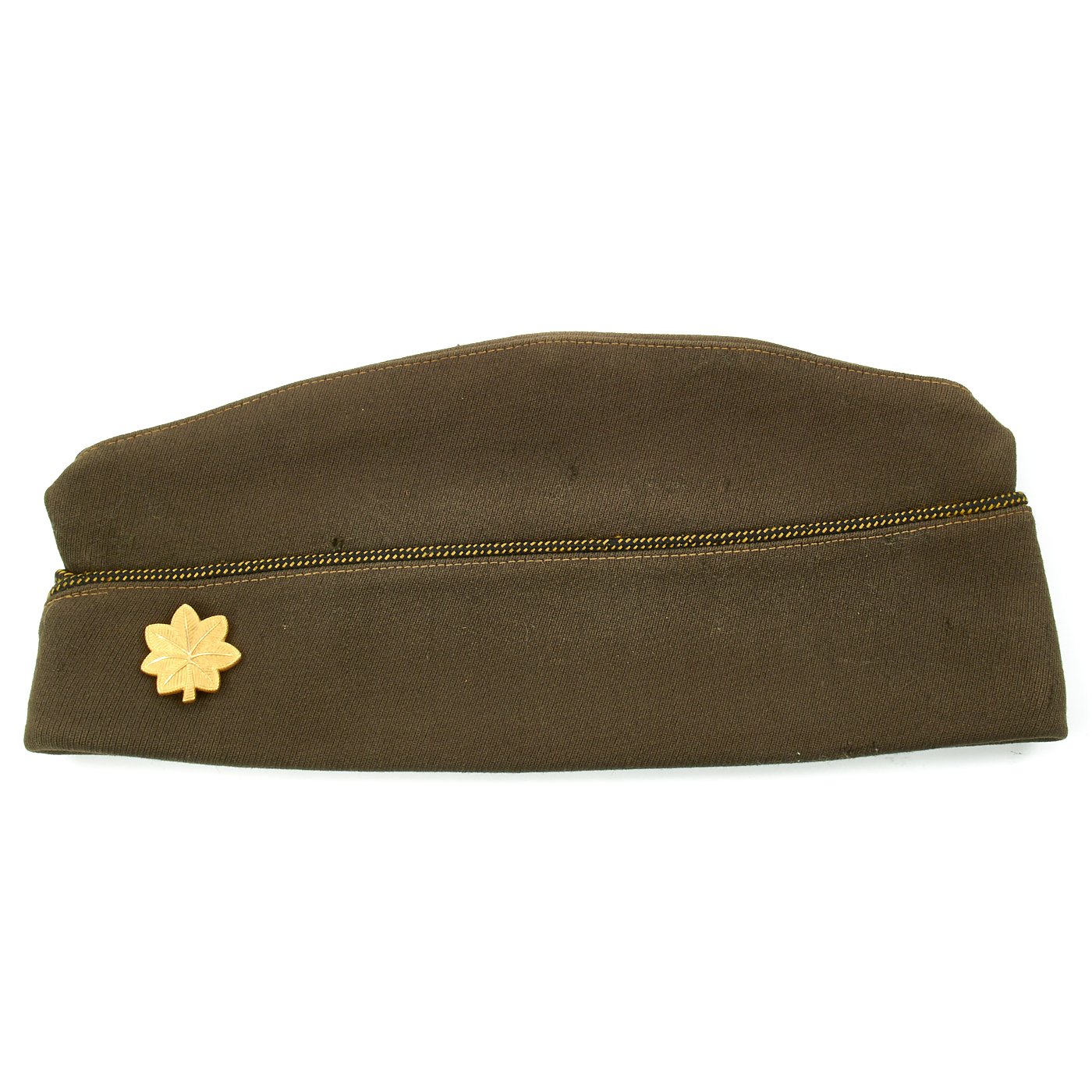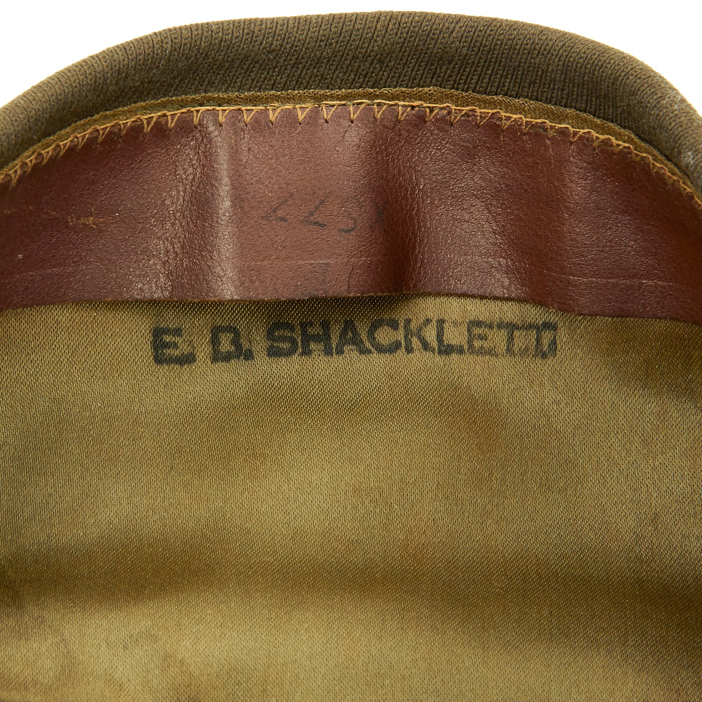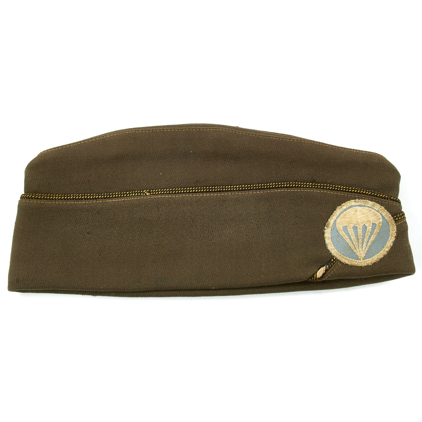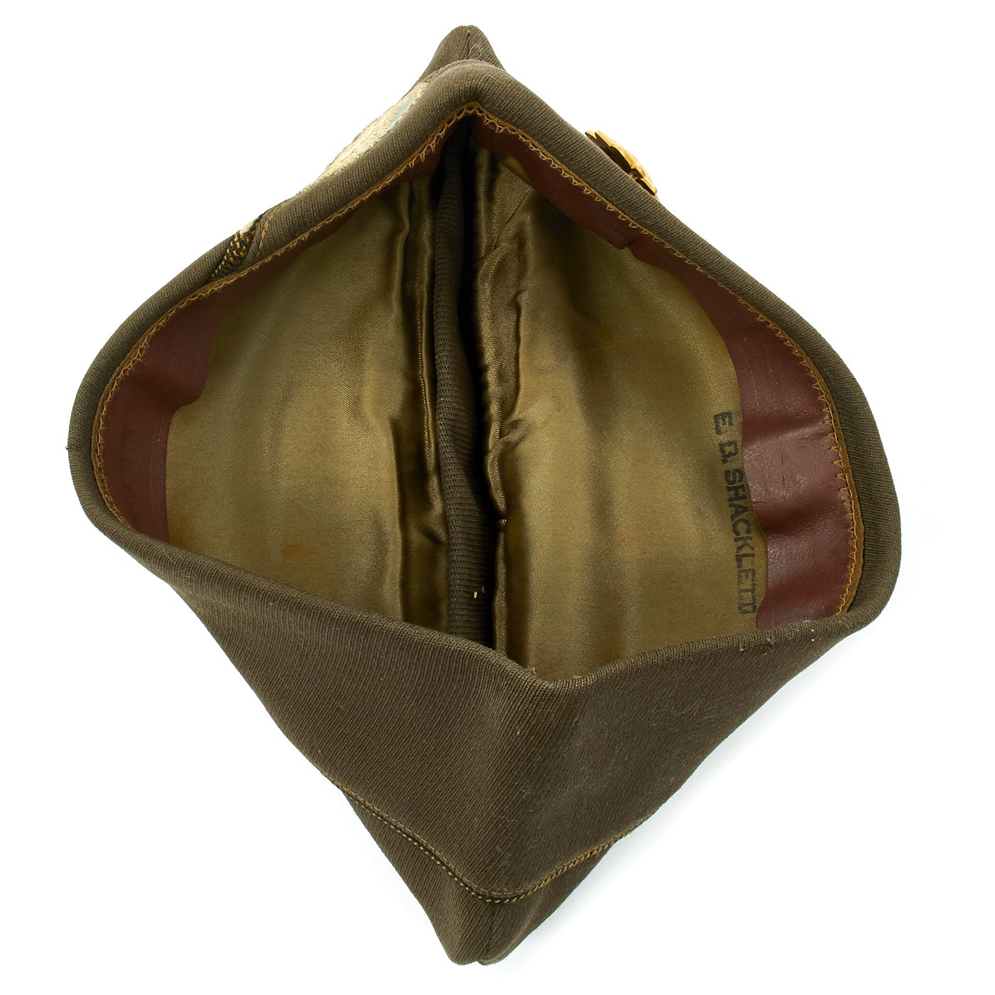 - Officer overseas garrison cap in olive green with Captain oak leaf and early war Paratrooper patch, interior is ink stamped E.D. Shacklett.