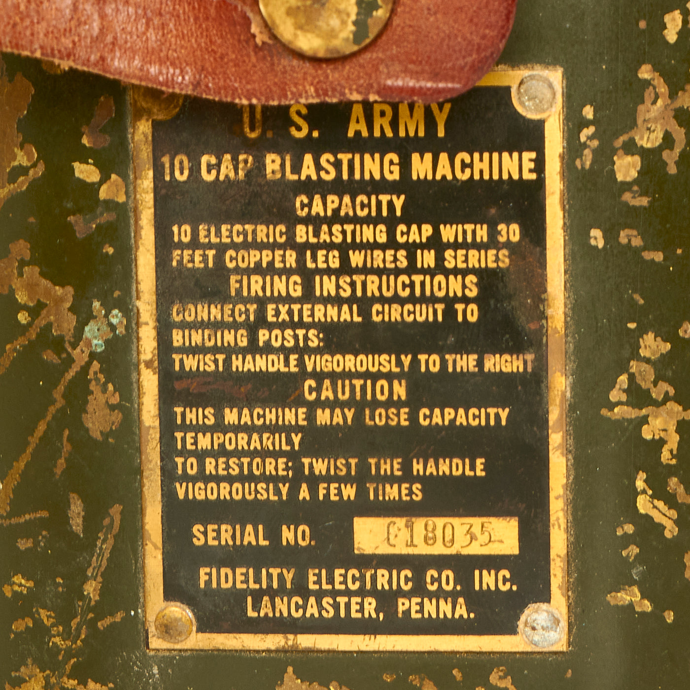 Original Item: Only One Available. This is an original WWII U.S. Army 10 Cap Blasting Machine, complete with the original handle. These were used by demolition crews on D-day to destroy the many obstacles on French beaches that had been set up during years of German occupation. This particular example has a brass lower housing, with a lid that appears to be zinc or aluminum, with a data plate on the side with information and instructions. The Data plate reads: