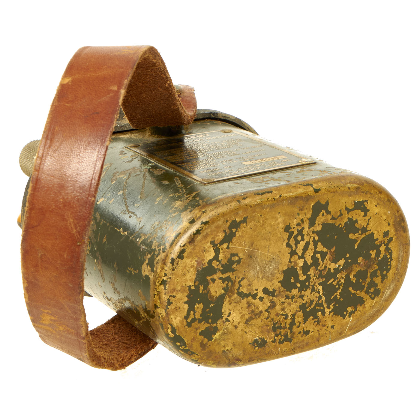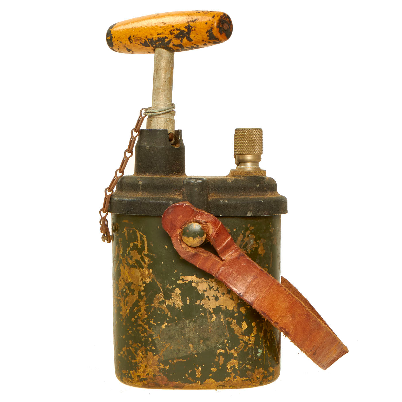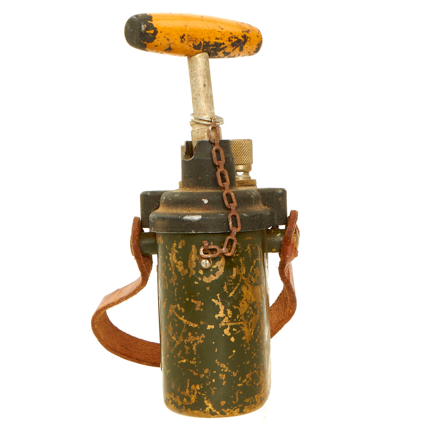 The Blasting Machine comes complete with the original twist handle, still attached by a chain. The handle itself is wood, so it unfortunately has suffered paint loss with minor cracking, but is complete. Attached is the original leather carry strap also in wonderful condition.
