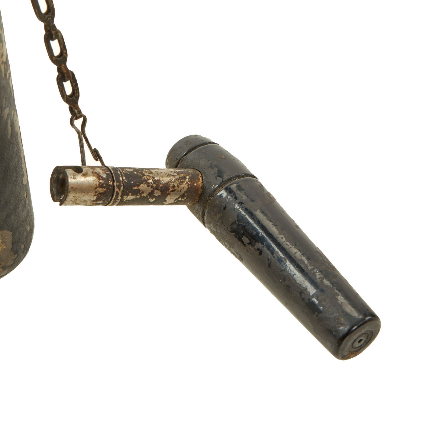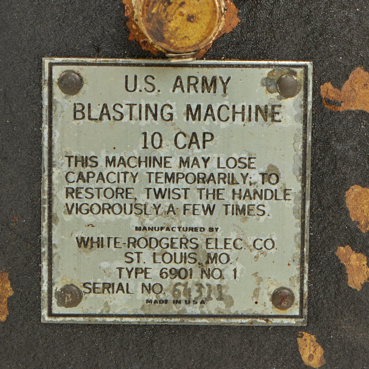 Original Item: Only One Available. This is an original WWII U.S. Army 10 Cap Blasting Machine, complete with the original handle. These were used by demolition crews on D-day to destroy the many obstacles on French beaches that had been set up during years of German occupation. This particular example has a brass lower housing, with a lid that appears to be zinc or aluminum, with a data plate on the side with information and instructions. The Data plate reads: