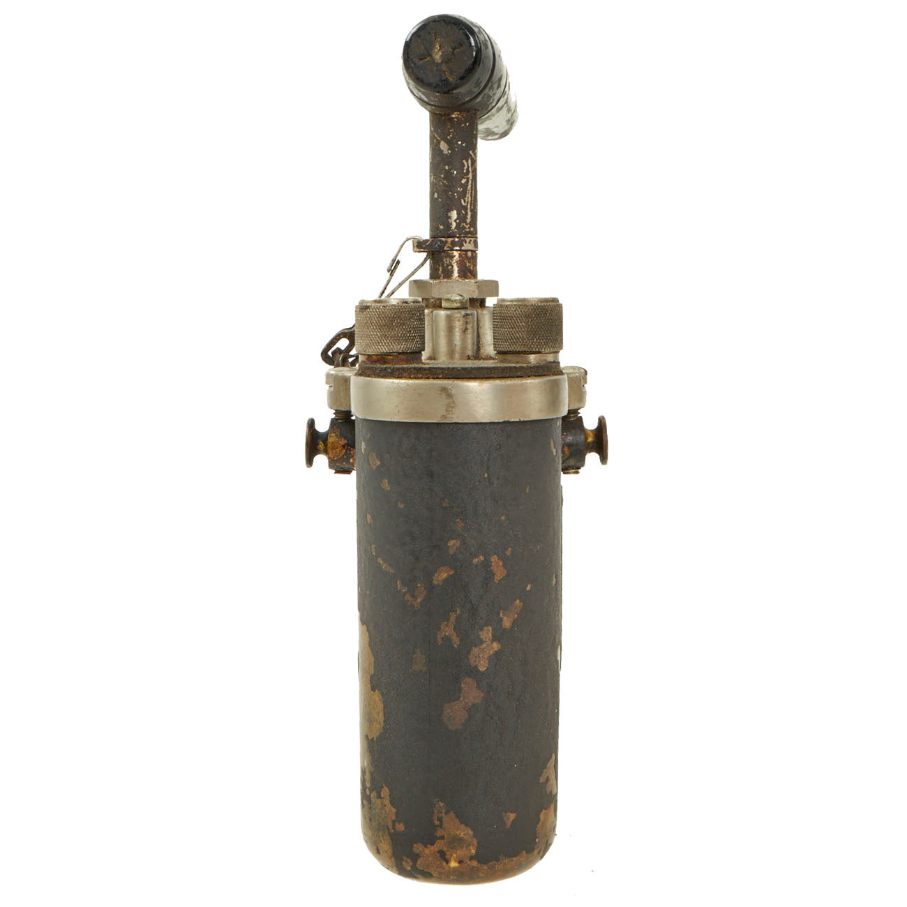 The Blasting Machine comes complete with the original twist handle, still attached by a chain and complete, without damage. Unfortunately, the leather carry handle/cover is missing, though the two mounting buttons are still attached.