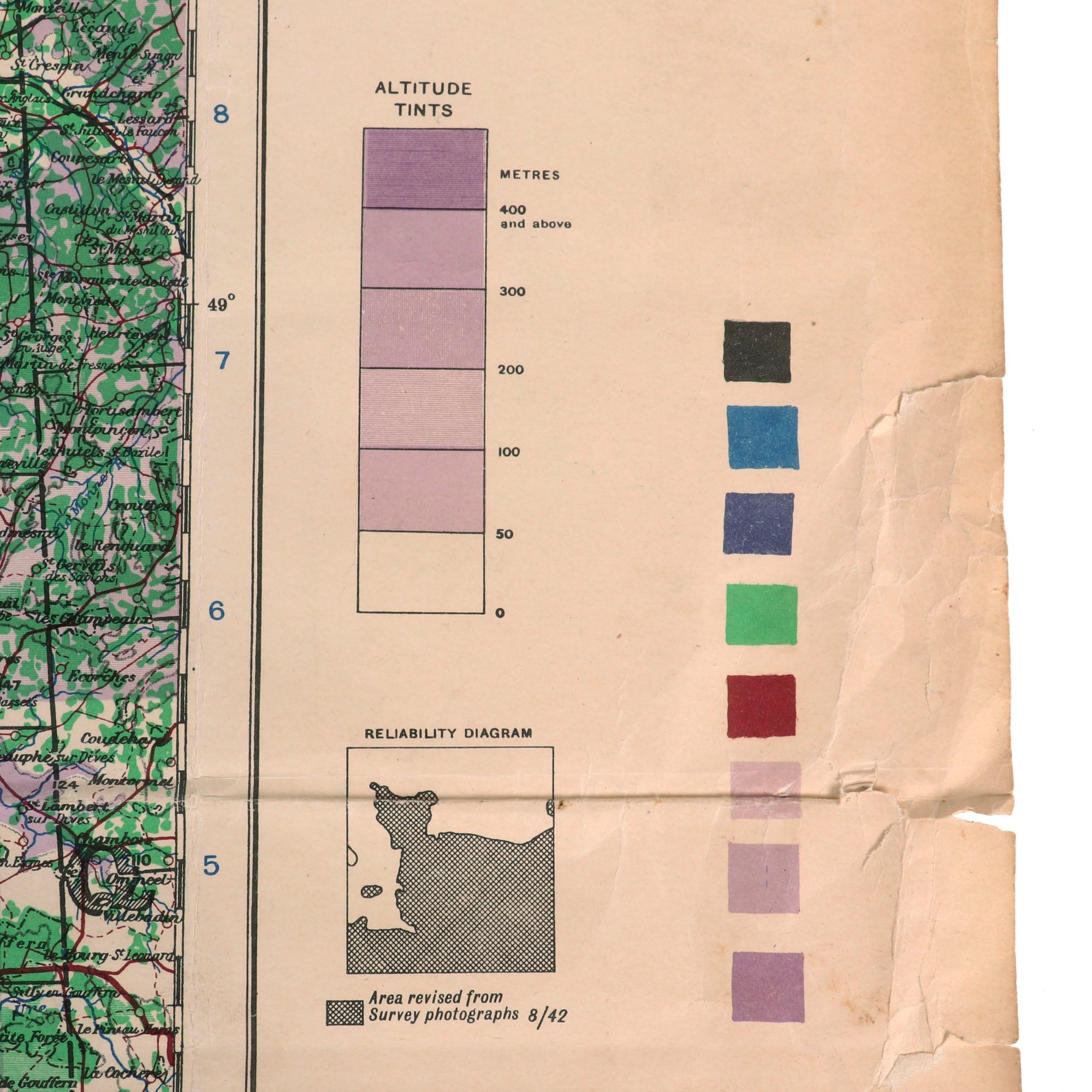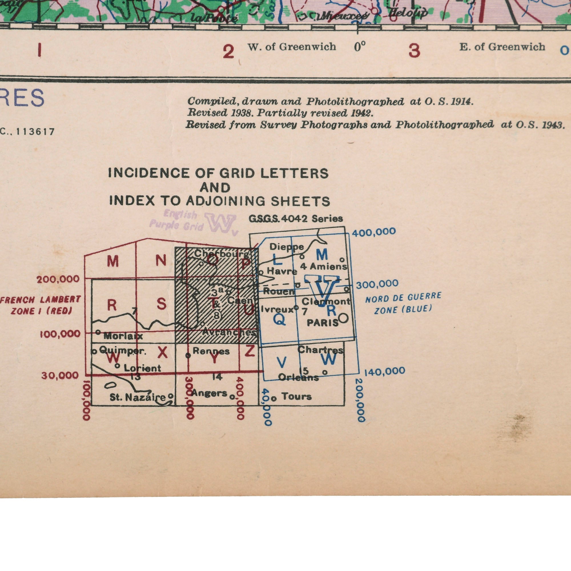 This is an extremely rare full color single side paper map of Normandy issued to the Army / Air for use during the D-Day planning and the invasion of Normandy. Map shows the locations of known trig (triangulation) points throughout Normandy including Omaha and Utah beaches as well as some of the most famous towns and locations during the battle. This map is featured in the permanent collection of the of the D-Day Story exhibit of the Portsmouth Museum and can be found on their website at this link.