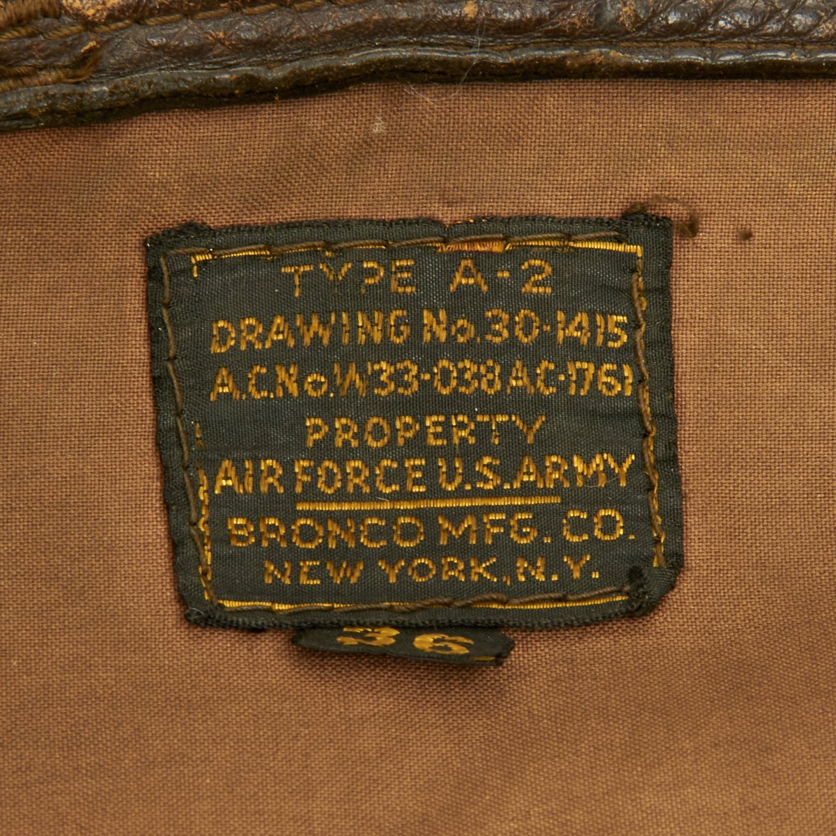 The jacket is a size 36 and still retains the original nomenclature tag from BRONCO MFG. New York, N.Y.