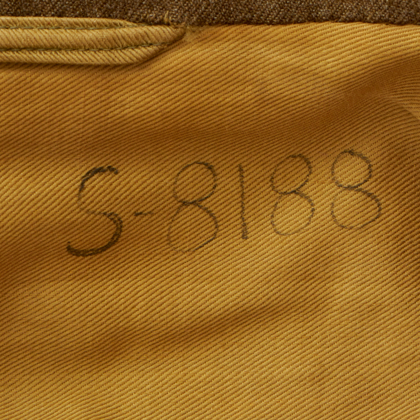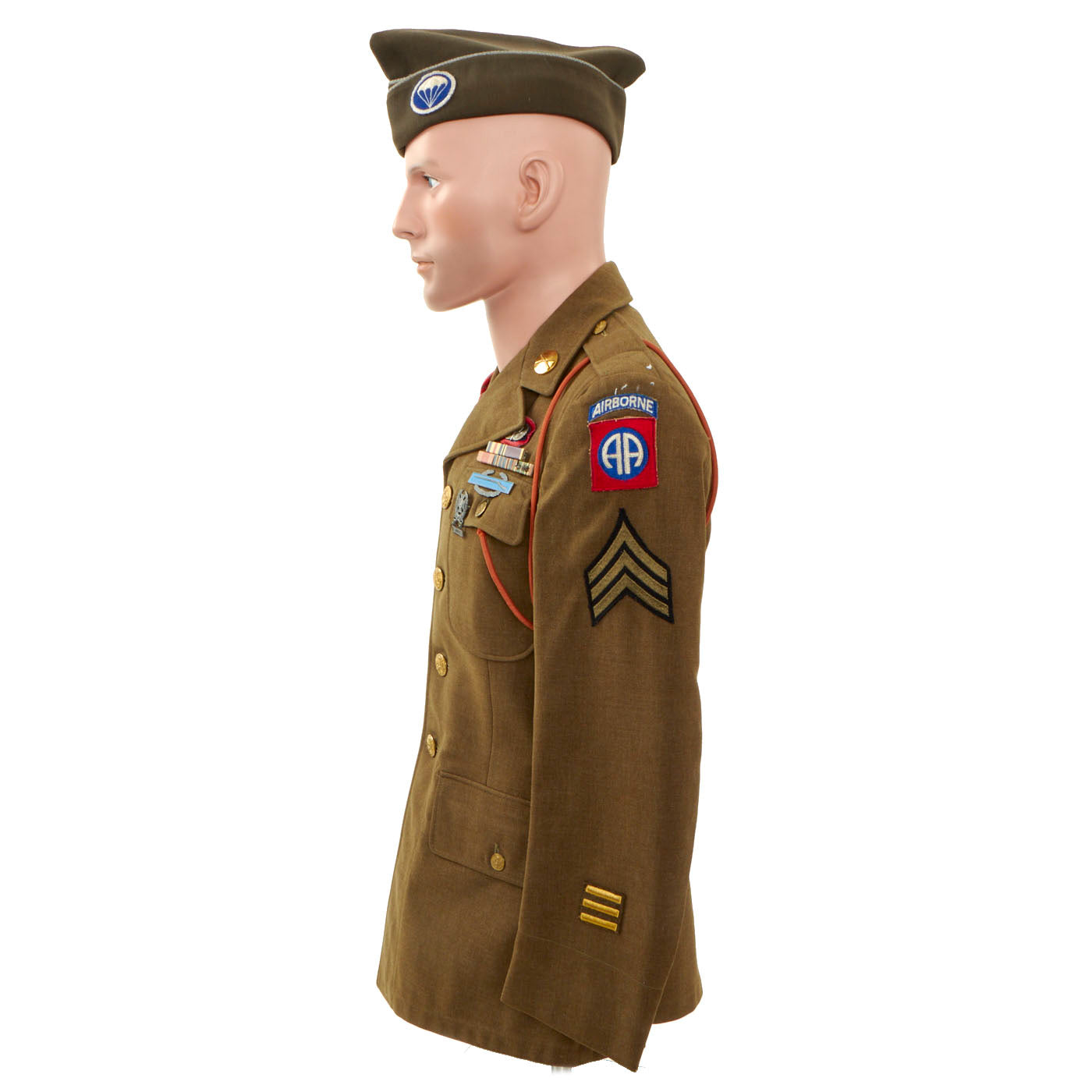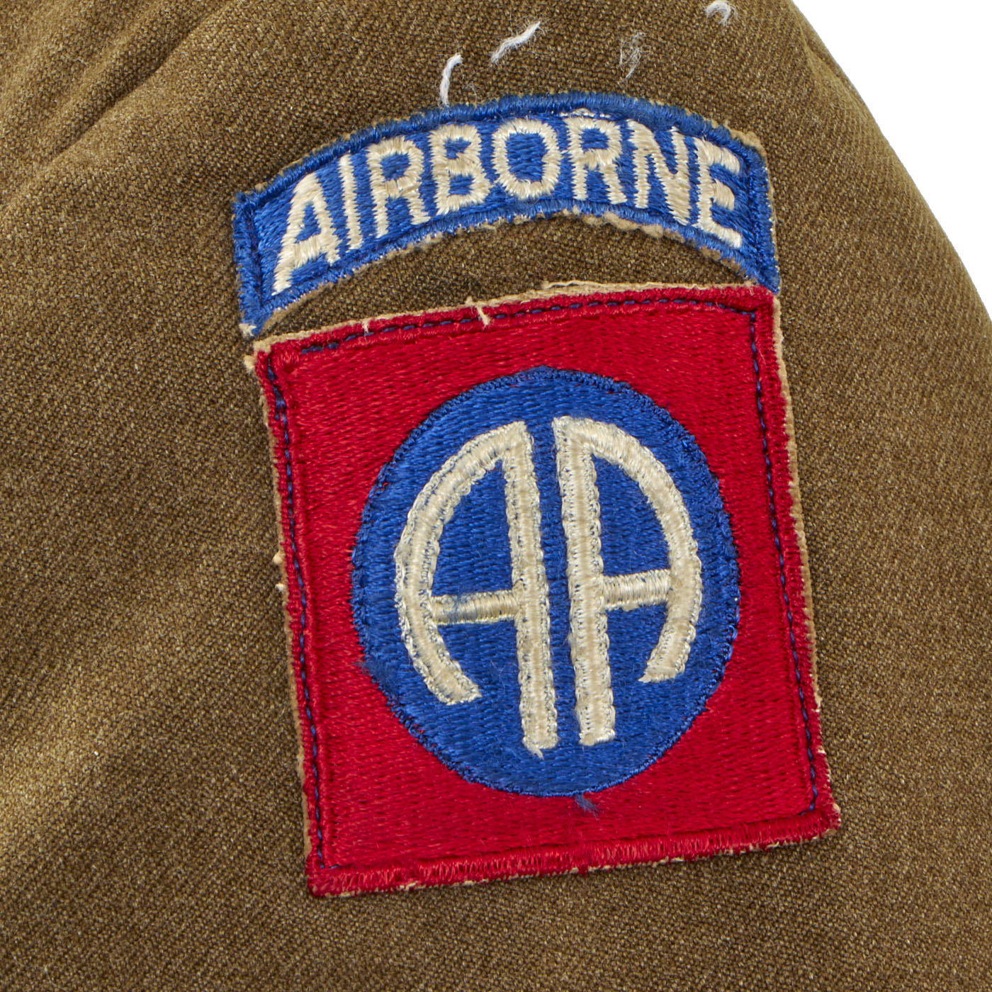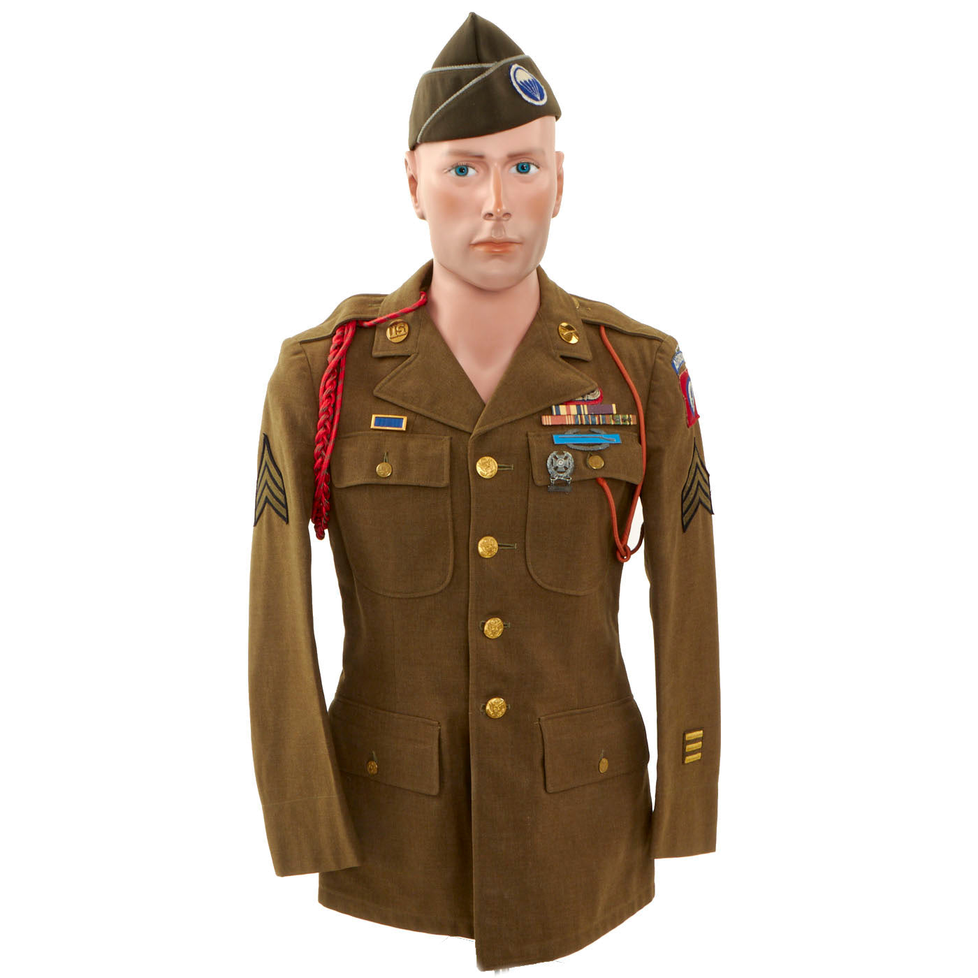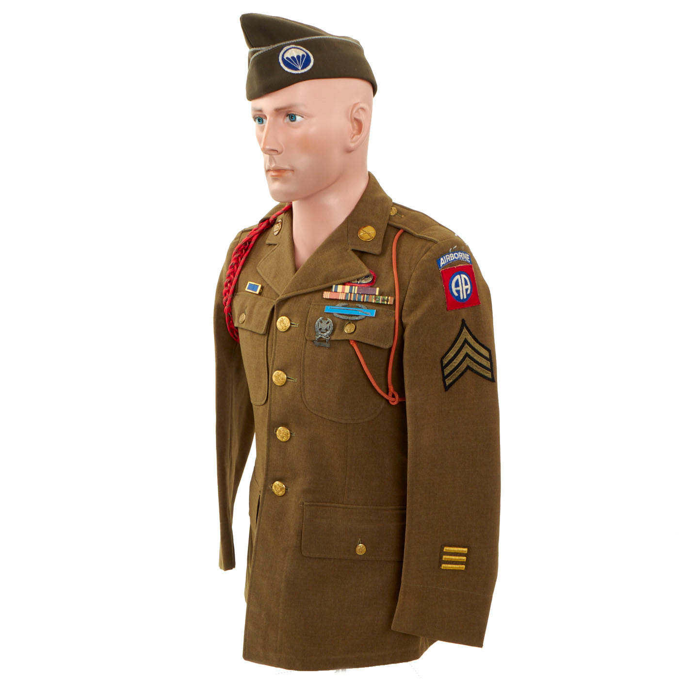 - Size 35R Class A Service Coat: Coat features beautiful personal marking on the inside liner with his laundry number (S-8188). Jacket also features a clean, crisp 82 AB patch on left shoulder as well as Sergeant chevrons on both sleeves and 3 overseas stripes on the lower left sleeve denoting 18 months of overseas service. On the left breast there is a beautiful blue with red trim backed jump wings beneath it a ribbon bar consisting of a Silver Star, Purple Heart, Good Conduct, American Campaign and an EAME with 3 bronze stars and a bronze arrowhead. Beneath the ribbon bar is a Combat Infantry Badge and a Rifle Marksmanship badge. On the right breast, just above the pocket is a Presidential Unit Citation. On the right shoulder is the "Belgian Fourragère 1940"- composed of one round smooth cord, partially braided, and of TWO other cords, of which one is terminated by a knot and a brass ferret - it is made of wool and cotton for NCOs and EM, and of silk for Officers - all threads are tinted in colors resembling the ribbon of the Belgian Croix de Guerre 1940 (i.e. basic red, dotted with green threads) - the Fourragère encircles the right shoulder and passes under the armpit, and is fixed by 2 tiny loops onto the button of the shoulder loop. On the left shoulder is the "Order of the Orange" shoulder cord awarded by the Dutch government for surviving Operation Market Garden.