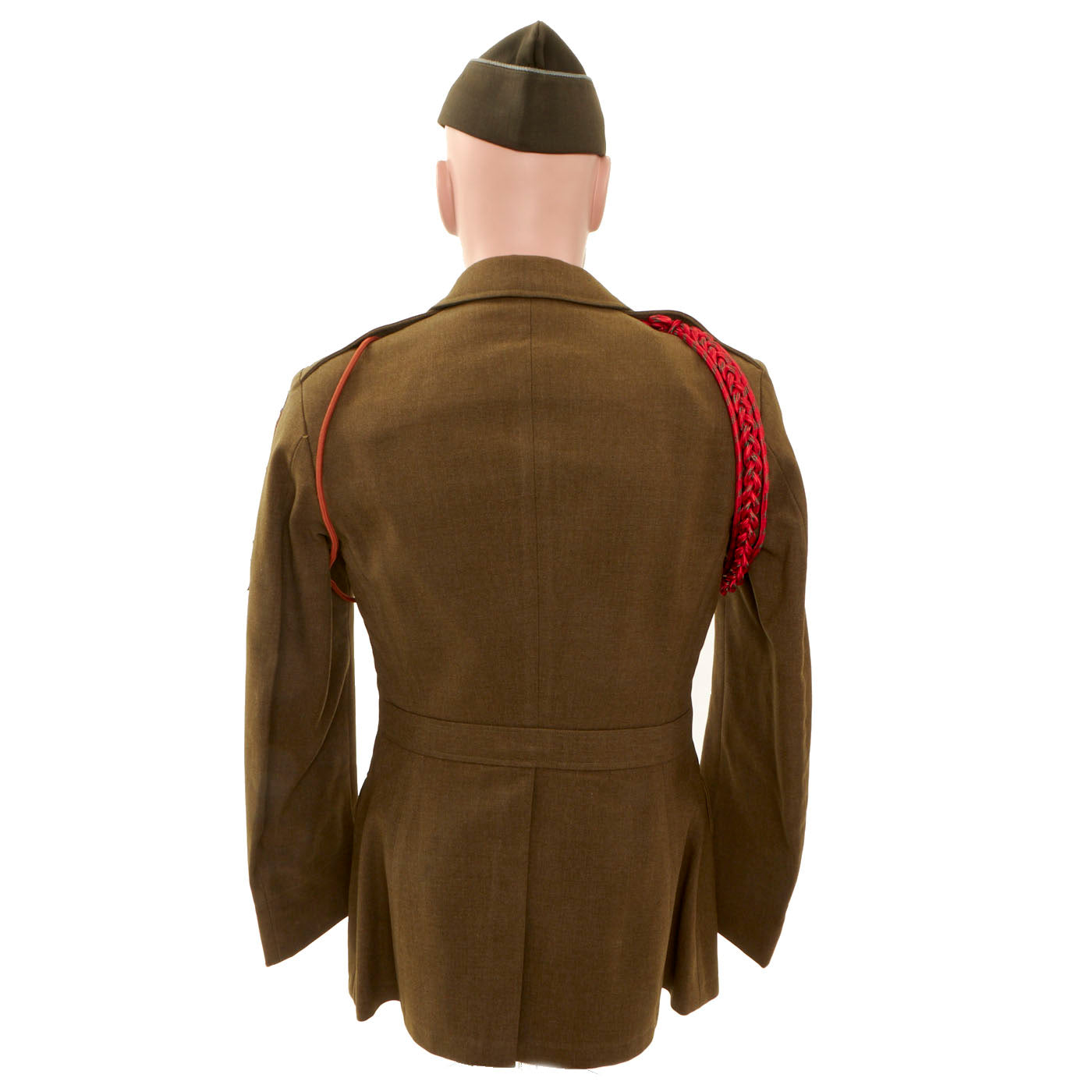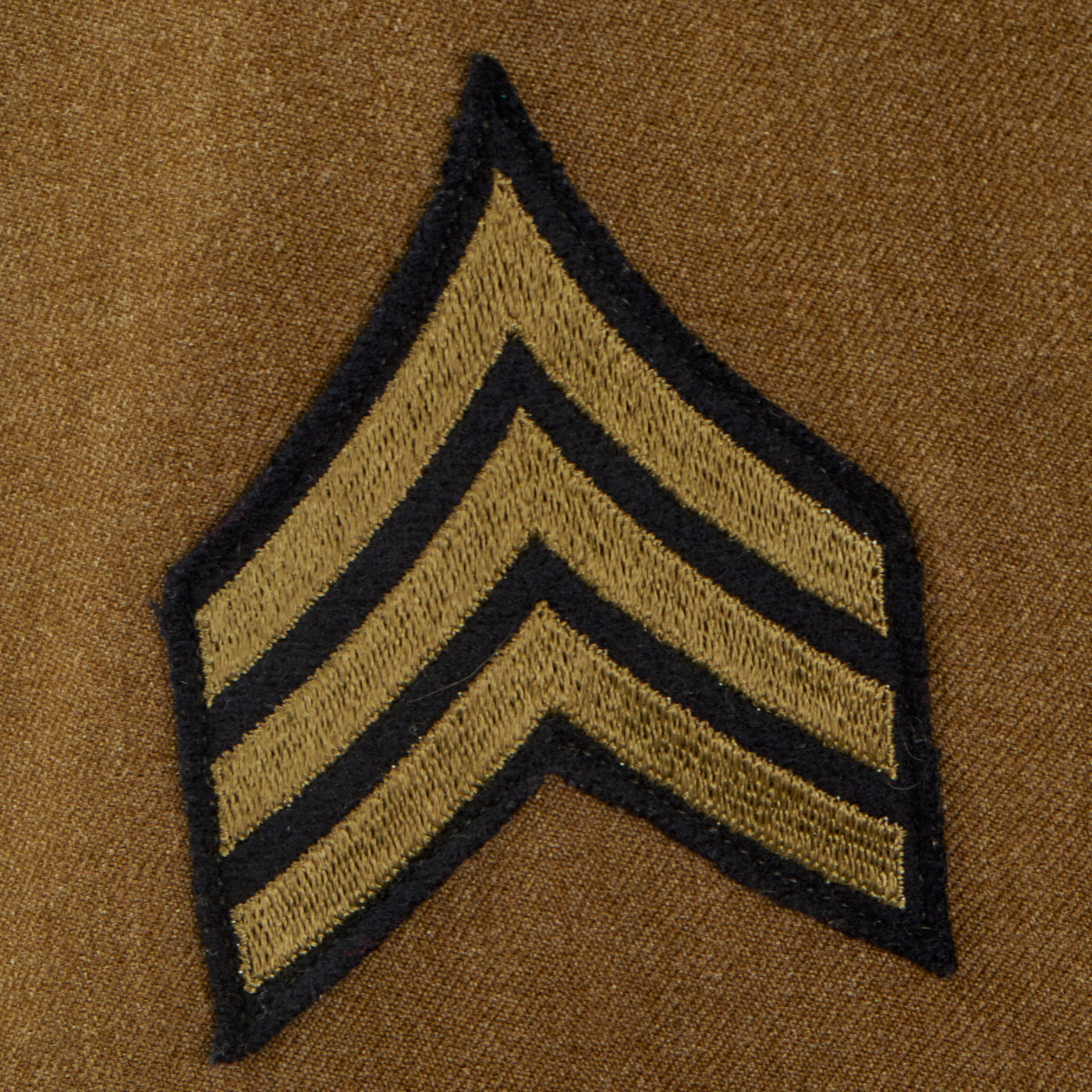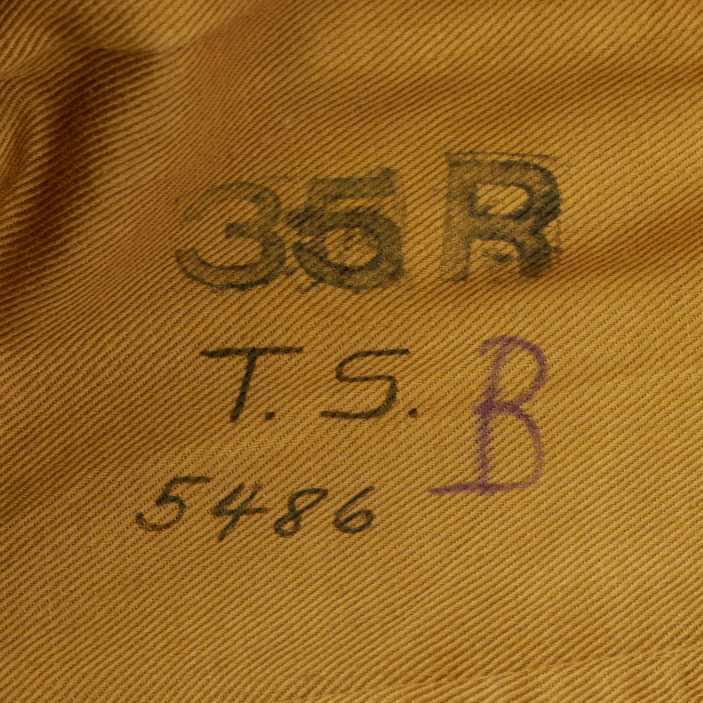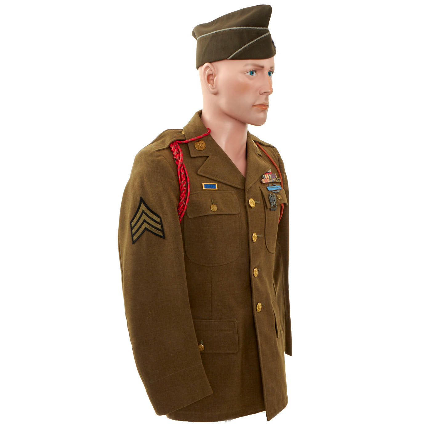 - Size 35R Class A Service Coat: Coat features beautiful personal marking on the inside liner with his laundry number (S-8188). Jacket also features a clean, crisp 82 AB patch on left shoulder as well as Sergeant chevrons on both sleeves and 3 overseas stripes on the lower left sleeve denoting 18 months of overseas service. On the left breast there is a beautiful blue with red trim backed jump wings beneath it a ribbon bar consisting of a Silver Star, Purple Heart, Good Conduct, American Campaign and an EAME with 3 bronze stars and a bronze arrowhead. Beneath the ribbon bar is a Combat Infantry Badge and a Rifle Marksmanship badge. On the right breast, just above the pocket is a Presidential Unit Citation. On the right shoulder is the "Belgian Fourragère 1940"- composed of one round smooth cord, partially braided, and of TWO other cords, of which one is terminated by a knot and a brass ferret - it is made of wool and cotton for NCOs and EM, and of silk for Officers - all threads are tinted in colors resembling the ribbon of the Belgian Croix de Guerre 1940 (i.e. basic red, dotted with green threads) - the Fourragère encircles the right shoulder and passes under the armpit, and is fixed by 2 tiny loops onto the button of the shoulder loop. On the left shoulder is the "Order of the Orange" shoulder cord awarded by the Dutch government for surviving Operation Market Garden.