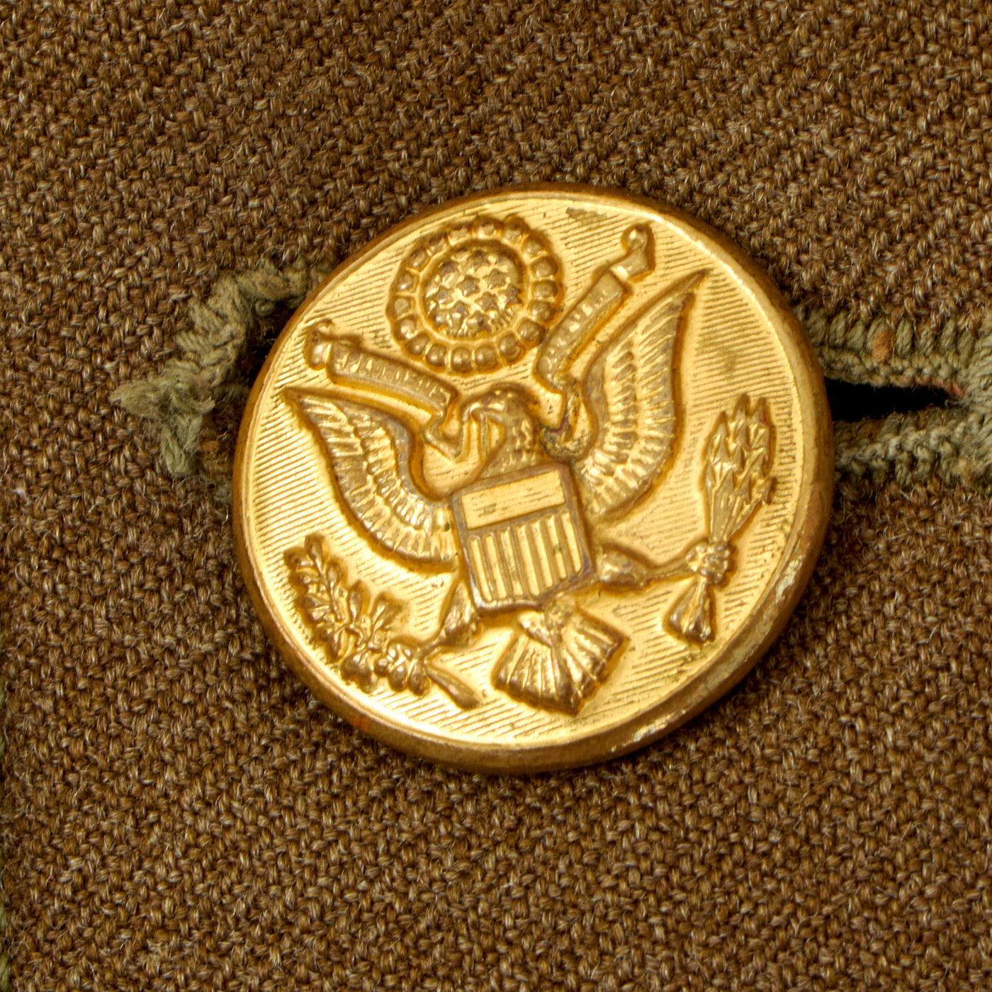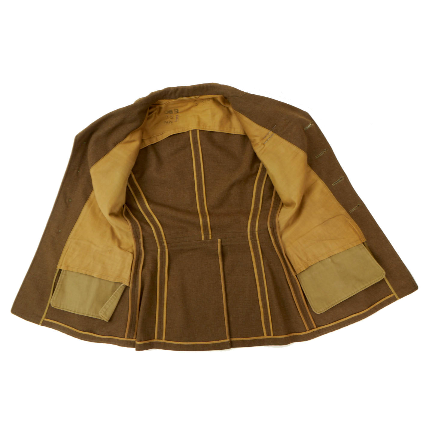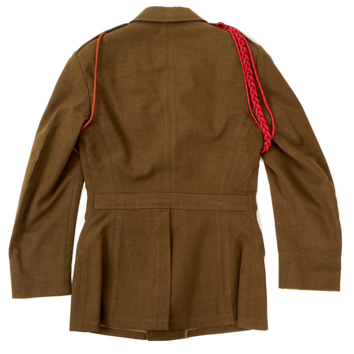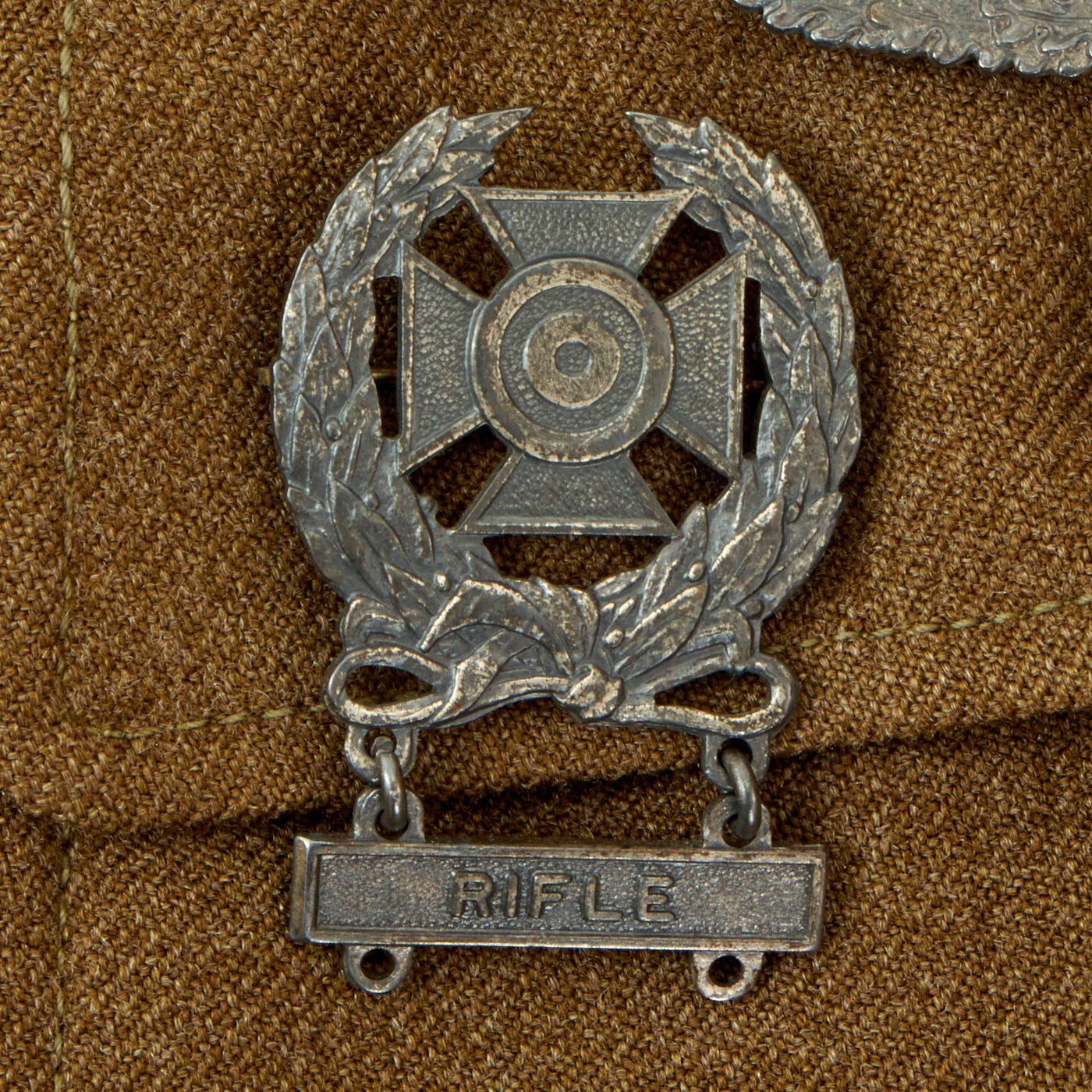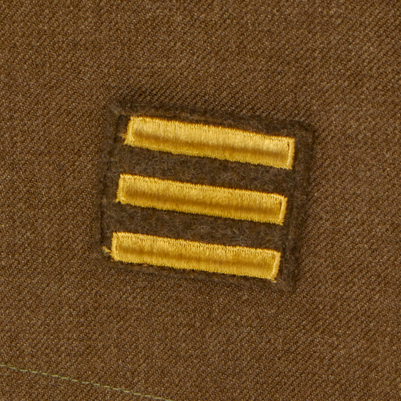 - Size 35R Class A Service Coat: Coat features beautiful personal marking on the inside liner with his laundry number (S-8188). Jacket also features a clean, crisp 82 AB patch on left shoulder as well as Sergeant chevrons on both sleeves and 3 overseas stripes on the lower left sleeve denoting 18 months of overseas service. On the left breast there is a beautiful blue with red trim backed jump wings beneath it a ribbon bar consisting of a Silver Star, Purple Heart, Good Conduct, American Campaign and an EAME with 3 bronze stars and a bronze arrowhead. Beneath the ribbon bar is a Combat Infantry Badge and a Rifle Marksmanship badge. On the right breast, just above the pocket is a Presidential Unit Citation. On the right shoulder is the "Belgian Fourragère 1940"- composed of one round smooth cord, partially braided, and of TWO other cords, of which one is terminated by a knot and a brass ferret - it is made of wool and cotton for NCOs and EM, and of silk for Officers - all threads are tinted in colors resembling the ribbon of the Belgian Croix de Guerre 1940 (i.e. basic red, dotted with green threads) - the Fourragère encircles the right shoulder and passes under the armpit, and is fixed by 2 tiny loops onto the button of the shoulder loop. On the left shoulder is the "Order of the Orange" shoulder cord awarded by the Dutch government for surviving Operation Market Garden.