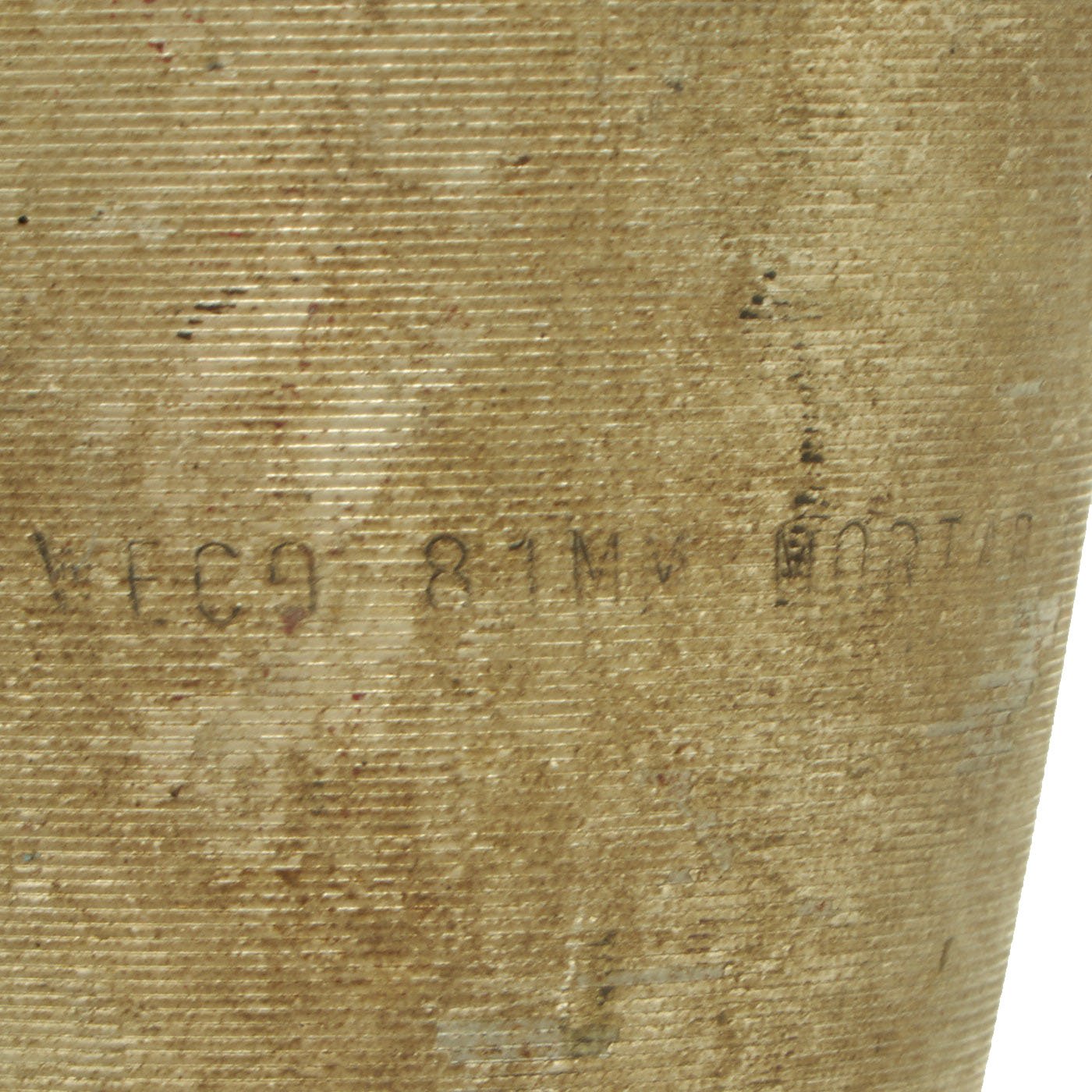 It is marked on the side with VFCO 81 MM MORTAR SHELL, while the fuse is marked LMC. This looks to have been stripped and possibly plated for a display post war.