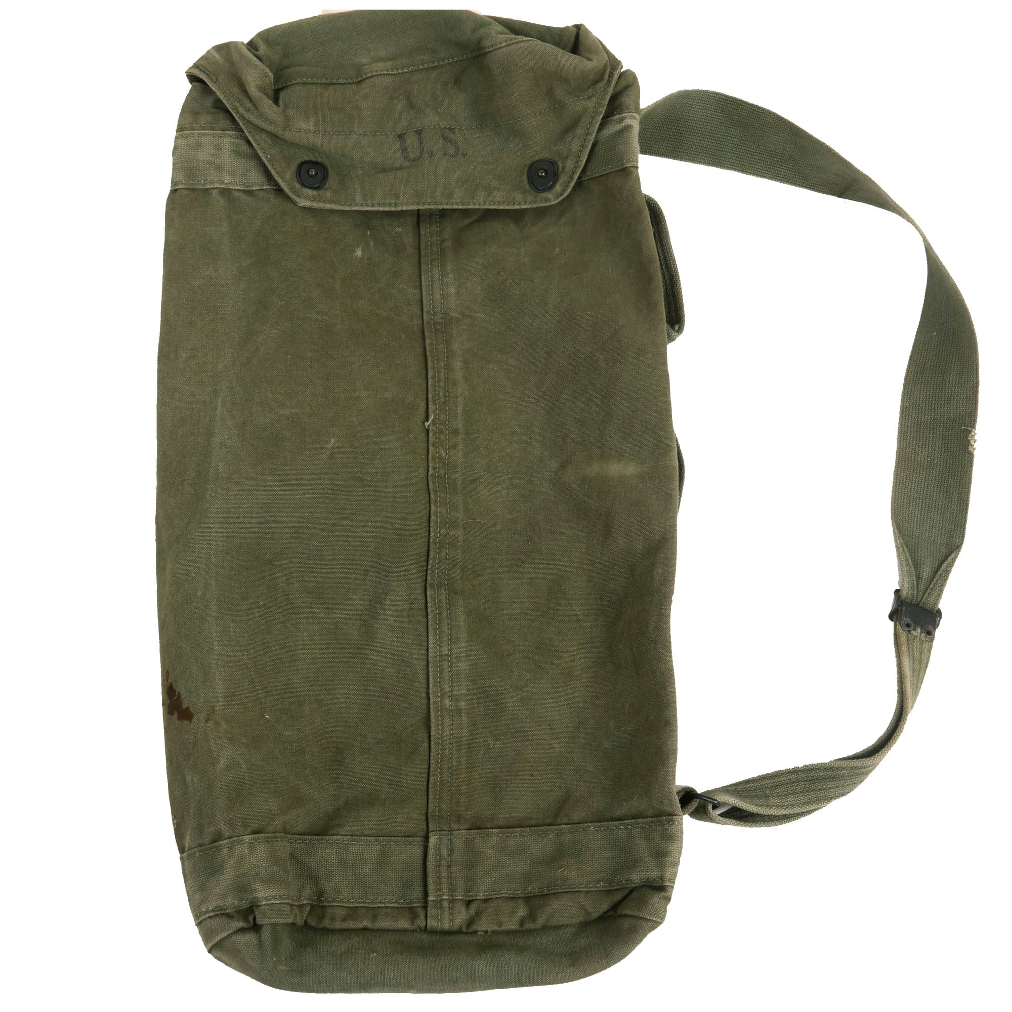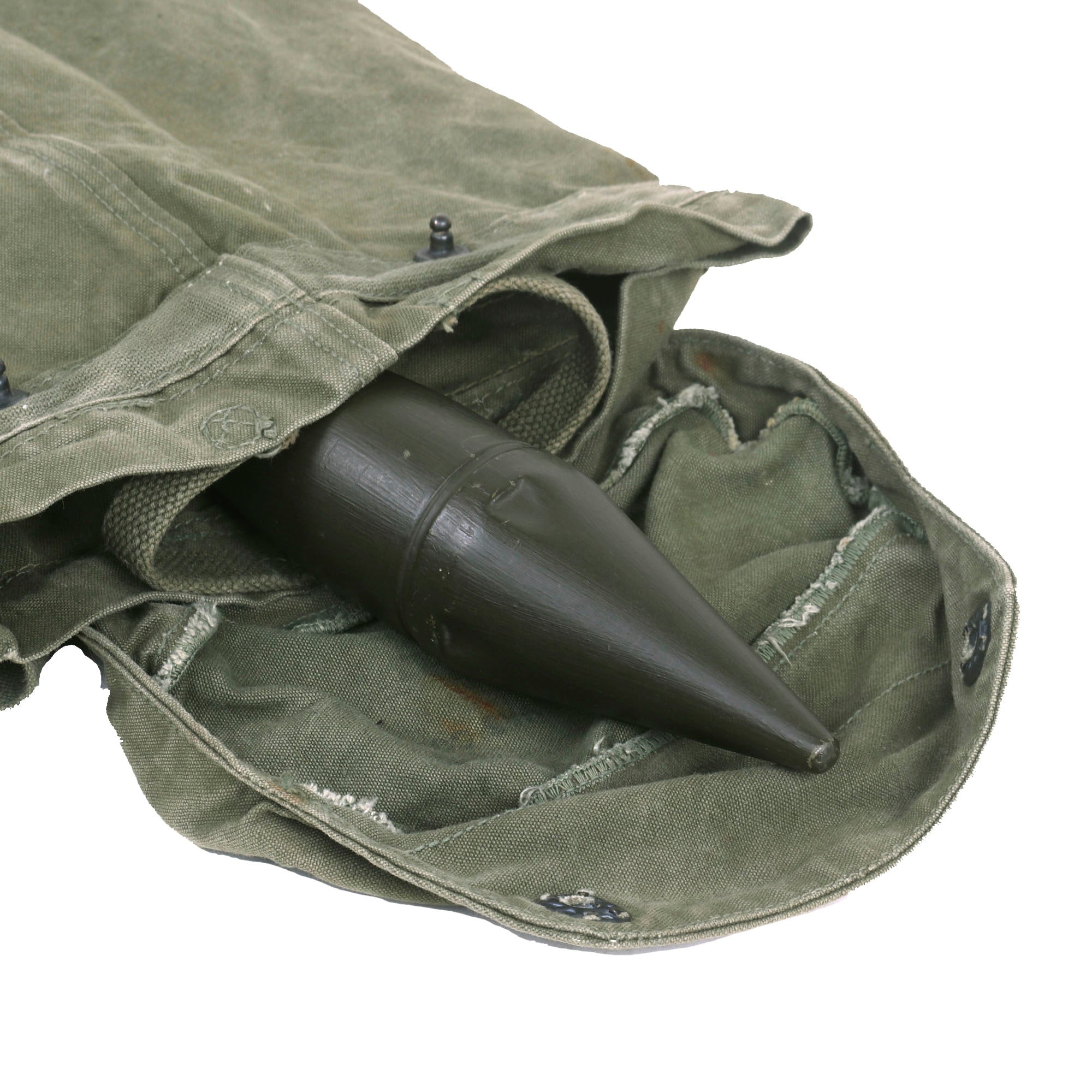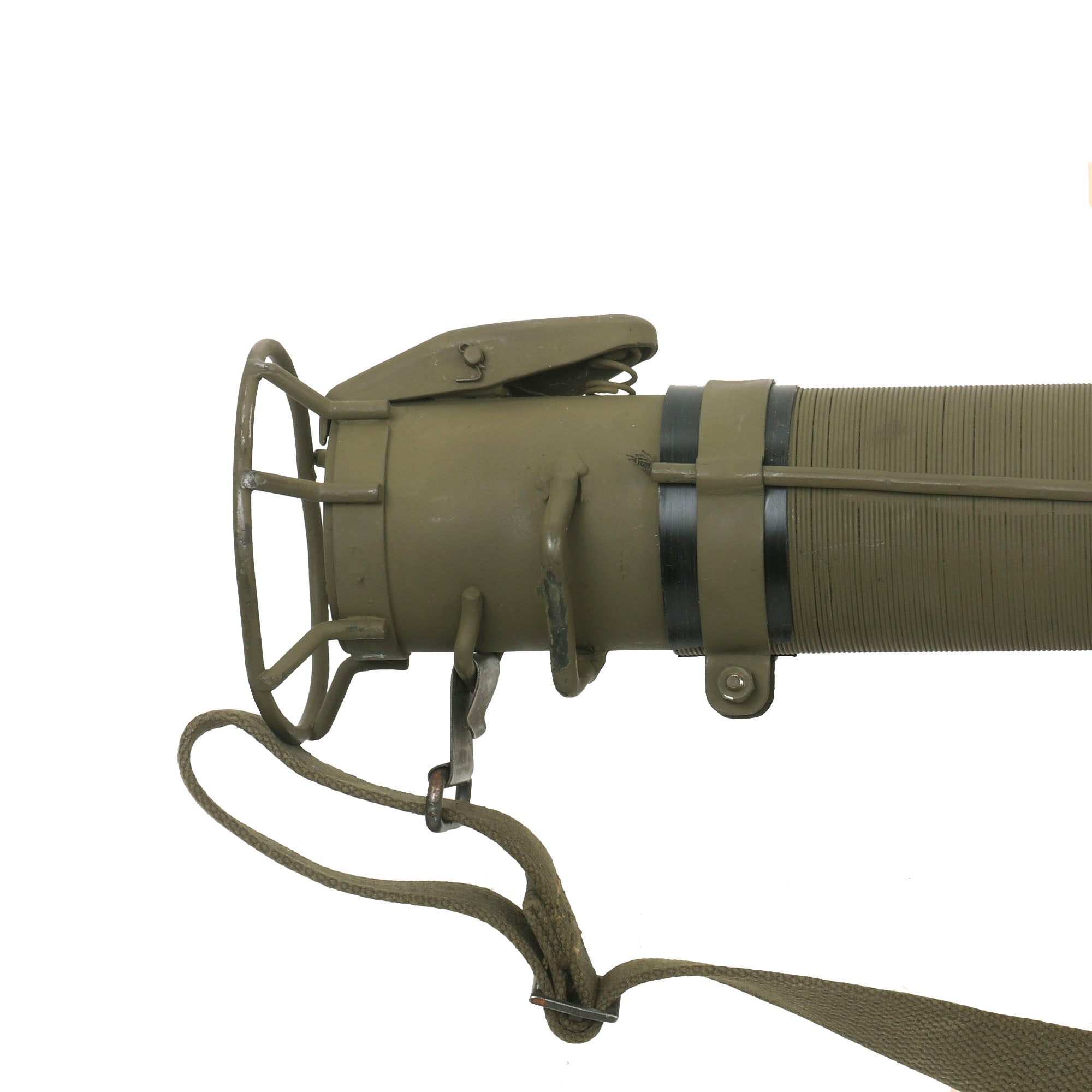 Additionally, this lovely display M9A1 Bazooka some with some fantastic and hard to find accessories! There is a lovely M6A1 pattern inert round, which has been fully deactivated to BATF specifications, and then repainted OD green with a brush. This are held in a lovely canvas carrier for 3 rockets in tubes, which is maker marked VICTORY CANVAS CO / 1944 under the top flap. Both rocket and carrier in very good service used condition, and really look great!