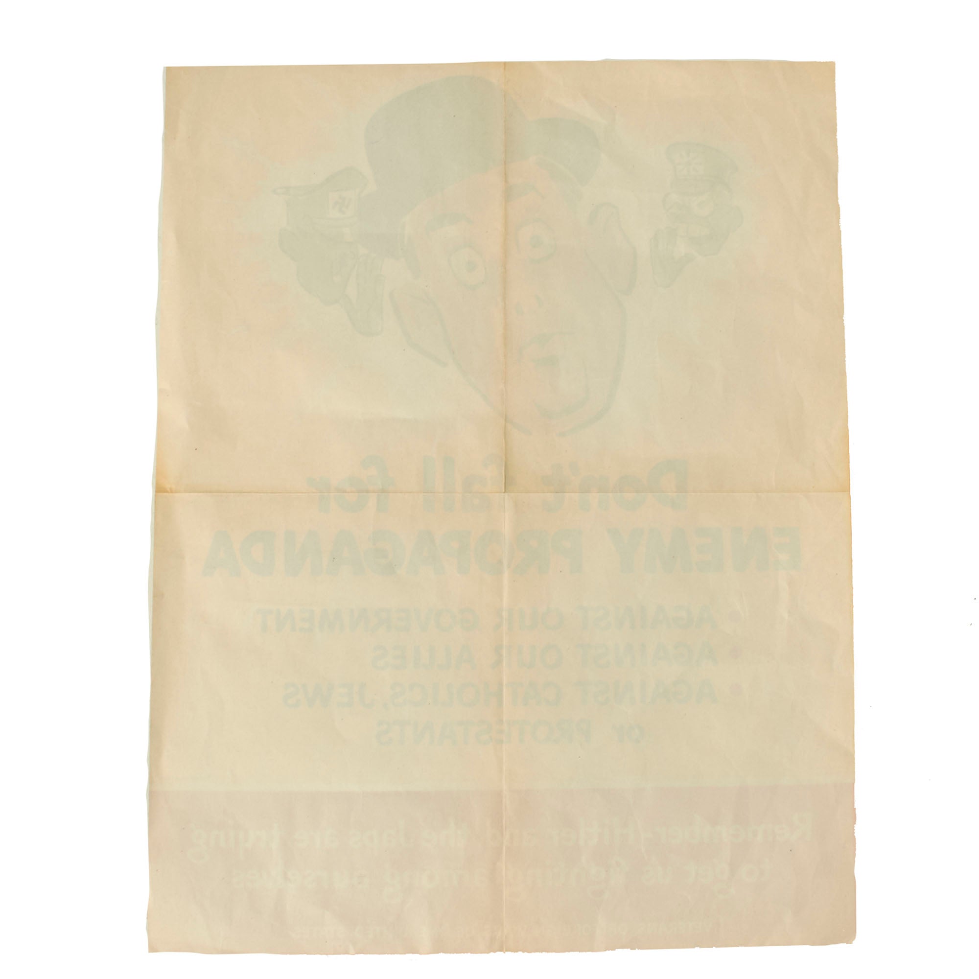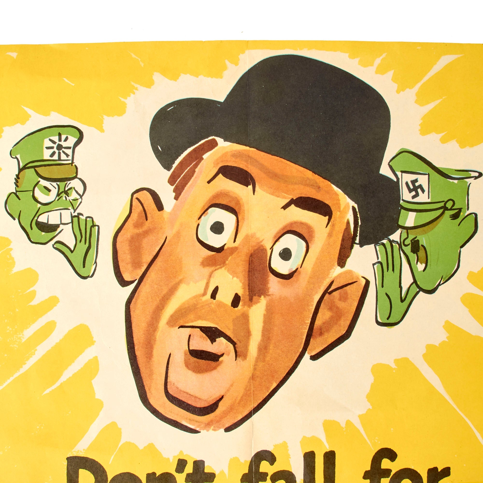 Original Item: Only One Available. Fantastic condition vintage Folded World War II Propaganda Poster (measuring 16 ½” x 21 ½” was illustrated by Jack Betts for the Office of War Information (OWI). This is a genuine 1943-1945 U.S. World War II Home Front poster features a cartoon image of a shocked man who is being whispered to by AH and Tojo and reads: