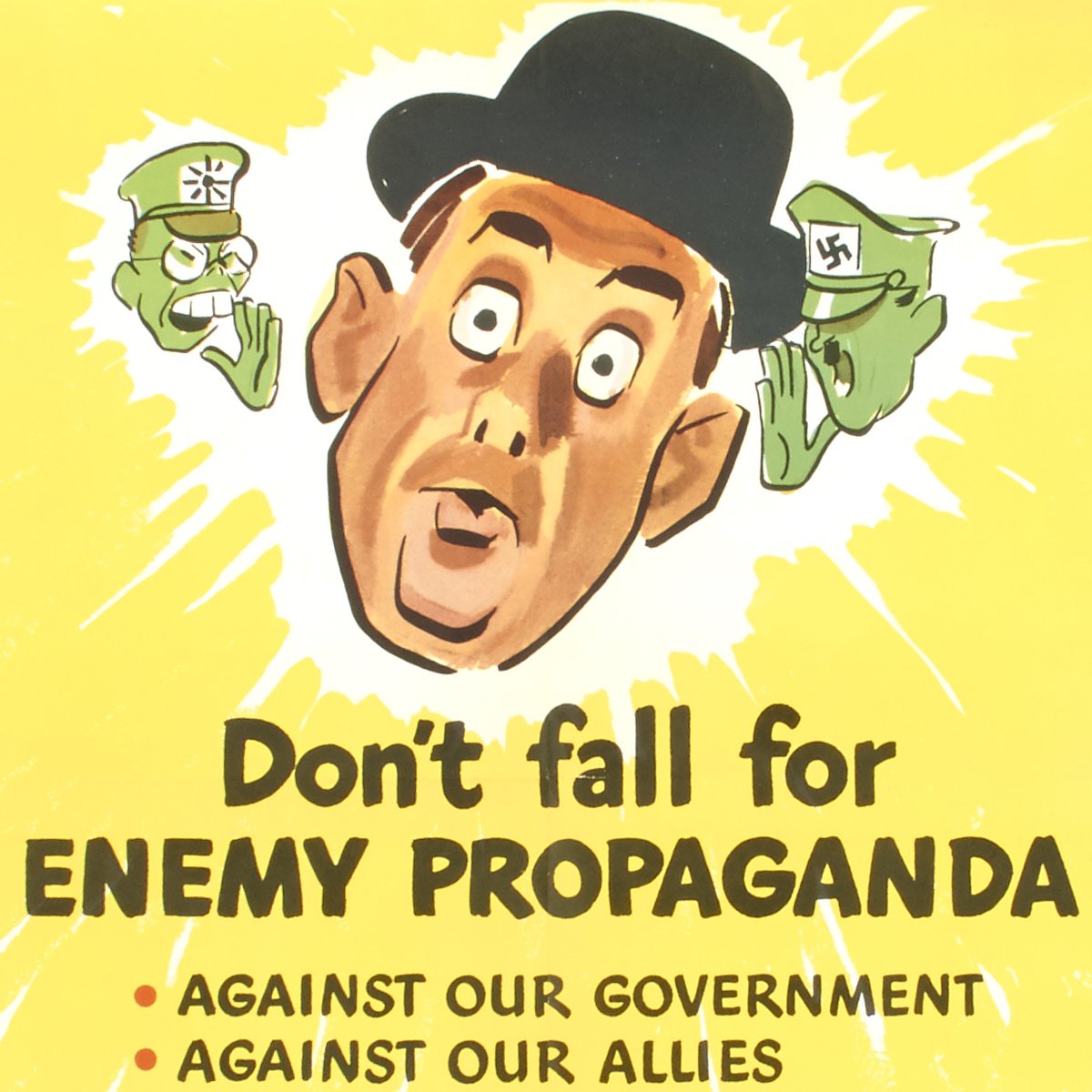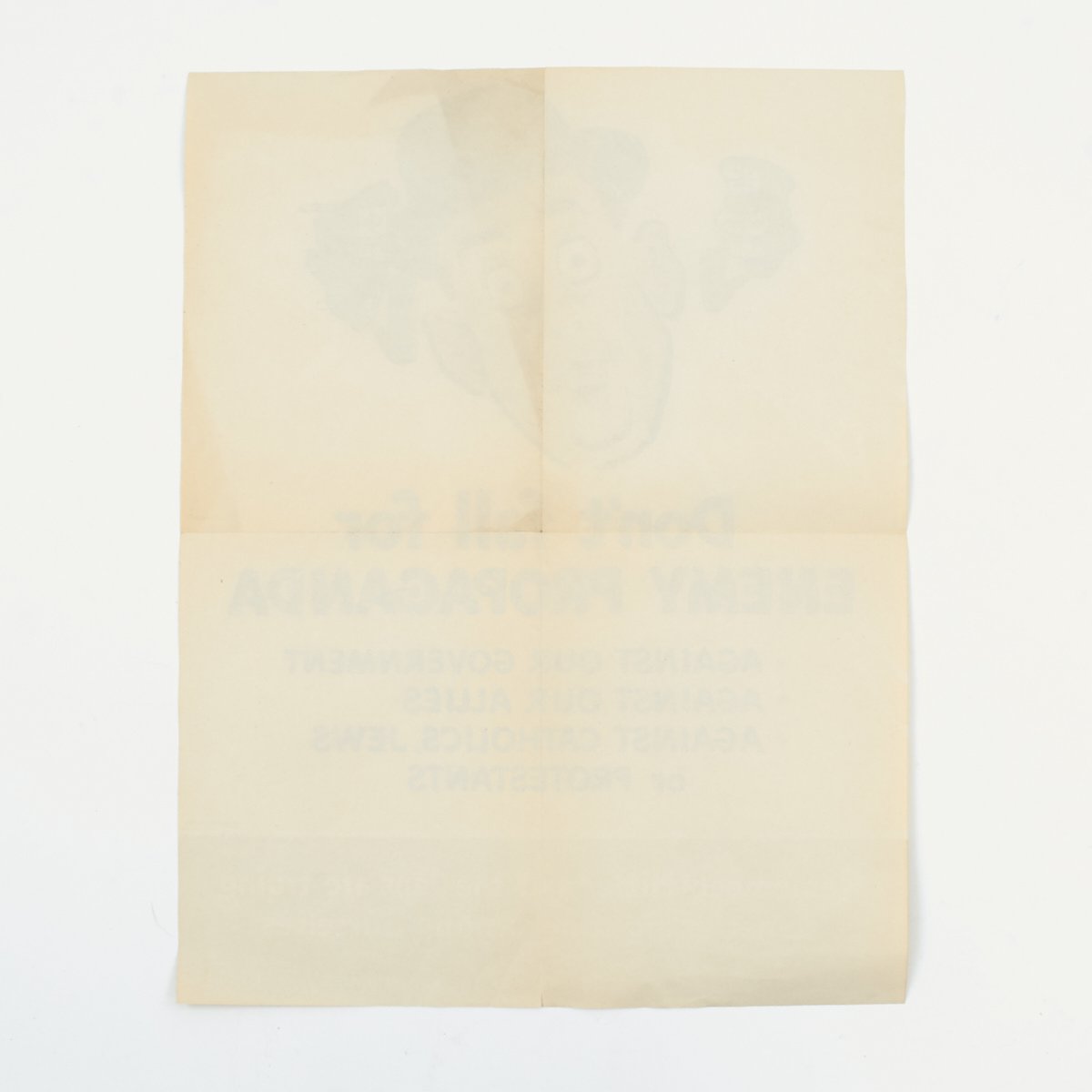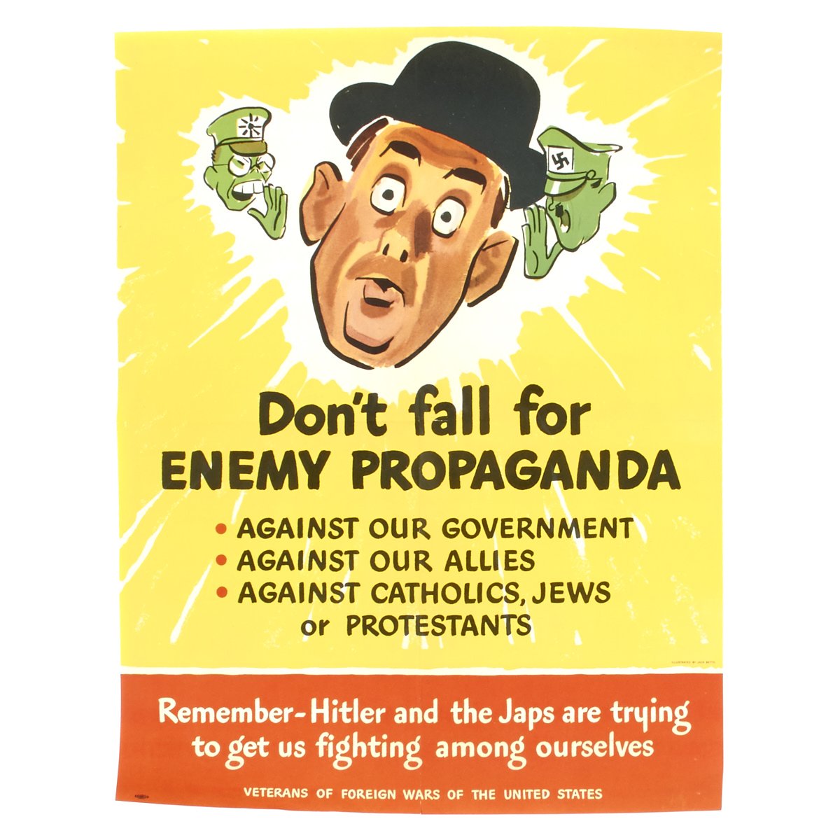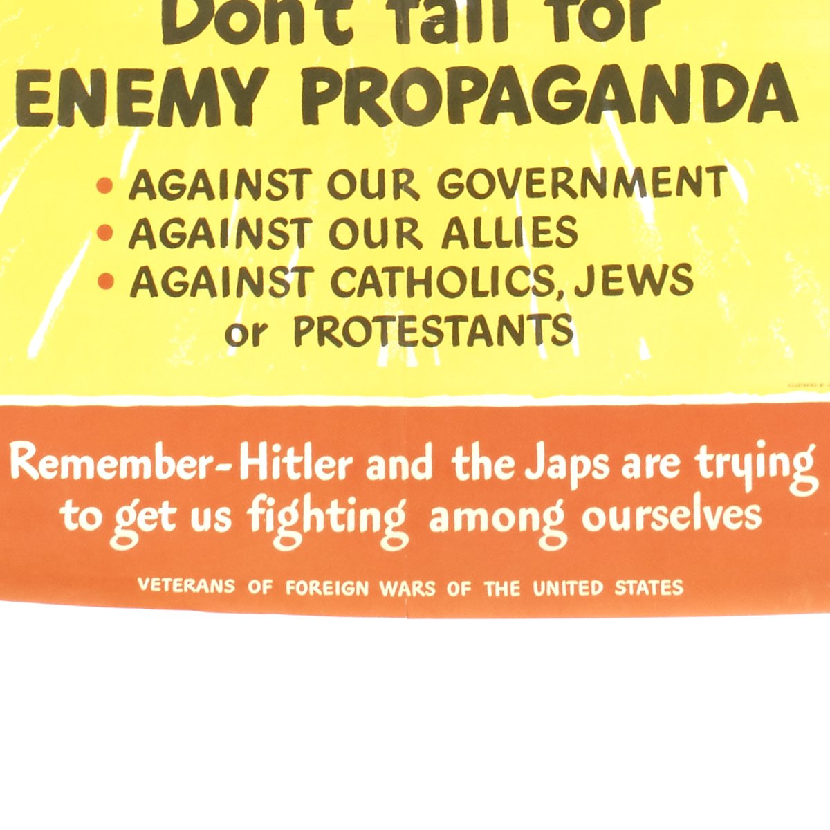 Original Item: Only One Available. Fantastic condition vintage Folded World War II Propaganda Poster (measuring 16 3/4" x 21 3/4" [43 x 55 cm] was illustrated by Jack Betts for the Office of War Information (OWI). This is a genuine 1943-1945 U.S. World War II Home Front poster features a cartoon image of a shocked man who is being whispered to by AH and Tojo and reads: