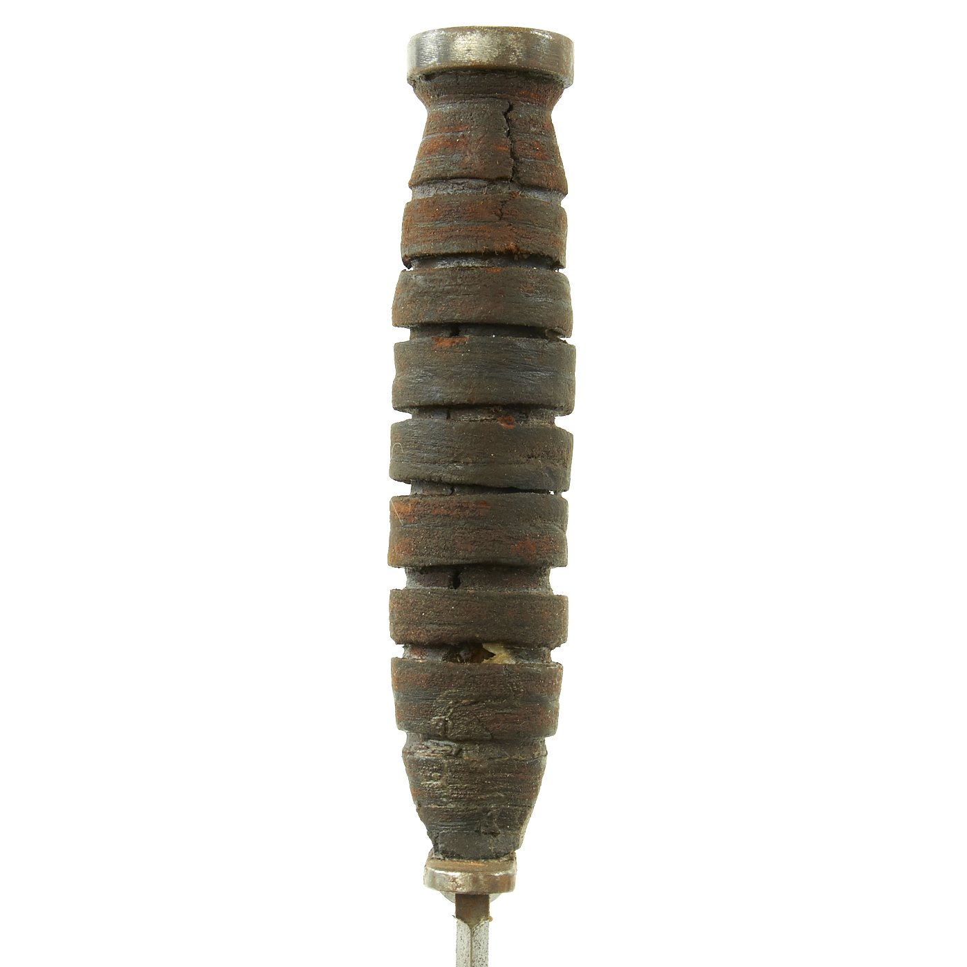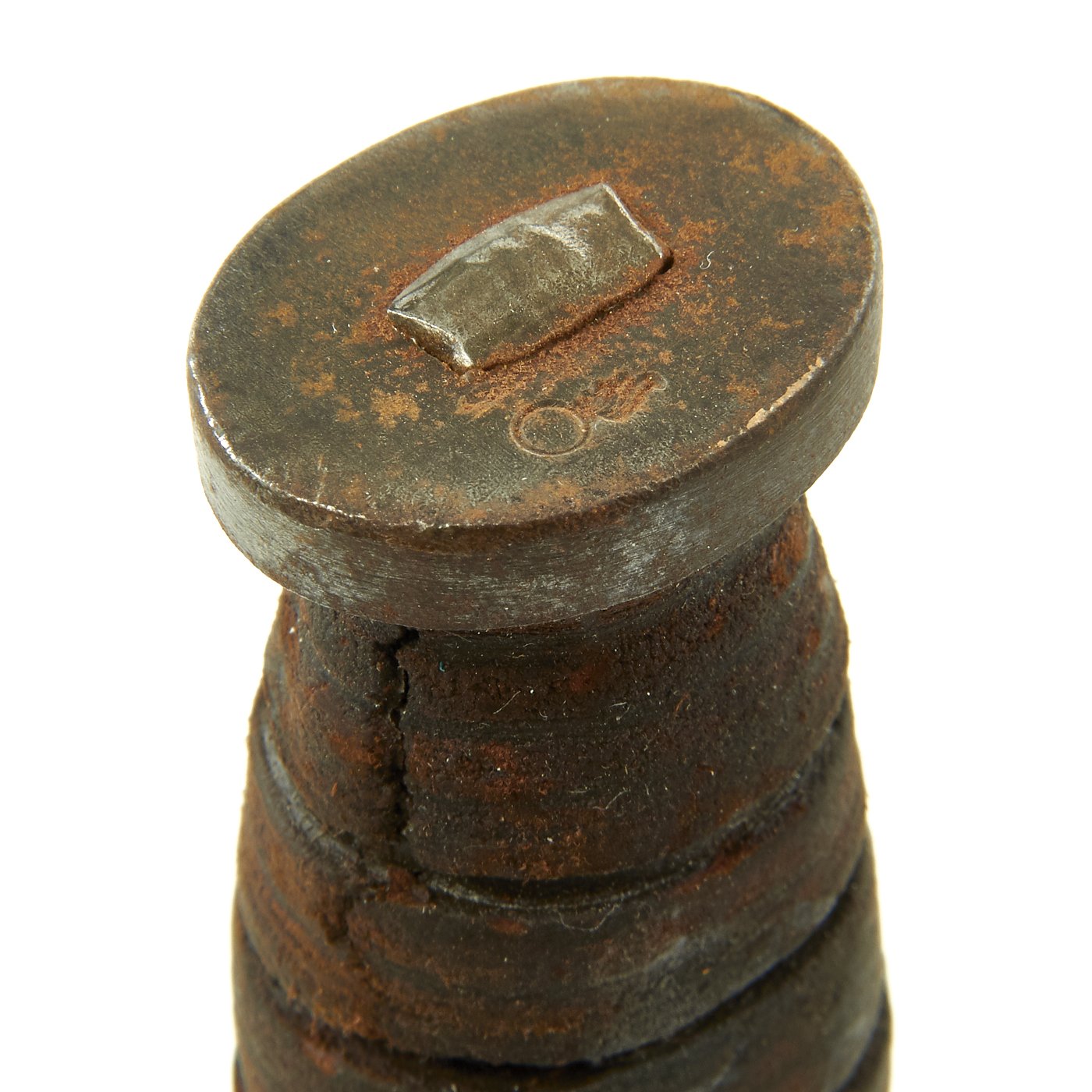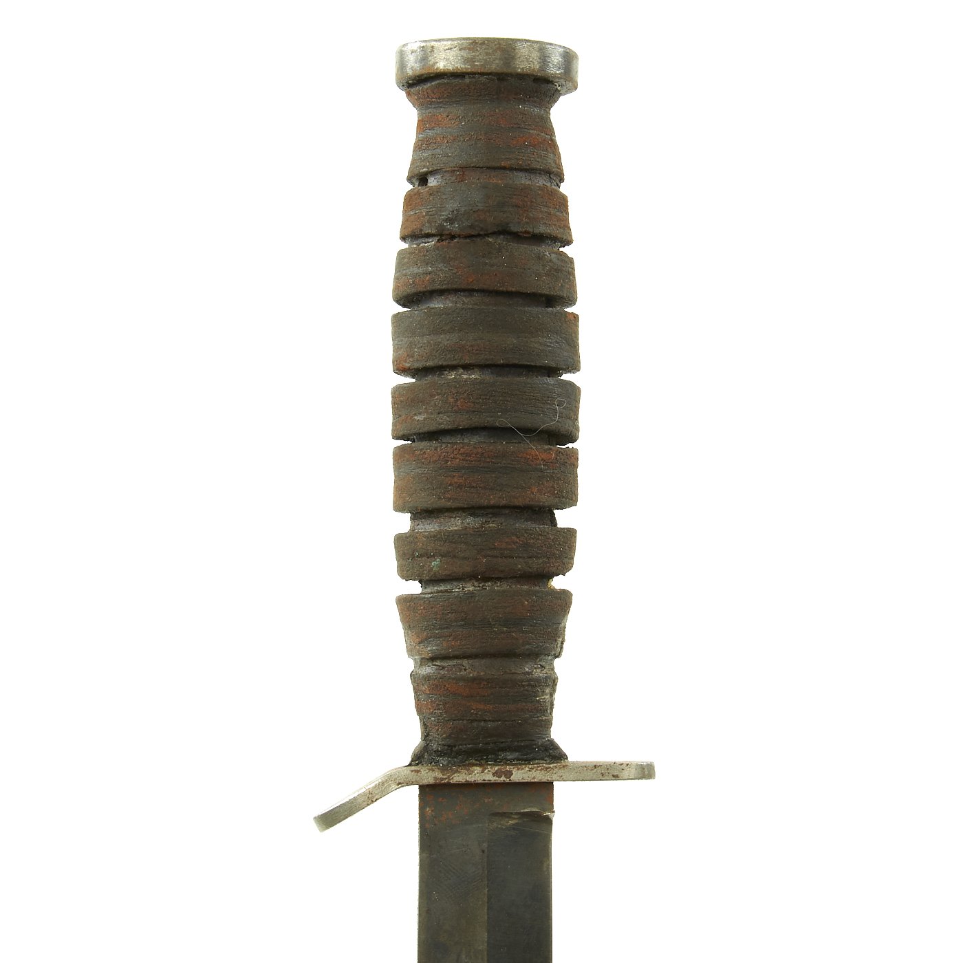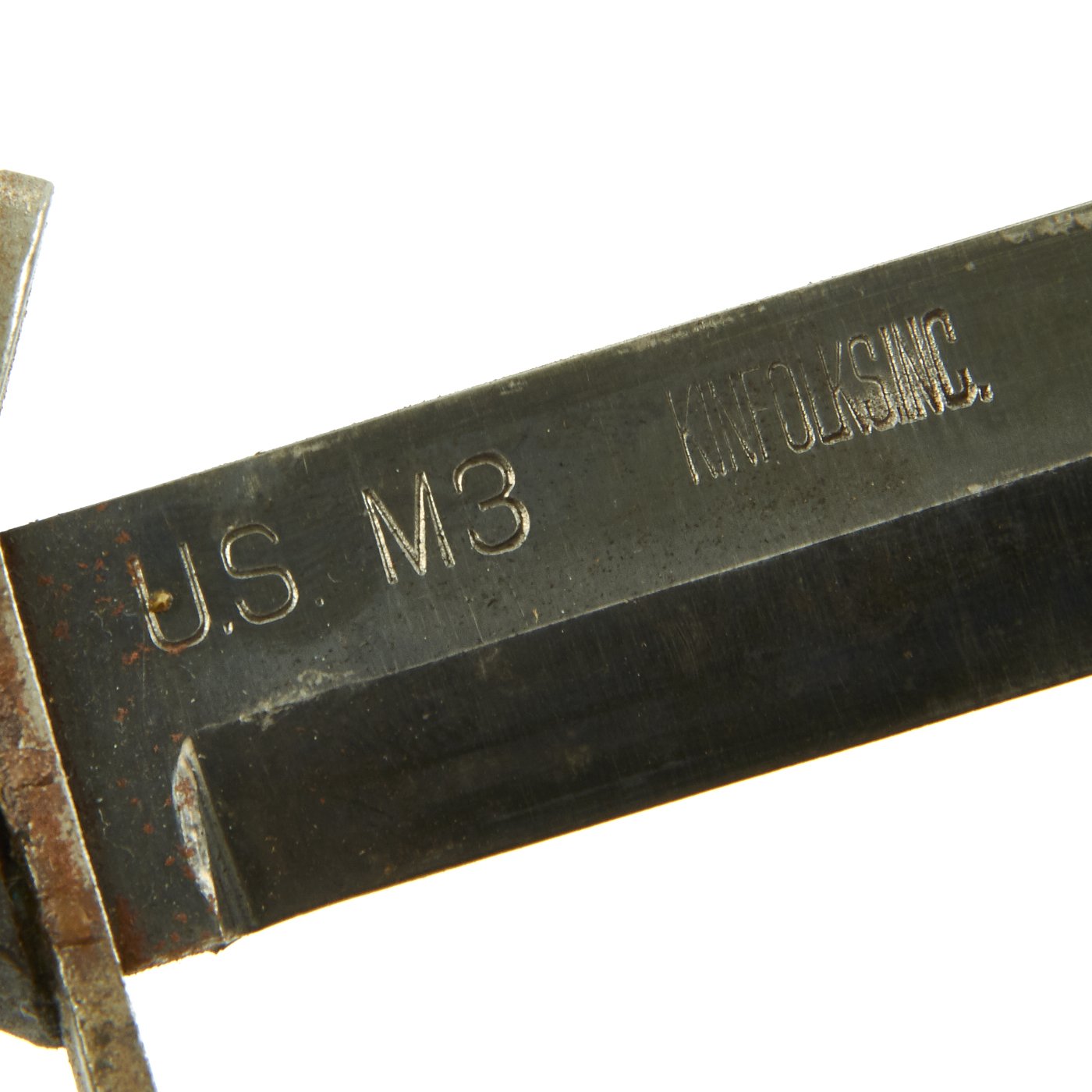 This knife is early production, indicated by the maker information being stamped directly on the blade: U.S. M3 KINFOLKS INC. The 6 1/2 inch spear point blade is in very good used condition, with lots of the original shiny blued finish present. There is some wear around the edges, and a bit of rust speckling, but does not have any major issues or damage. The handle and stacked leather grip are in a bit worse condition, and it looks like that the knife was exposed to moisture over a long period of time, There are some splits in the leather, with the tang visible in some areas. The bottom of the pommel shows the U.S. "Flaming Bomb" proof mark and peened over tang.