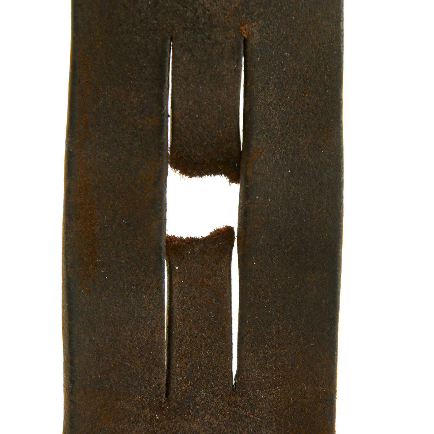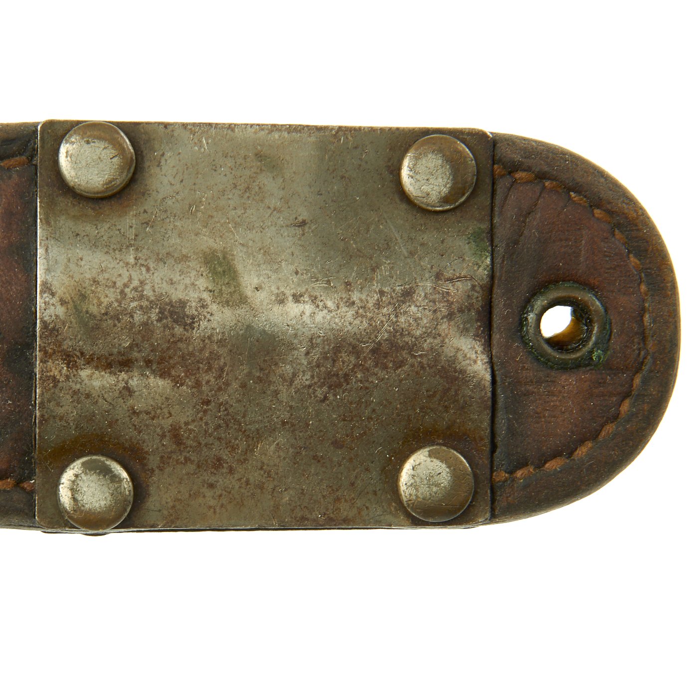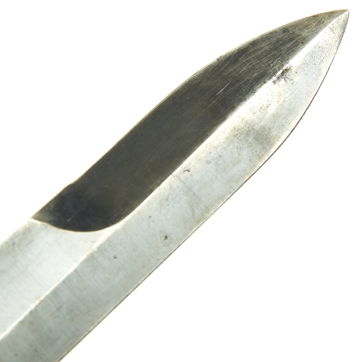The original scabbard is very faintly marked, MILSCO / 1943, and is in good condition, though the the retaining strap has torn away, and is still secured around the grip of the knife. It has a lovely aged leather look, with a bit of cracking and dry rot in places. There is a bit of tearing where the frog meets the scabbard, and it shows a lot of wear. This is the original scabbard designed for this knife, which was then replaced with the Fiberglass M8/M8A1 scabbards, which were also used with the M4 bayonet.
