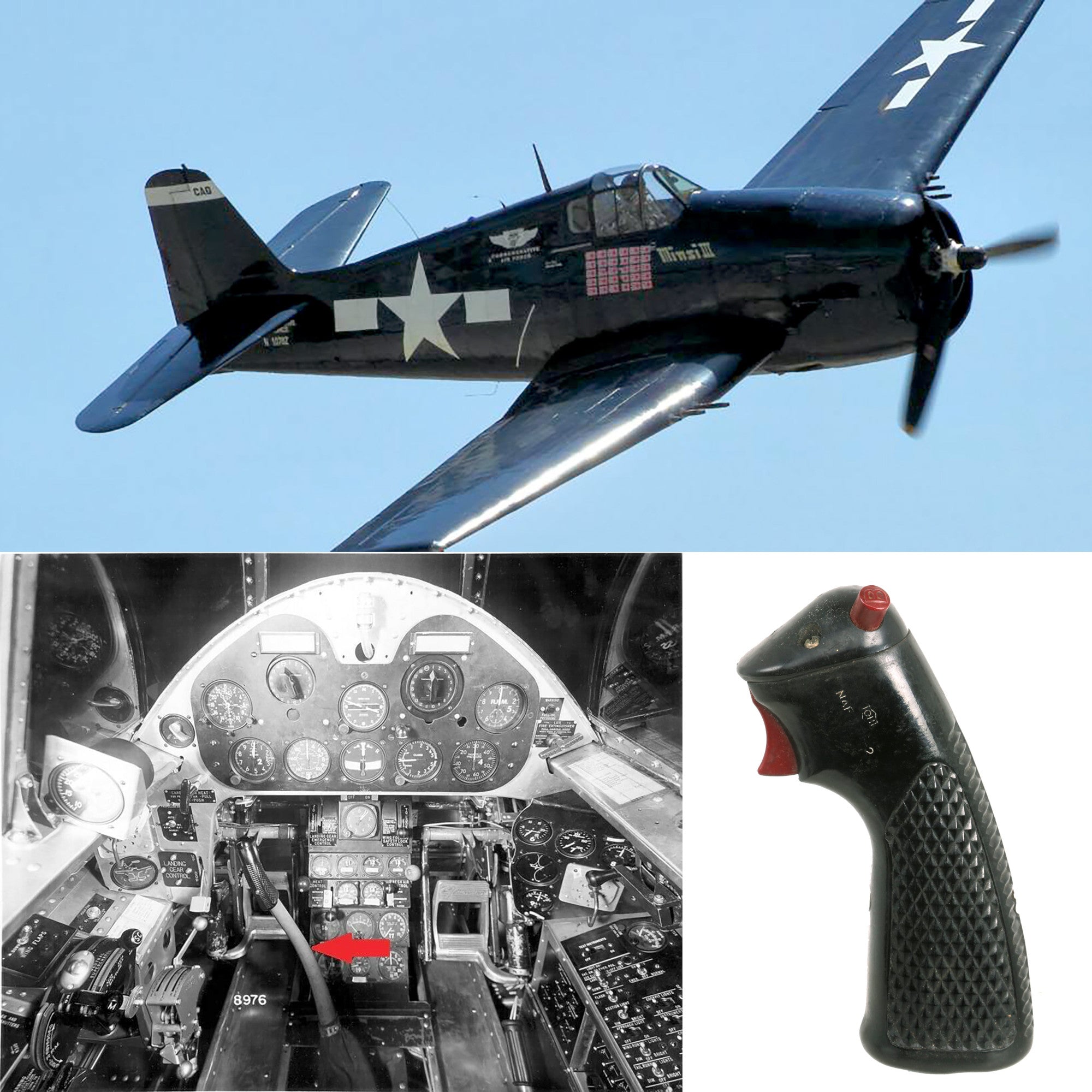 This control stick is an early version for the US Navy Grumman F6F Hellcat and is offered in fantastic condition without any wiring. The buttons click and “function” as intended though there is no wiring present so this is a non functional display item. The side is faintly marked with the correct NAF 1173-2, designation, under a maker marking. Measures approximately 6 inches in length.