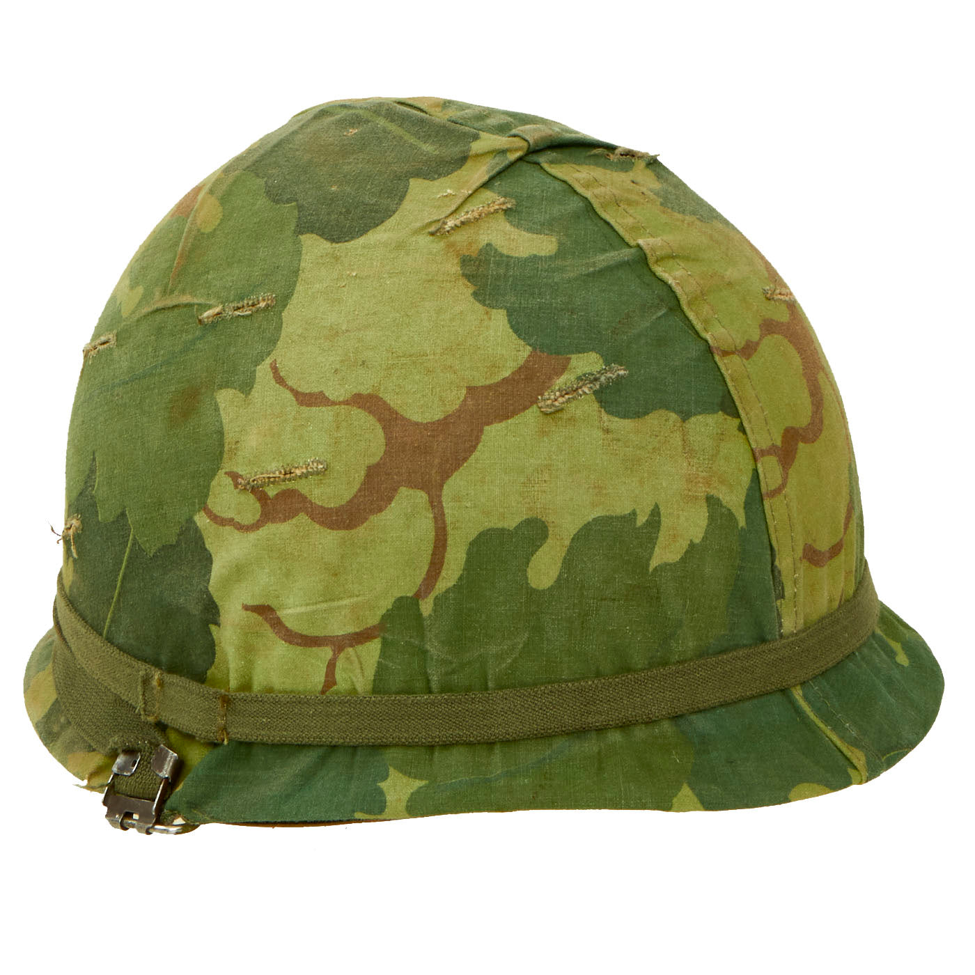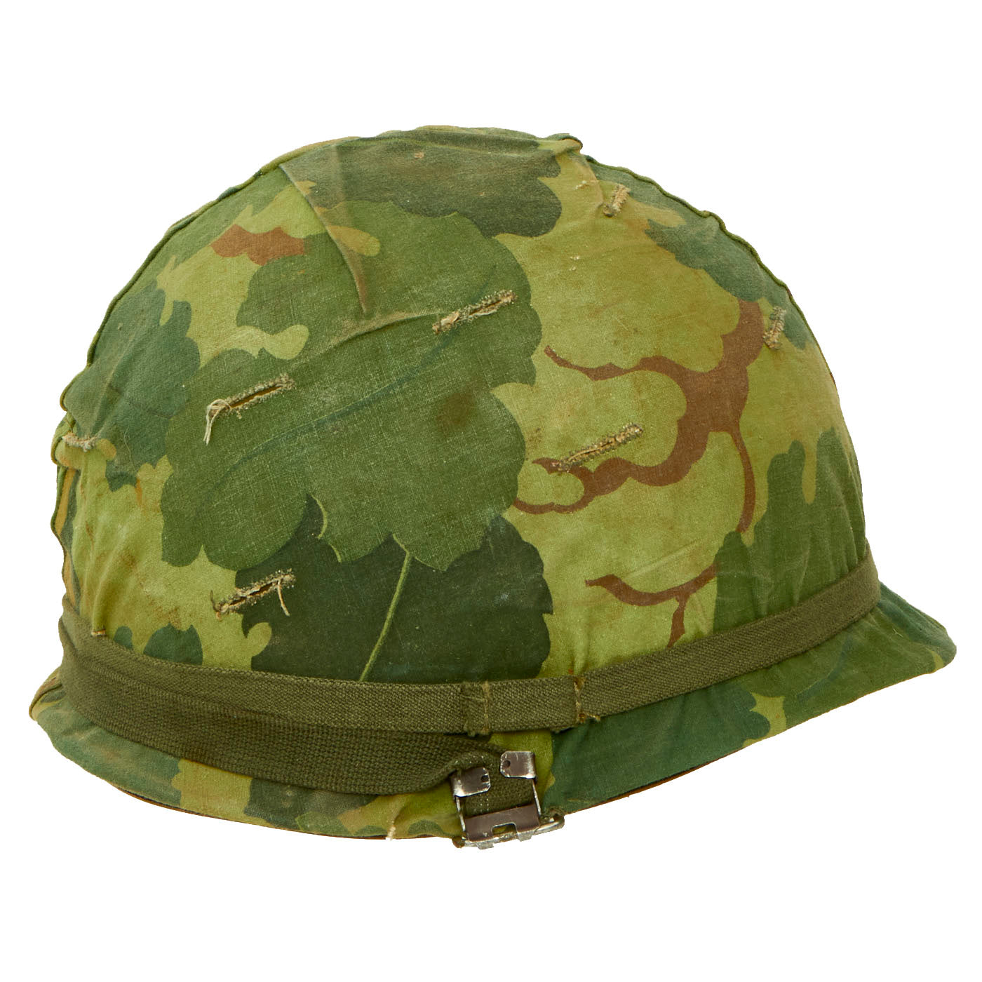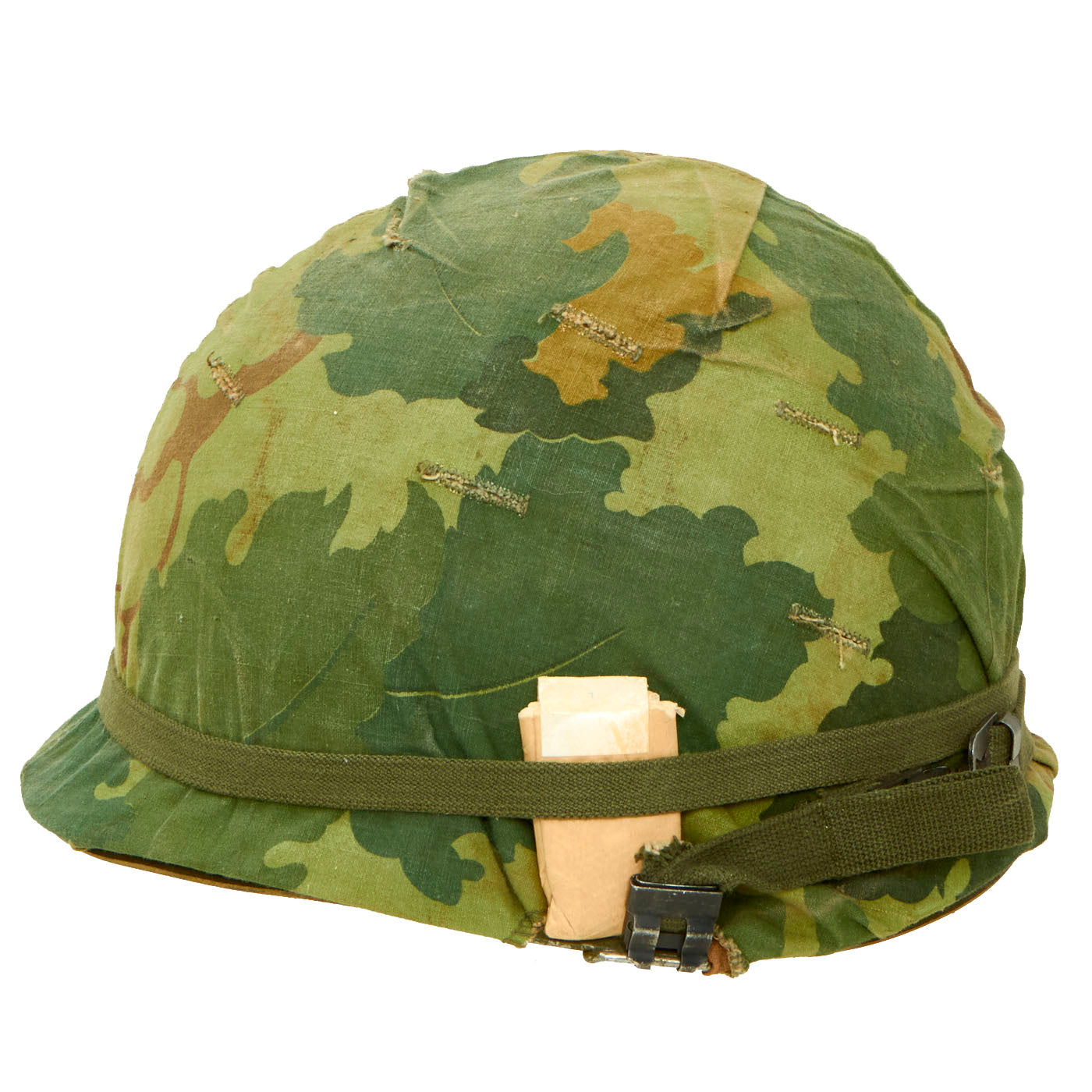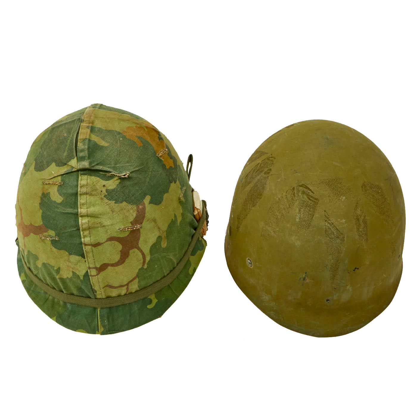 Original Item: Only One Available. This is a very nice WWII M1 Helmet Shell which was depot refinished for use during the Vietnam War. The helmet is matched with a lovely early 1960’s Vintage Pattern 1955. The Mitchell Pattern helmet cover is an early Vietnam War example and is in lovely condition, complete with original Vietnam War Issue Elastic Foliage Band.