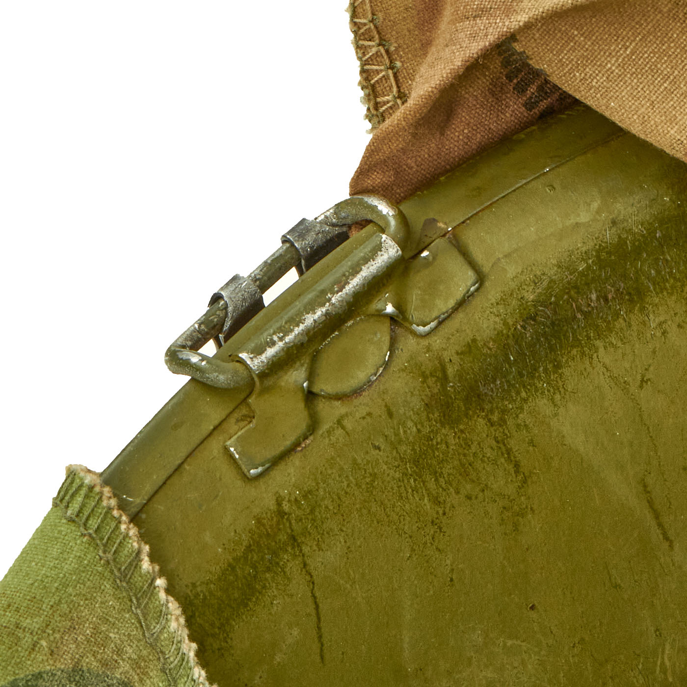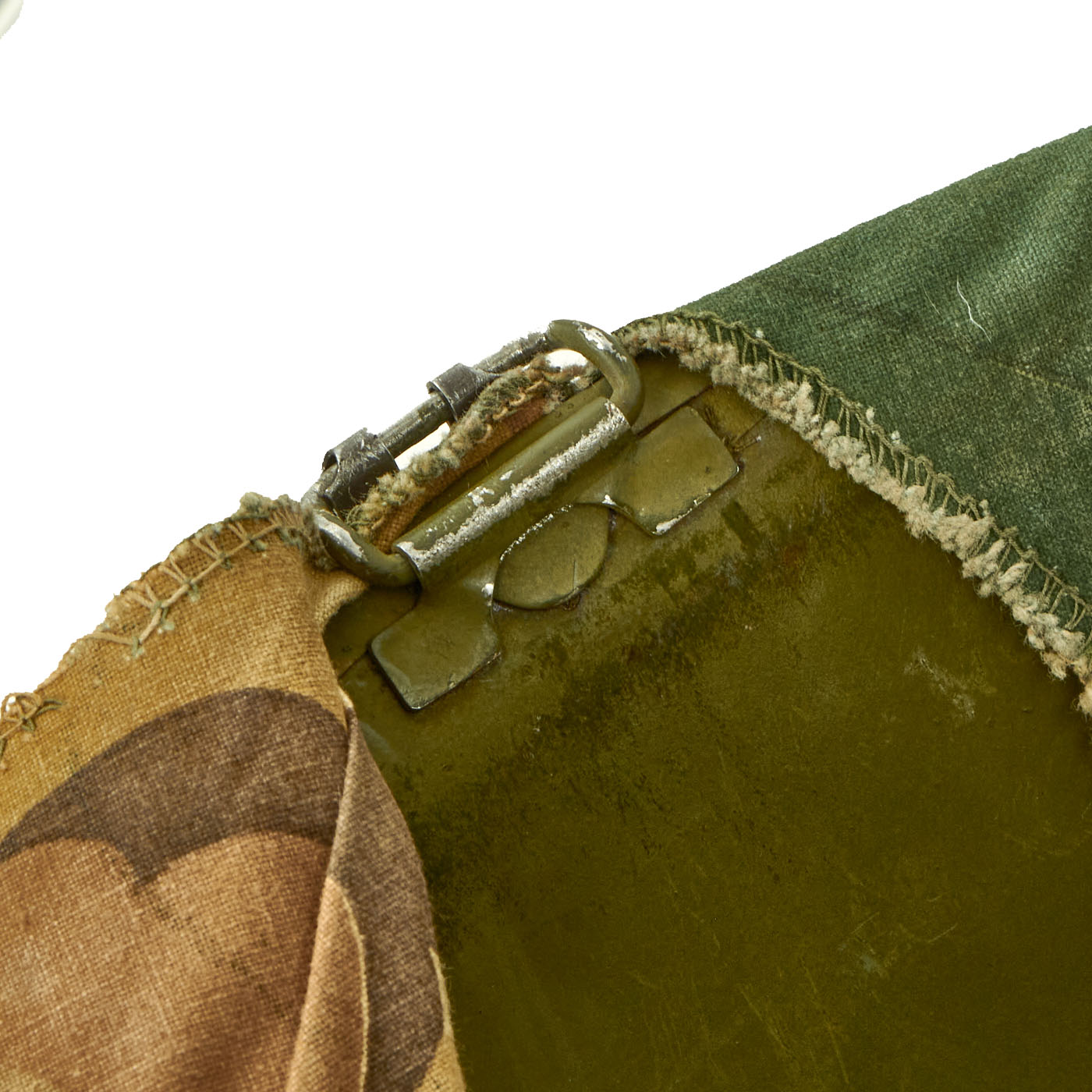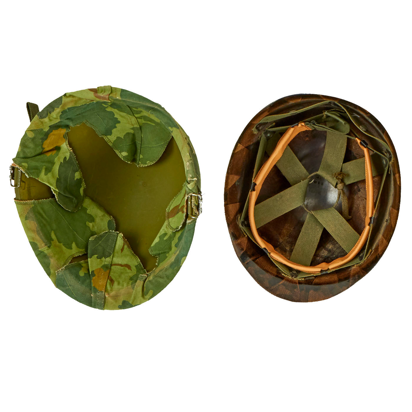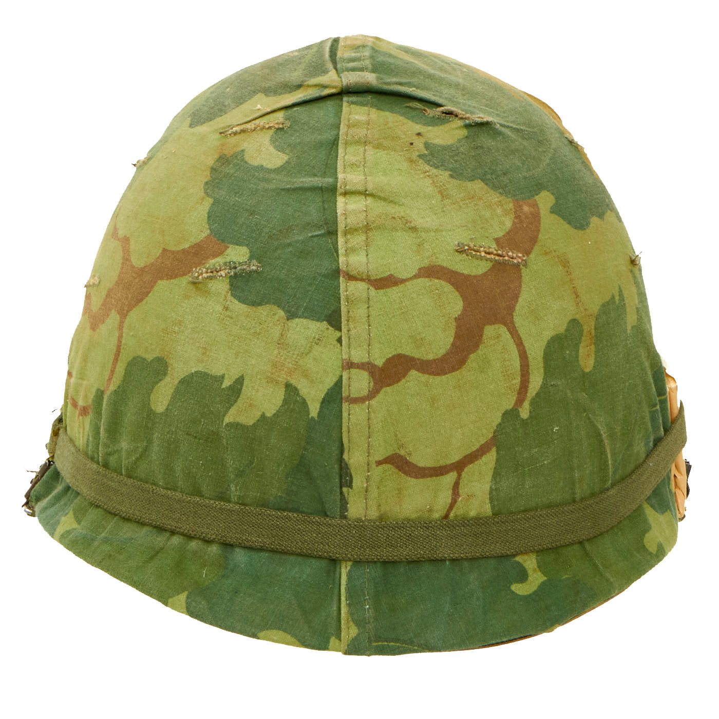 Original Item: Only One Available. This is a very nice WWII M1 Helmet Shell which was depot refinished for use during the Vietnam War. The helmet is matched with a lovely early 1960’s Vintage Pattern 1955. The Mitchell Pattern helmet cover is an early Vietnam War example and is in lovely condition, complete with original Vietnam War Issue Elastic Foliage Band.