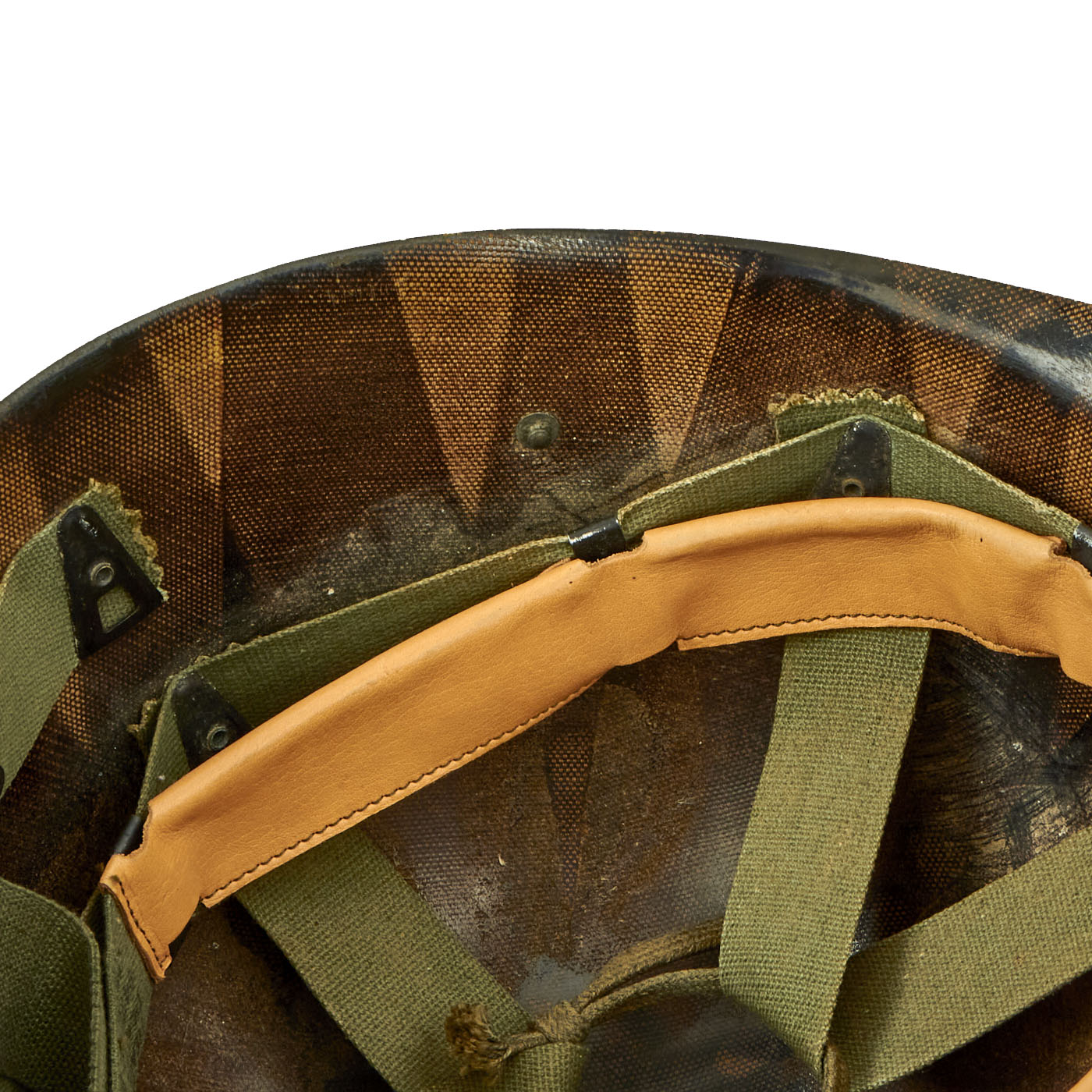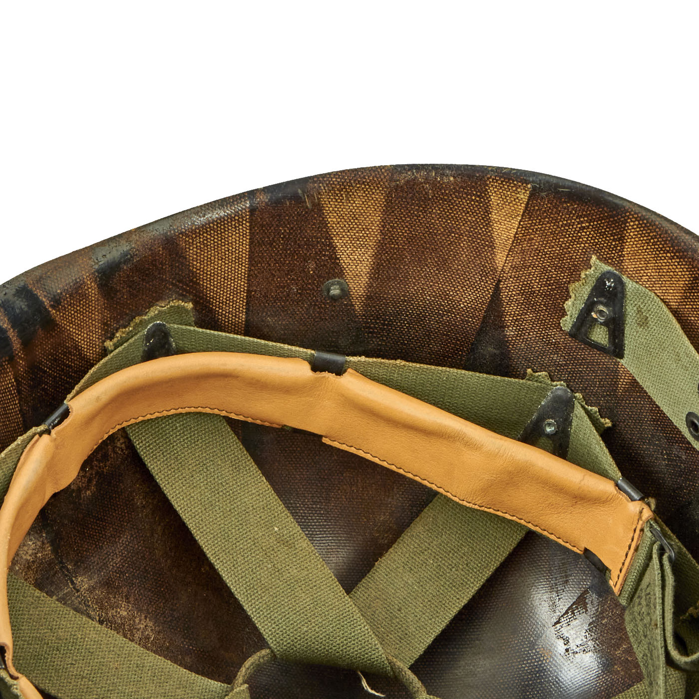 The helmet is complete with an early issue, Vietnam Era, "High Pressure" liner The liner has had all of the original paint on the exterior, and shows some minor period wear The interior has clean OD7 Olive Drab HBT Webbing secured by blacked “A”-Washers, which show some slight oxidation. The sweatband, while absolutely identical in materials and appearance appears to be a later, post-Vietnam, addition… which does not detract from the overall outward appearance of the helmet at all.