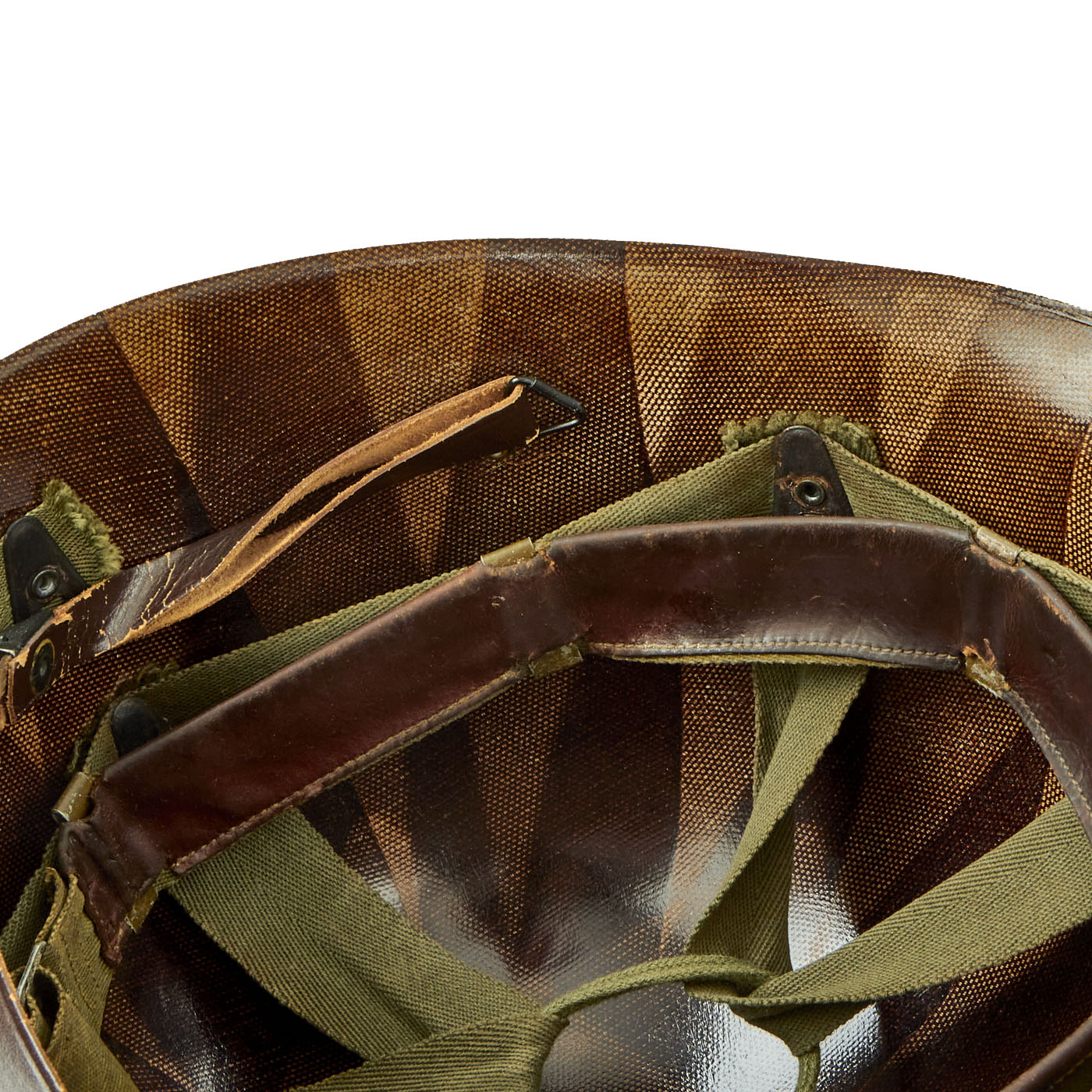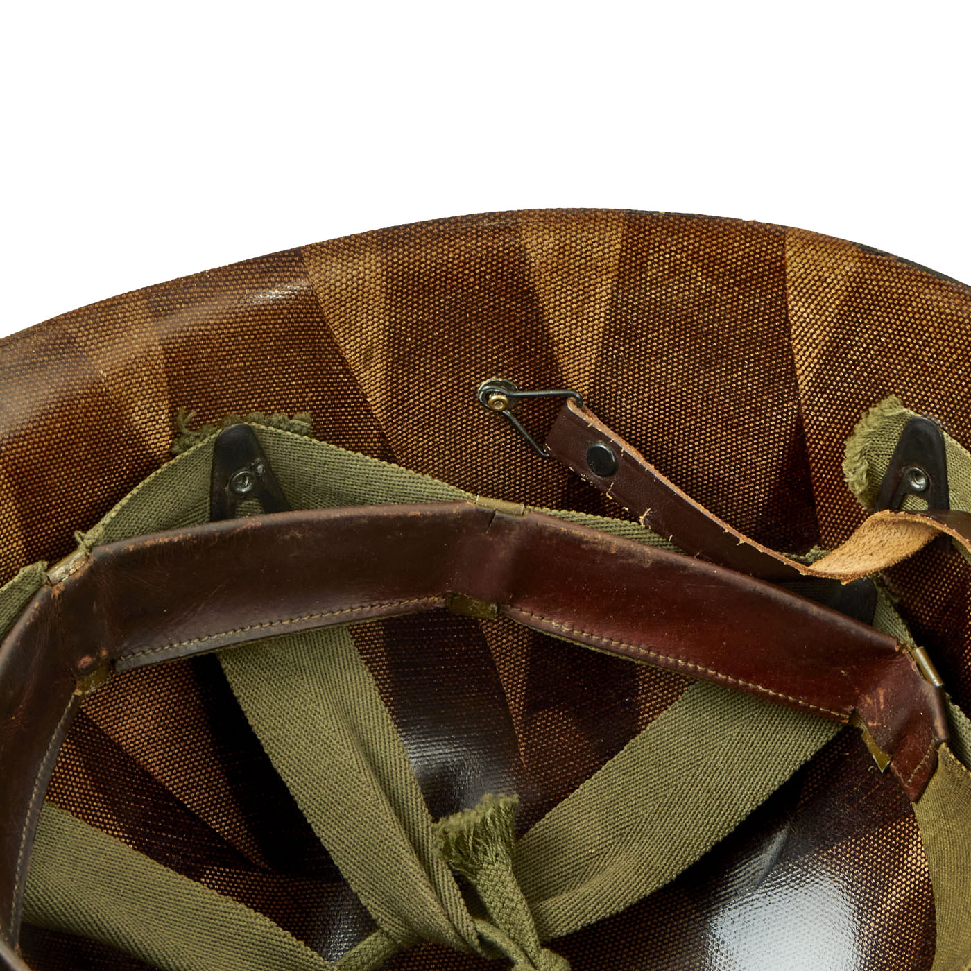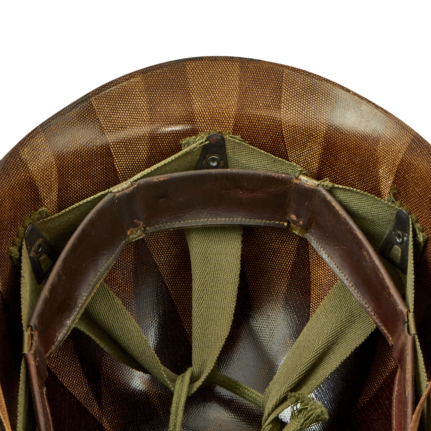 The helmet is complete with an early issue, Korean War Era, "High Pressure" liner and leather chinstrap, with a CAPAC stamp on the crown. The liner has had all of the original paint on the exterior, and shows some minor period wear The interior has clean OD7 Olive Drab HBT Webbing secured by blacked “A”-Washers, which show some oxidation. All pieces are present, as is the leather liner chinstrap.