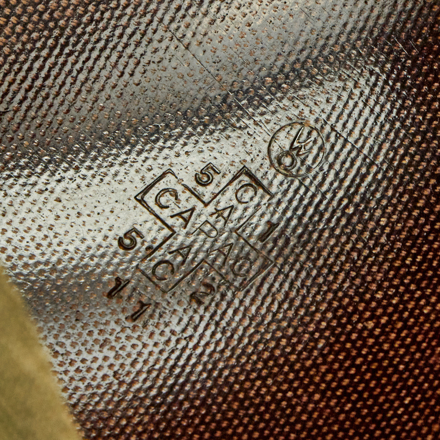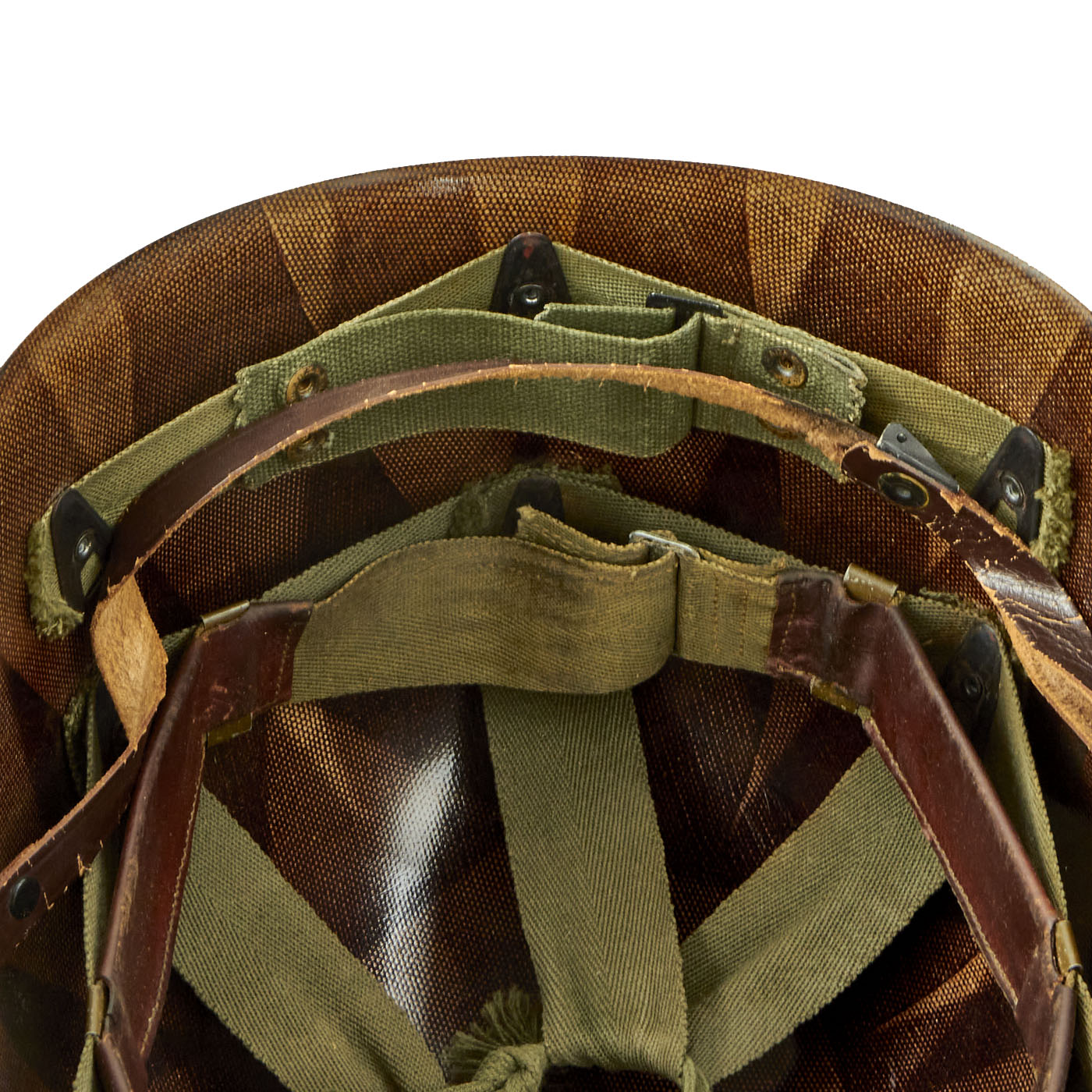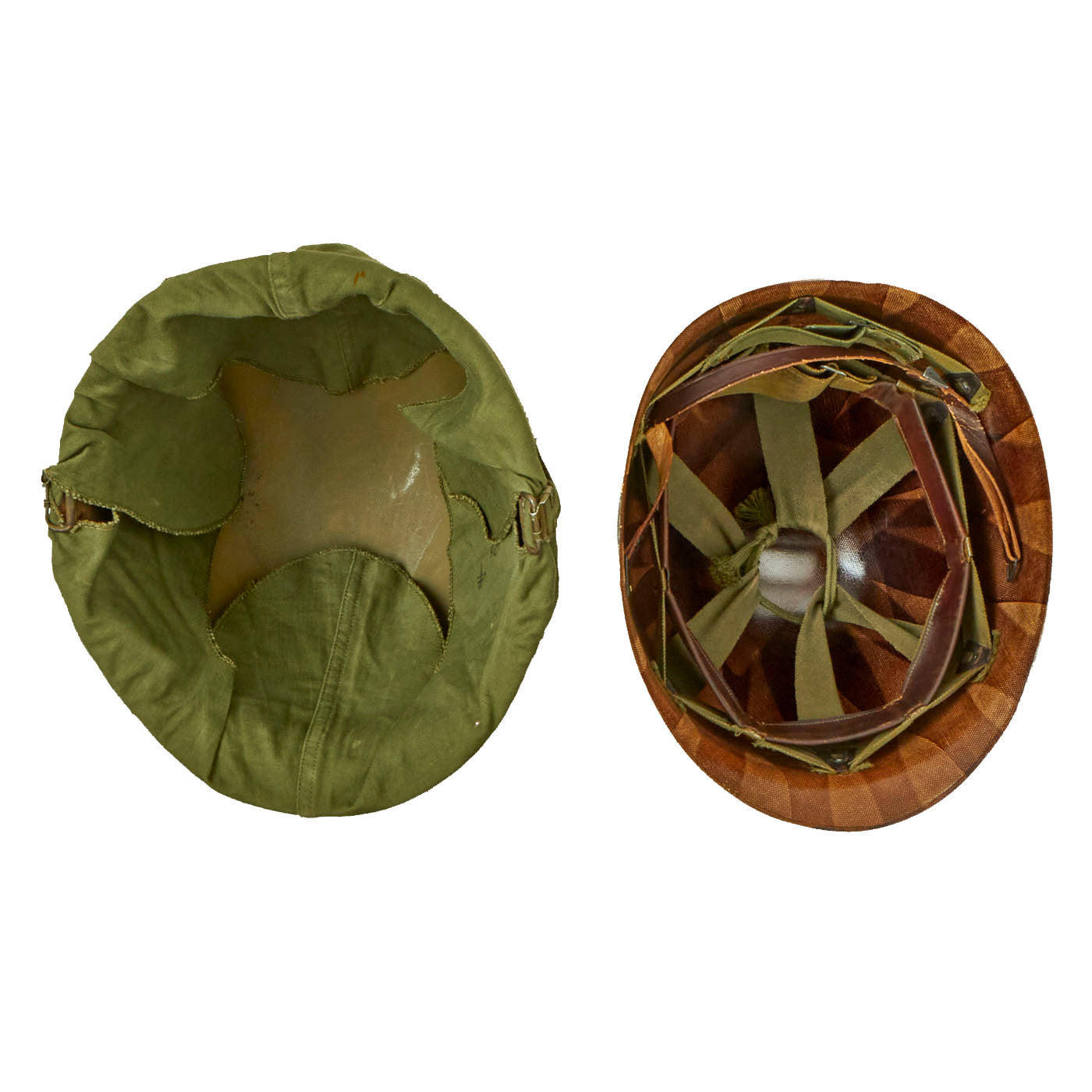 The helmet is complete with an early issue, Korean War Era, "High Pressure" liner and leather chinstrap, with a CAPAC stamp on the crown. The liner has had all of the original paint on the exterior, and shows some minor period wear The interior has clean OD7 Olive Drab HBT Webbing secured by blacked “A”-Washers, which show some oxidation. All pieces are present, as is the leather liner chinstrap.