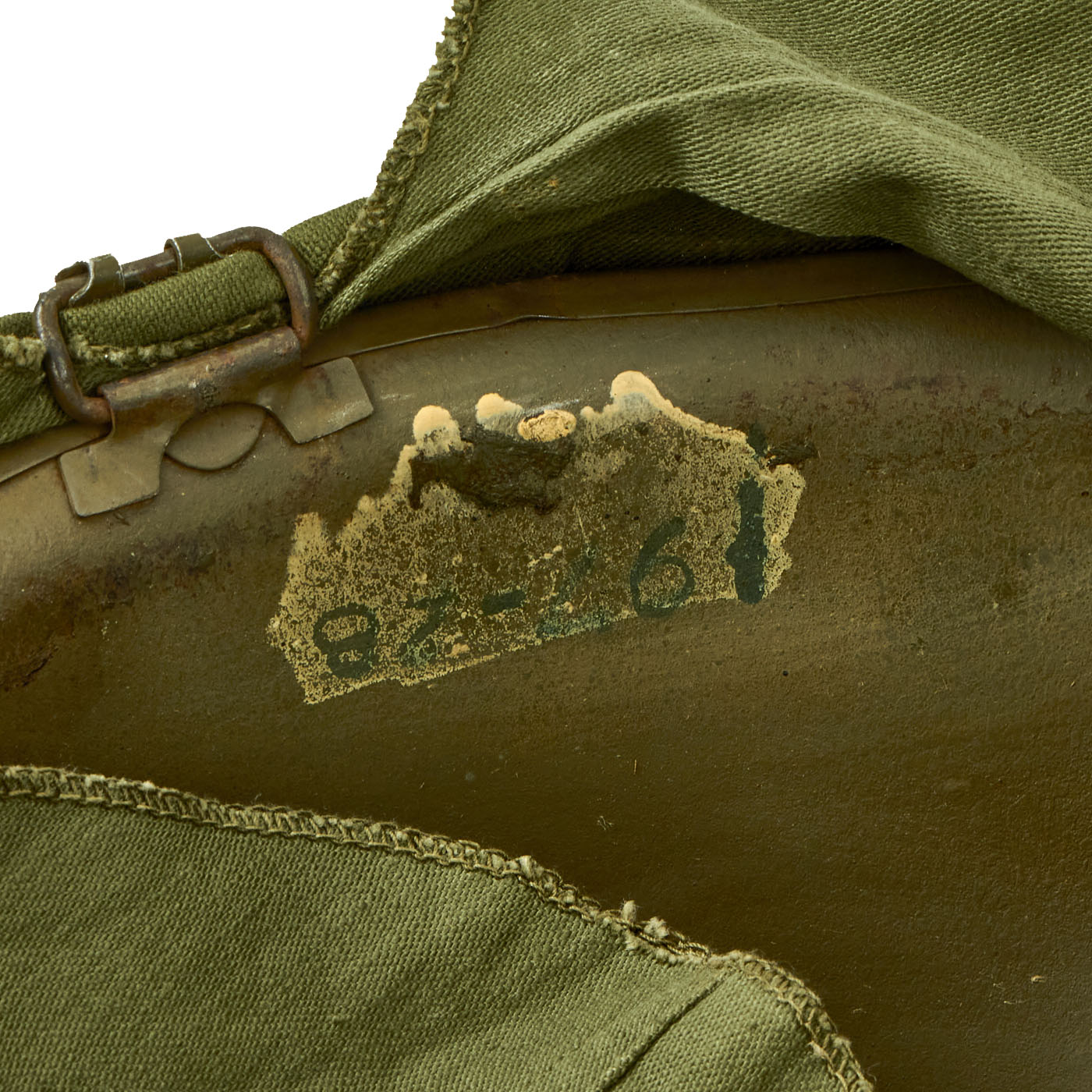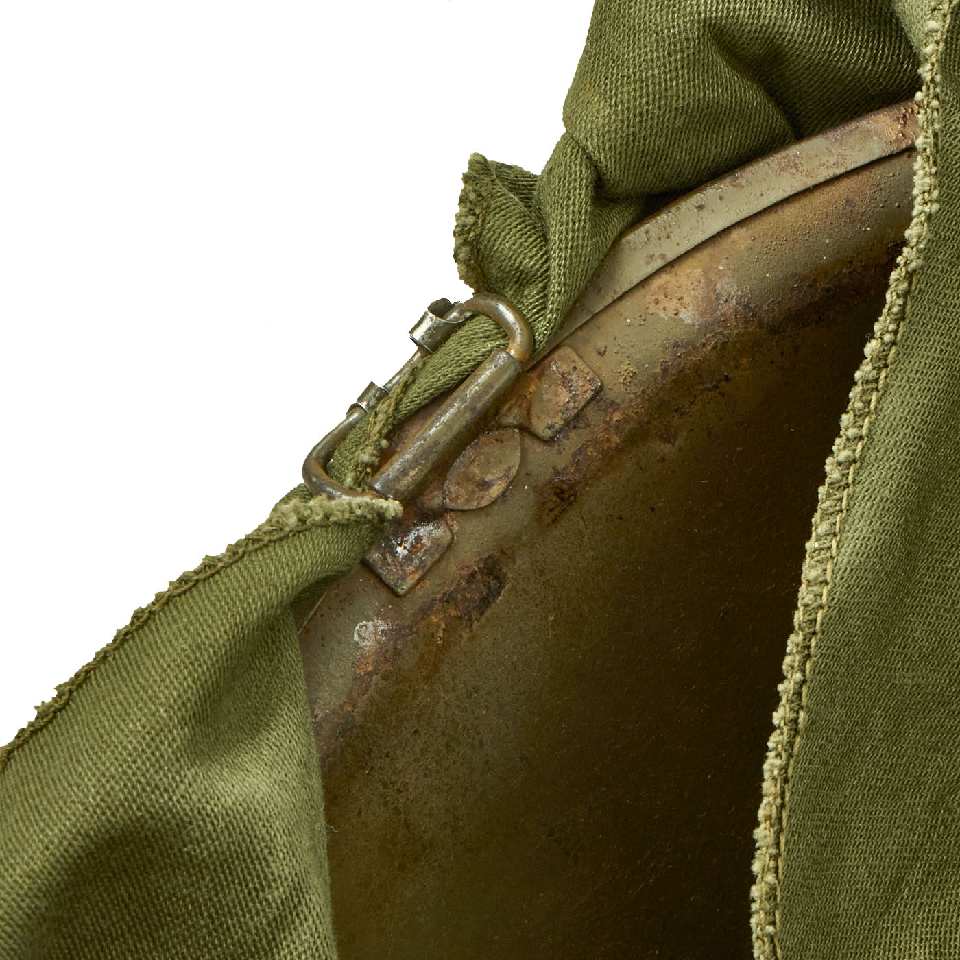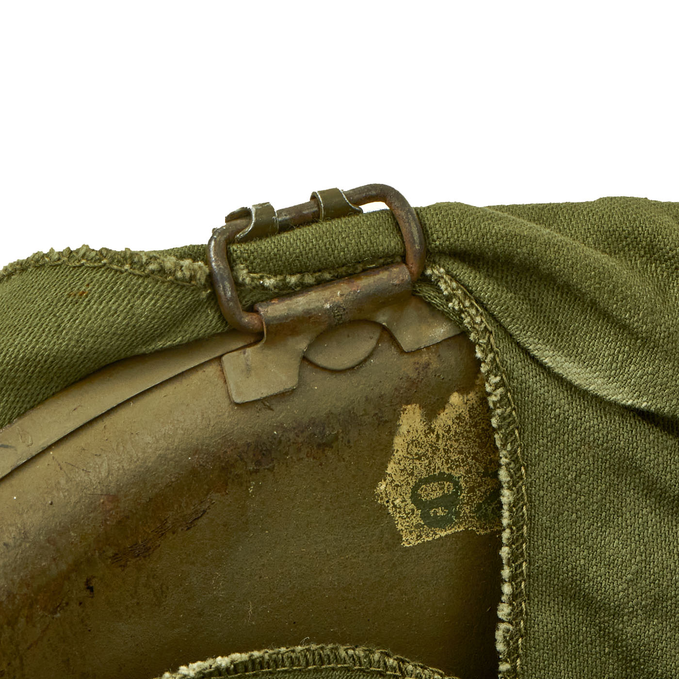 This is a very nice example of a Korean War Era Issue M1 Helmet as used during the Korean War Era and into the early Vietnam Conflict. The shell looks to be a standard Korean war issue or possibly late WWII, and has swivel bales and a manganese steel rim with a rear seam. There is a faint heat lot stamp, which we cannot see clearly due to the repainting done at the depot. It is fitted with a correct Korean war style chin strap, which uses bent metal brackets to attach to the "bales", and also has a separate connector in the buckle, designed to break if put under excessive strain, preventing injury.