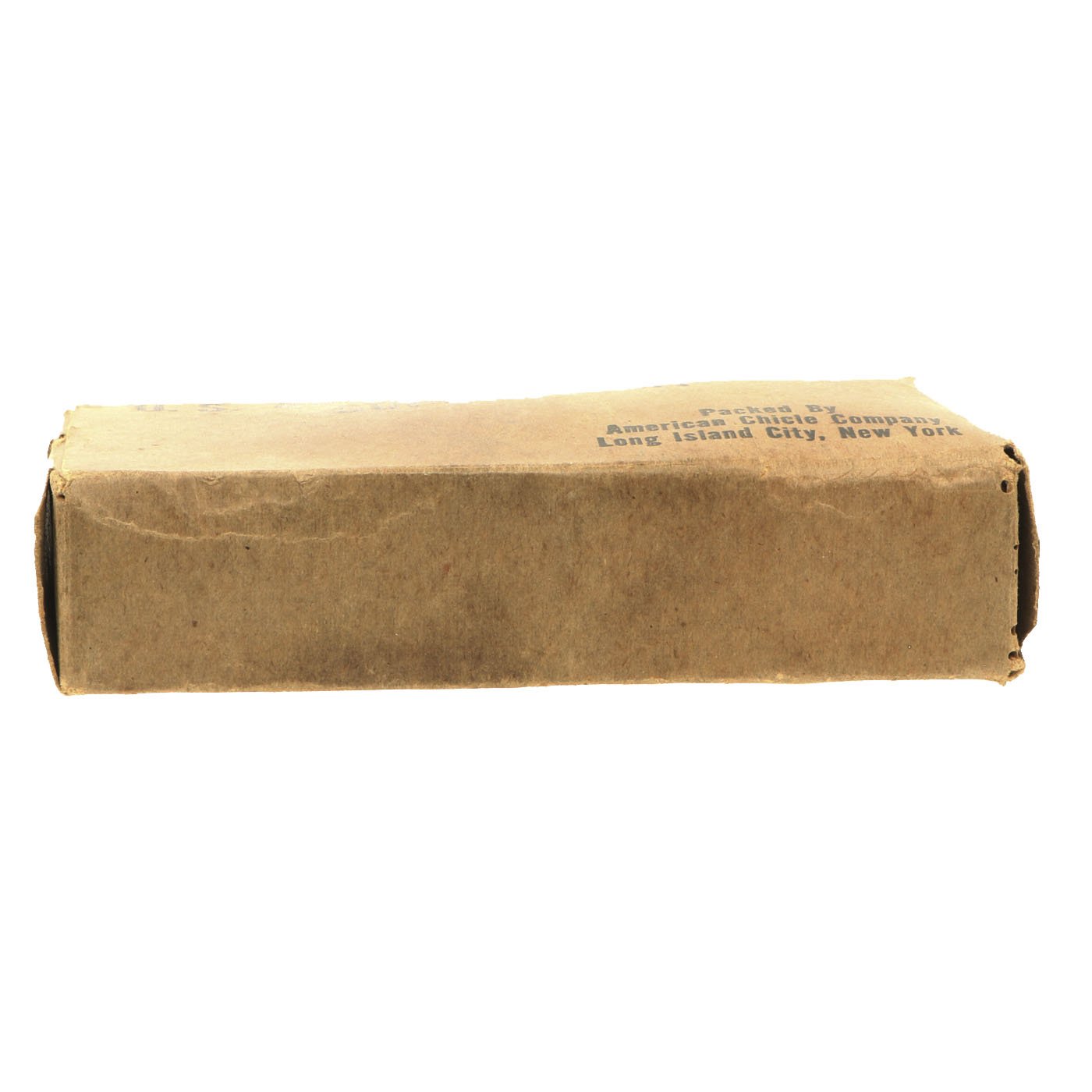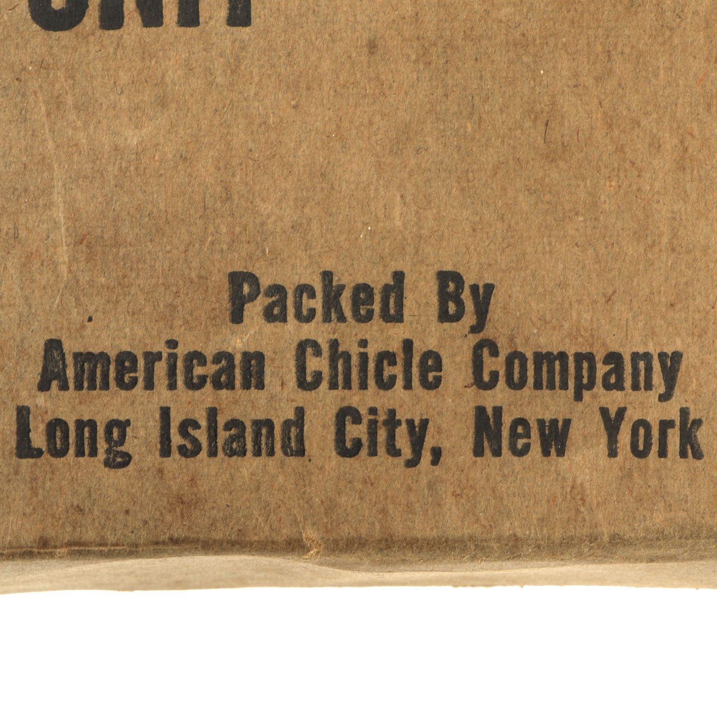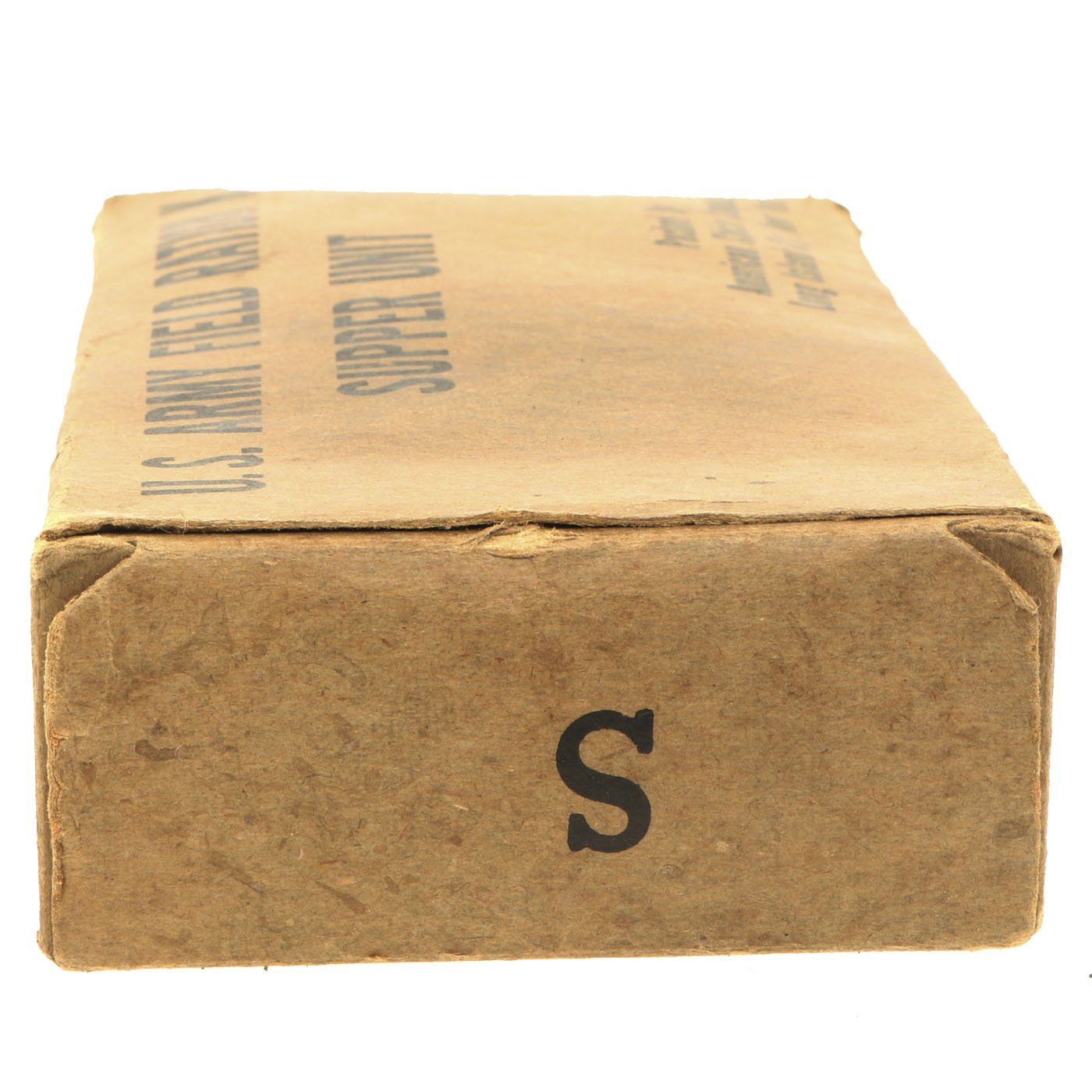 This example is a rare early war plain brown box version (pre-morale series) Supper Unit. It is nicely marked on the front U.S. ARMY FIELD RATION K SUPPER UNIT and on the side Packed by American Chicle Company Long Island City, New York. It looks like the interior cardboard box may have been opened. We have not removed the box from the interior to check on the contents, however there are some small holes on the outside, so we suspect that there has been some insect damage.