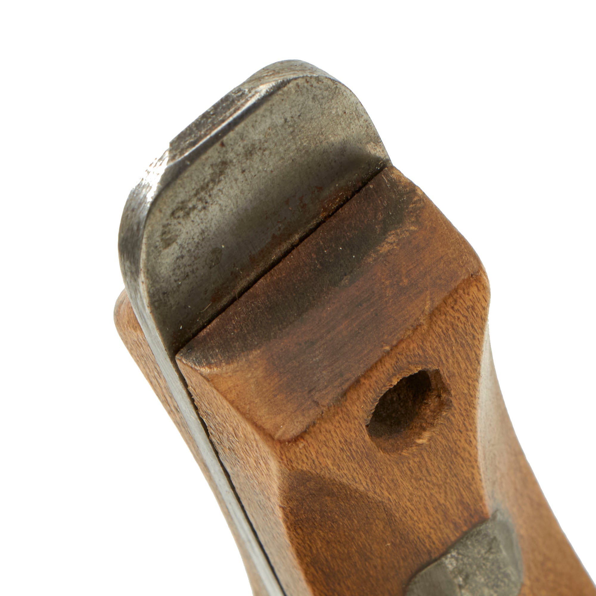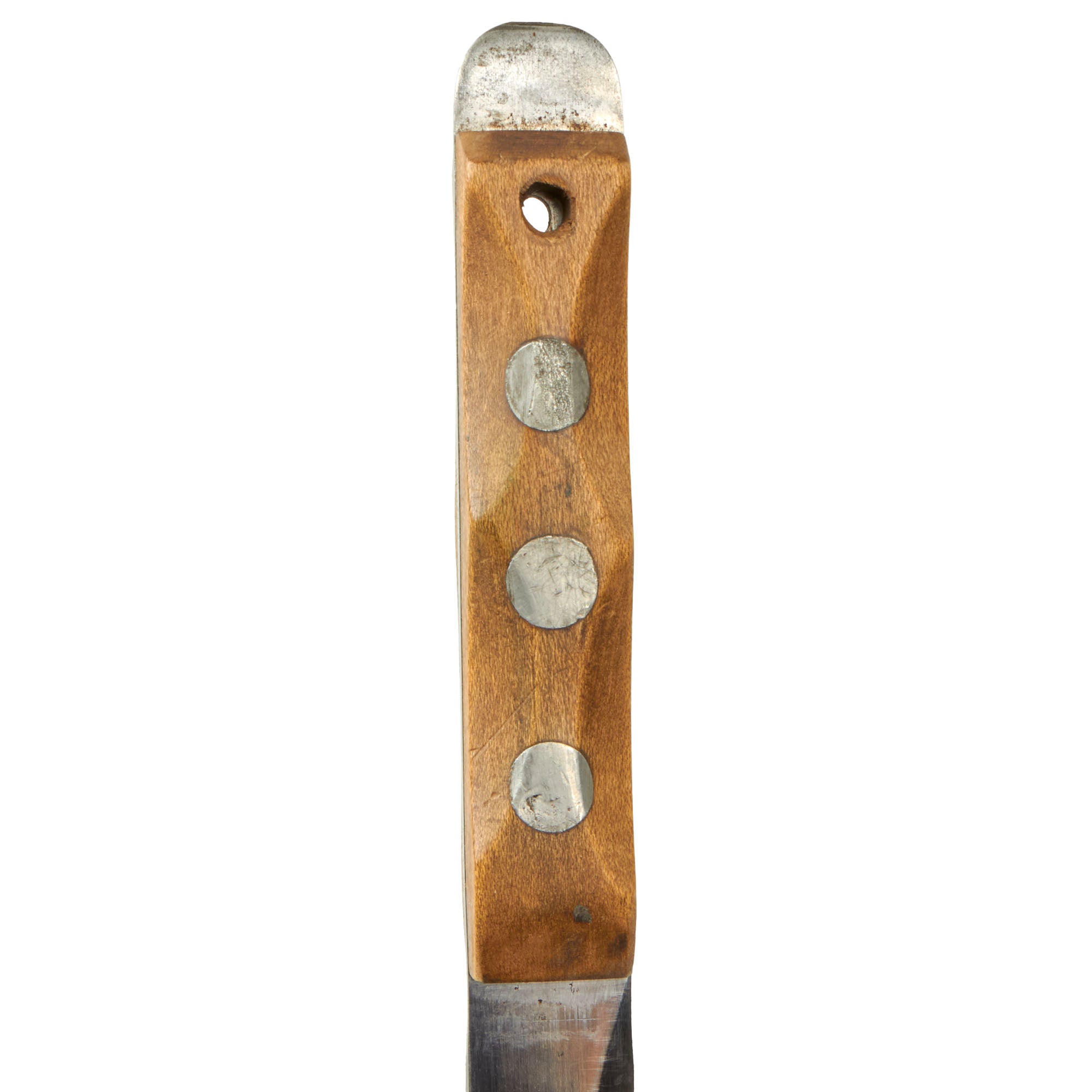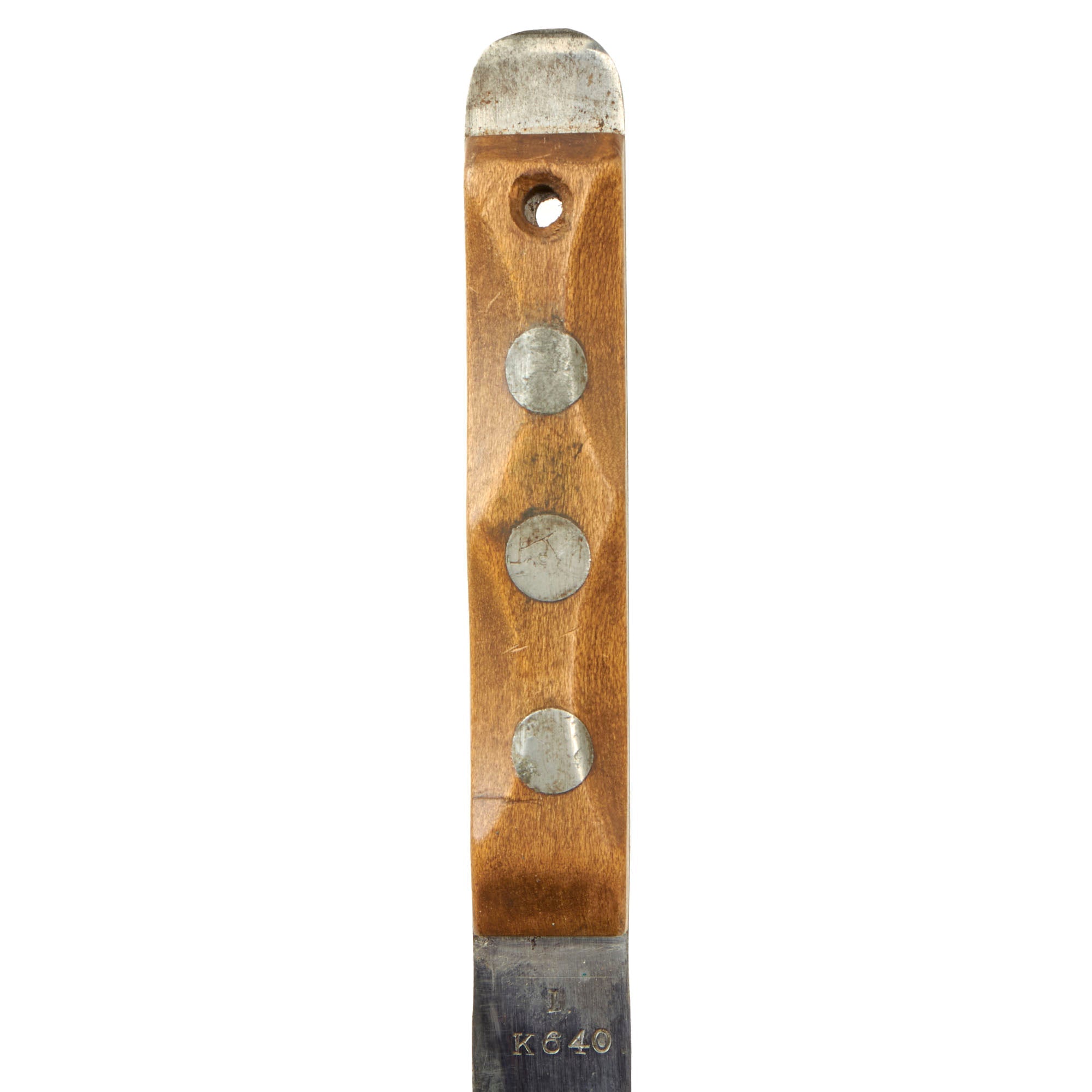 The original EK knives were made of Nickel-Chrome-Molybdenum Steel, likely 4340, which provided durability and some rust resistance. During the war, 4340 steel was scarce as it was commonly used in aircraft manufacturing. The government's decision to allow EK to continue using this steel in his knives was a testament to their quality. EK opted to use maple wood handles in place of compressed leather washers and affixed them to the full tang with lead-filled rivets, which could be pounded back into the handle if it became loose. EK believed that wood handles would resist rot better than leather. Additionally, each knife came with sandpaper to allow soldiers to customize the grip to fit their hand as desired, rather than relying on a factory-made grip.