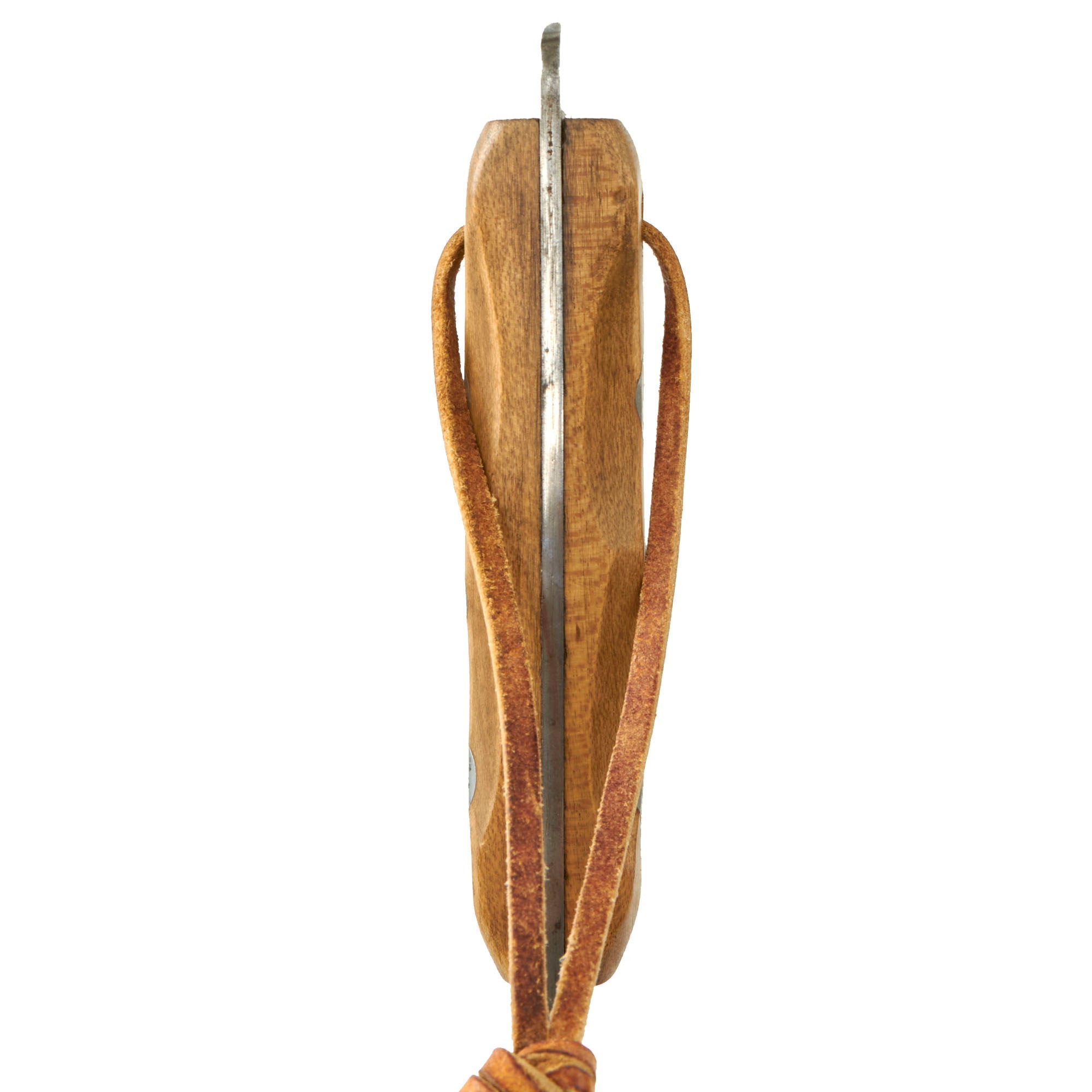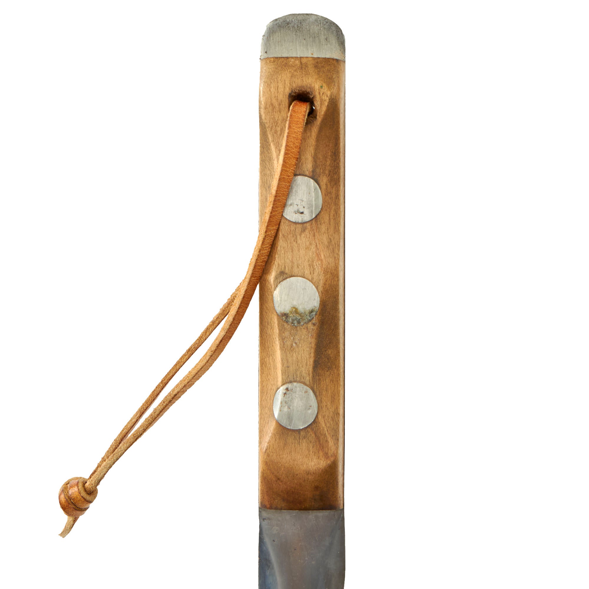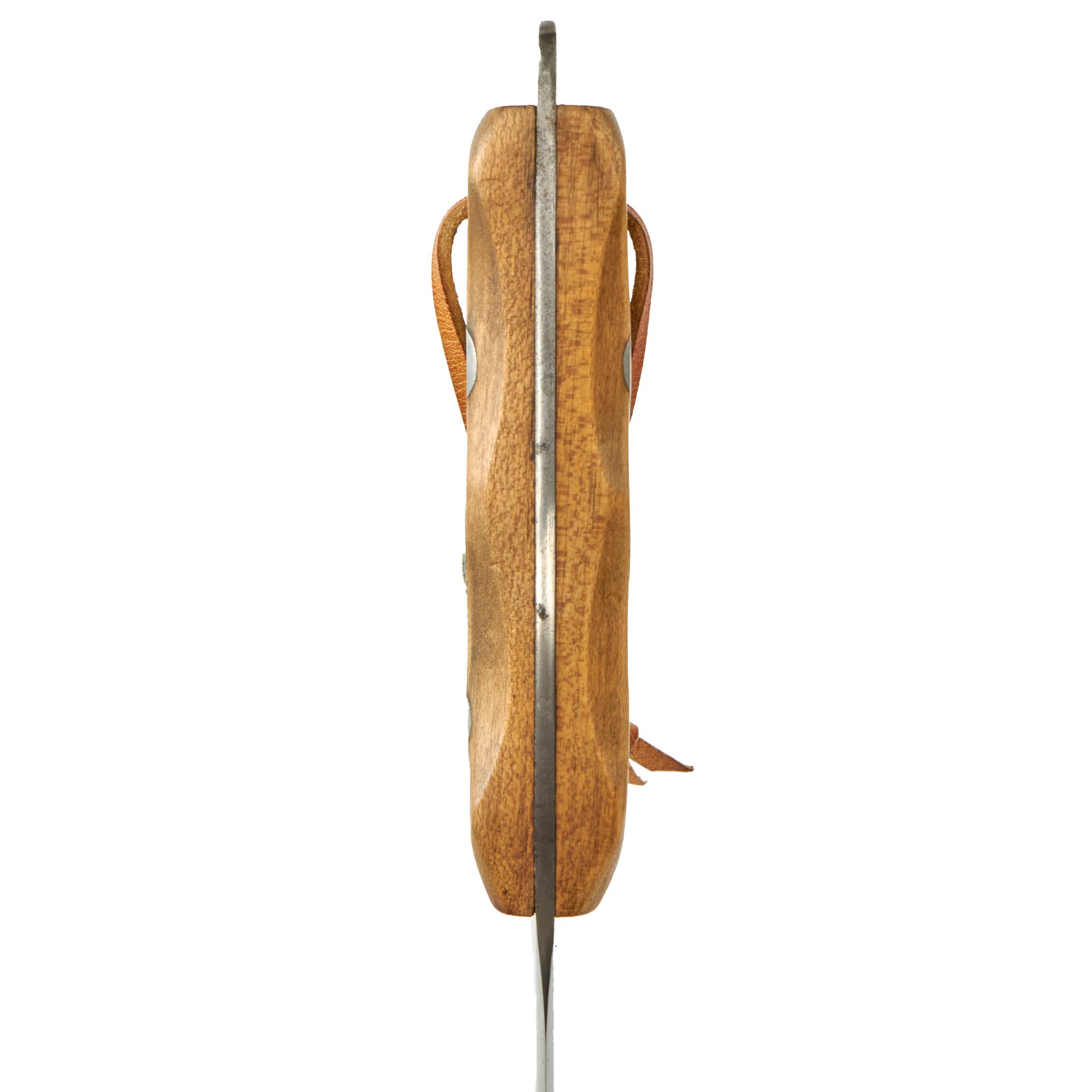 The original EK knives were made of Nickel-Chrome-Molybdenum Steel, likely 4340, which provided durability and some rust resistance. During the war, 4340 steel was scarce as it was commonly used in aircraft manufacturing. The government's decision to allow EK to continue using this steel in his knives was a testament to their quality. EK opted to use maple wood handles in place of compressed leather washers and affixed them to the full tang with lead-filled rivets, which could be pounded back into the handle if it became loose. EK believed that wood handles would resist rot better than leather. Additionally, each knife came with sandpaper to allow soldiers to customize the grip to fit their hand as desired, rather than relying on a factory-made grip.
