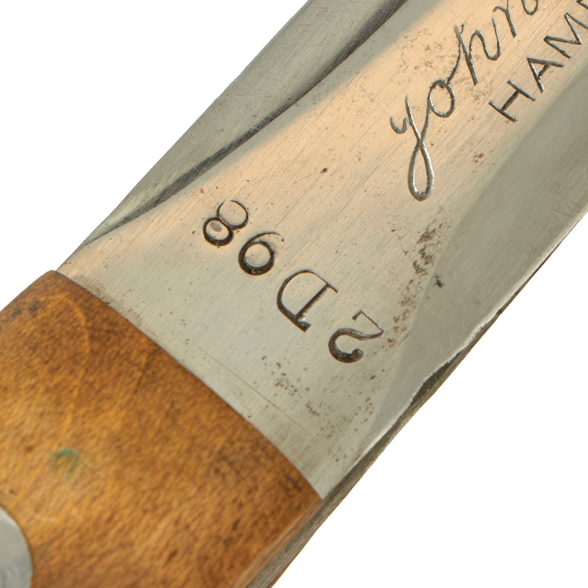 The knife’s serial number is present and reads as 2D98, which is an extremely low number, making this Model 2 an even more rarity. The first number on the blade is the model number (2); the subsequent numbers are the serial number, preceded by a letter of the alphabet (D). Starting with the 1,000th knife, the letter A preceded the serial number. Serial numbers following the alphabetical prefix went up to 999 prior to shifting over to the next letter of the alphabet.