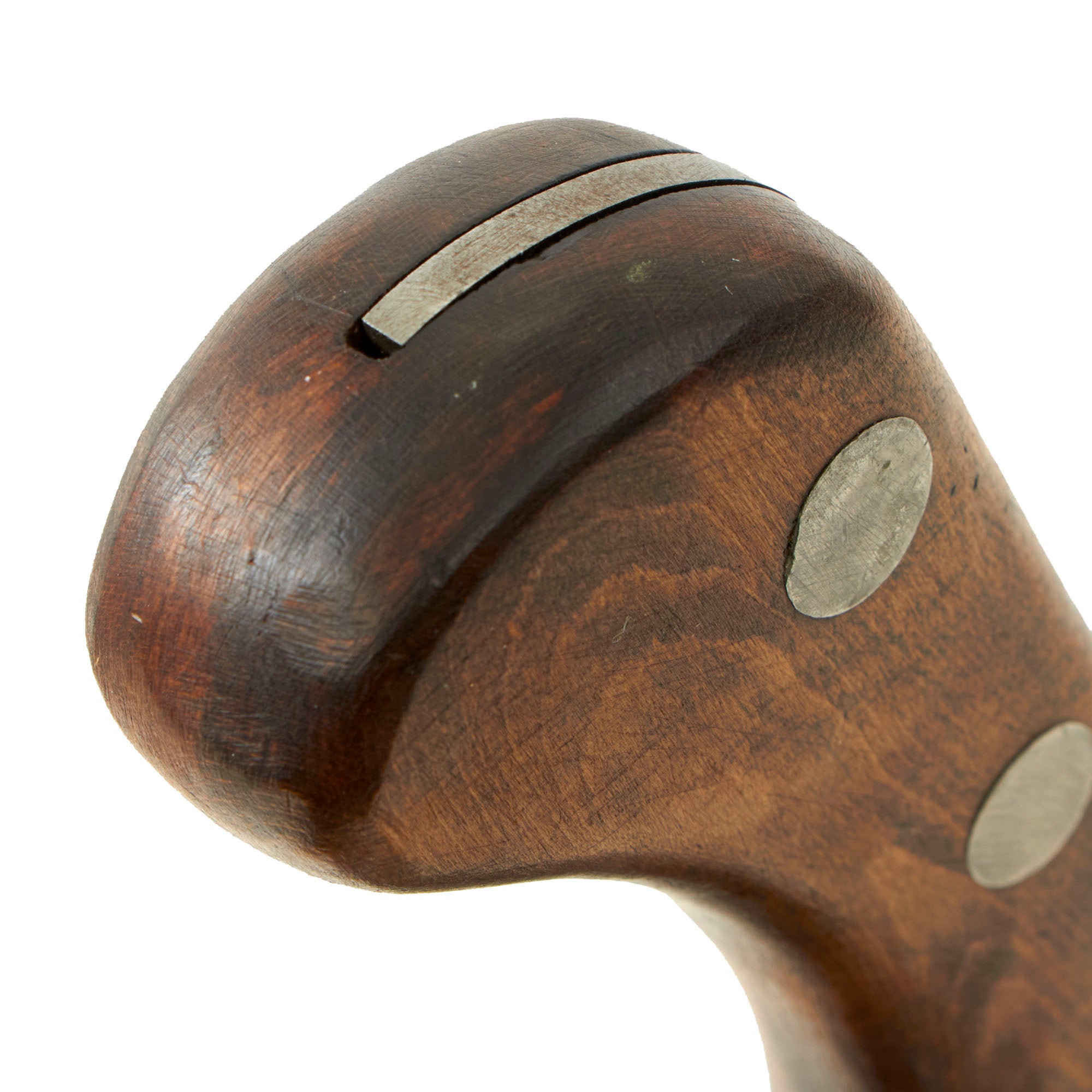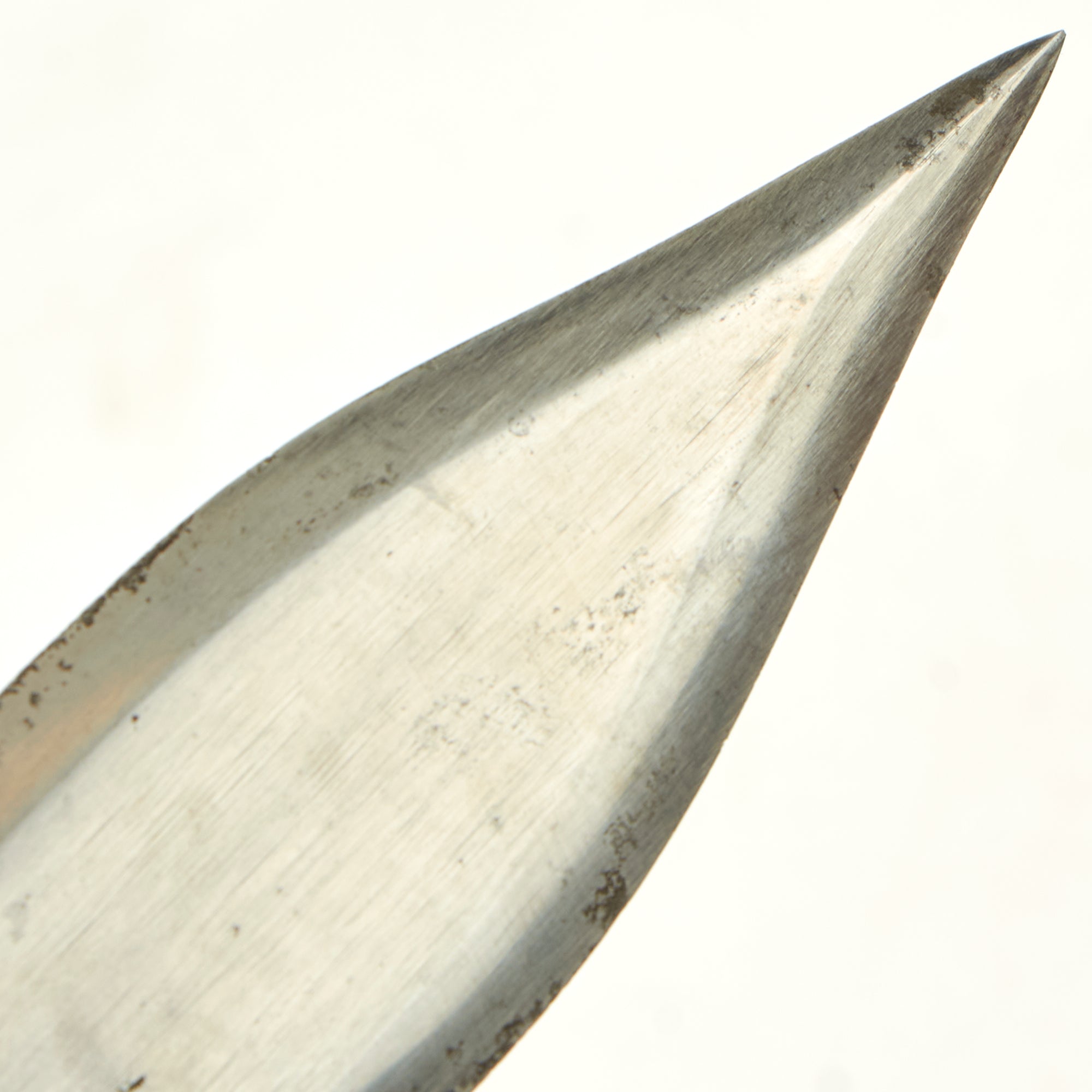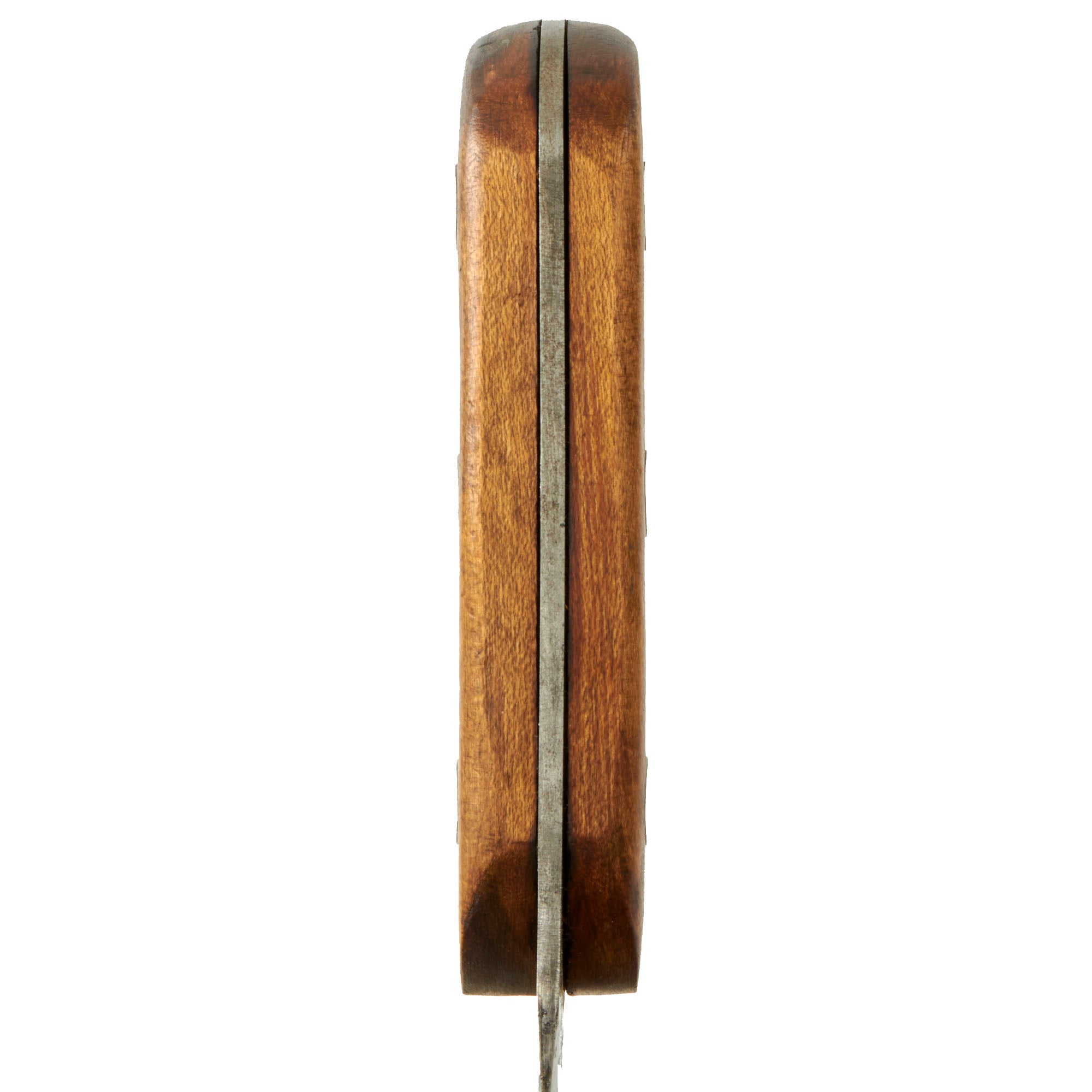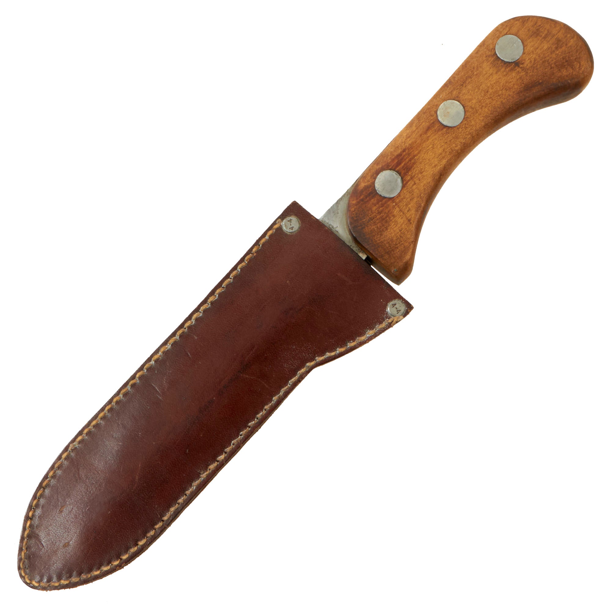 The original EK knives were made of Nickel-Chrome-Molybdenum Steel, likely 4340, which provided durability and some rust resistance. During the war, 4340 steel was scarce as it was commonly used in aircraft manufacturing. The government's decision to allow EK to continue using this steel in his knives was a testament to their quality. EK opted to use maple wood handles in place of compressed leather washers and affixed them to the full tang with lead-filled rivets, which could be pounded back into the handle if it became loose. EK believed that wood handles would resist rot better than leather. Additionally, each knife came with sandpaper to allow soldiers to customize the grip to fit their hand as desired, rather than relying on a factory-made grip.