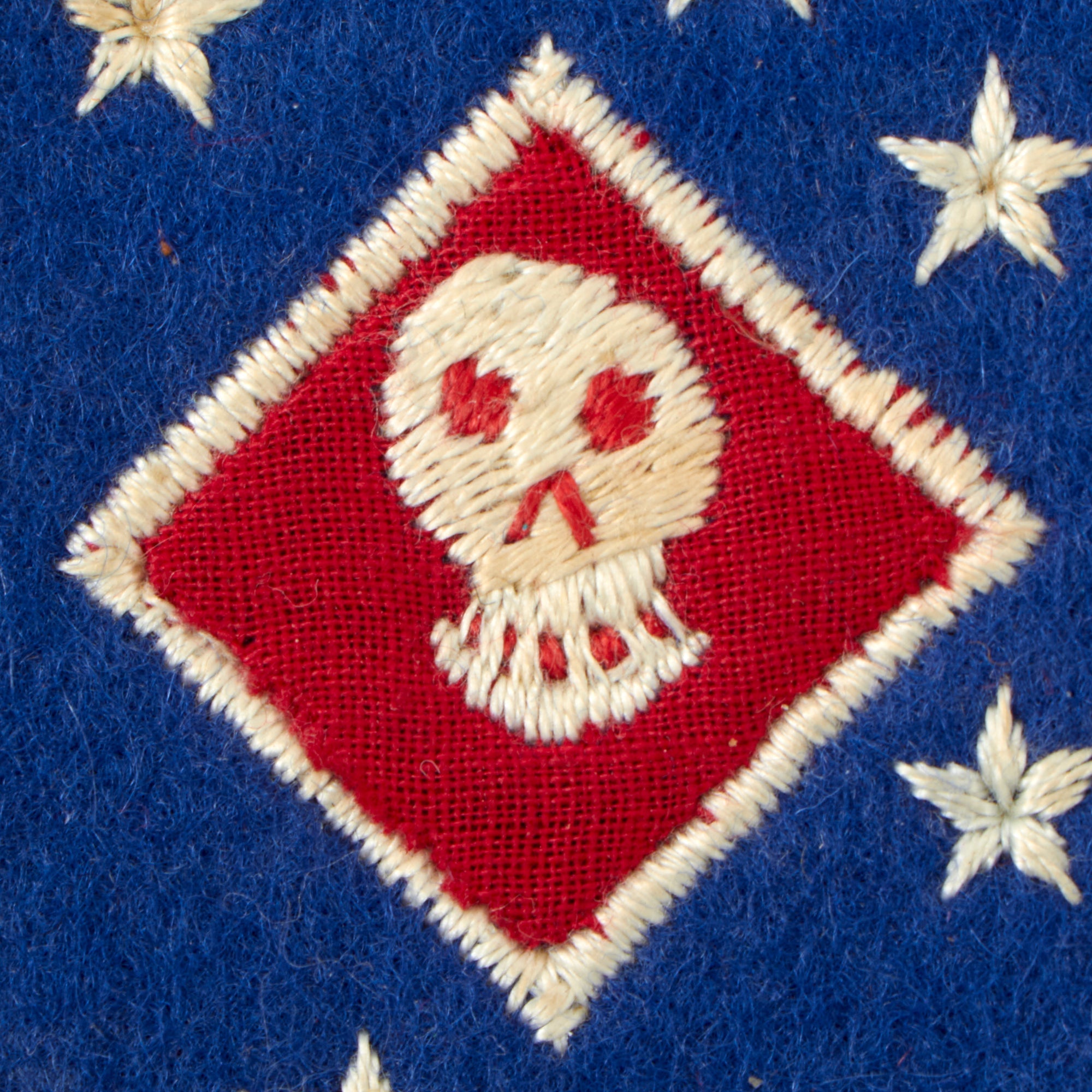 The patch measures 2¼ x 2⅞”, embroidered on light blue wool felt with a blue border and five stars surrounding a red diamond with a hand-stitched skull. The patch is offered in excellent condition with no flaws.