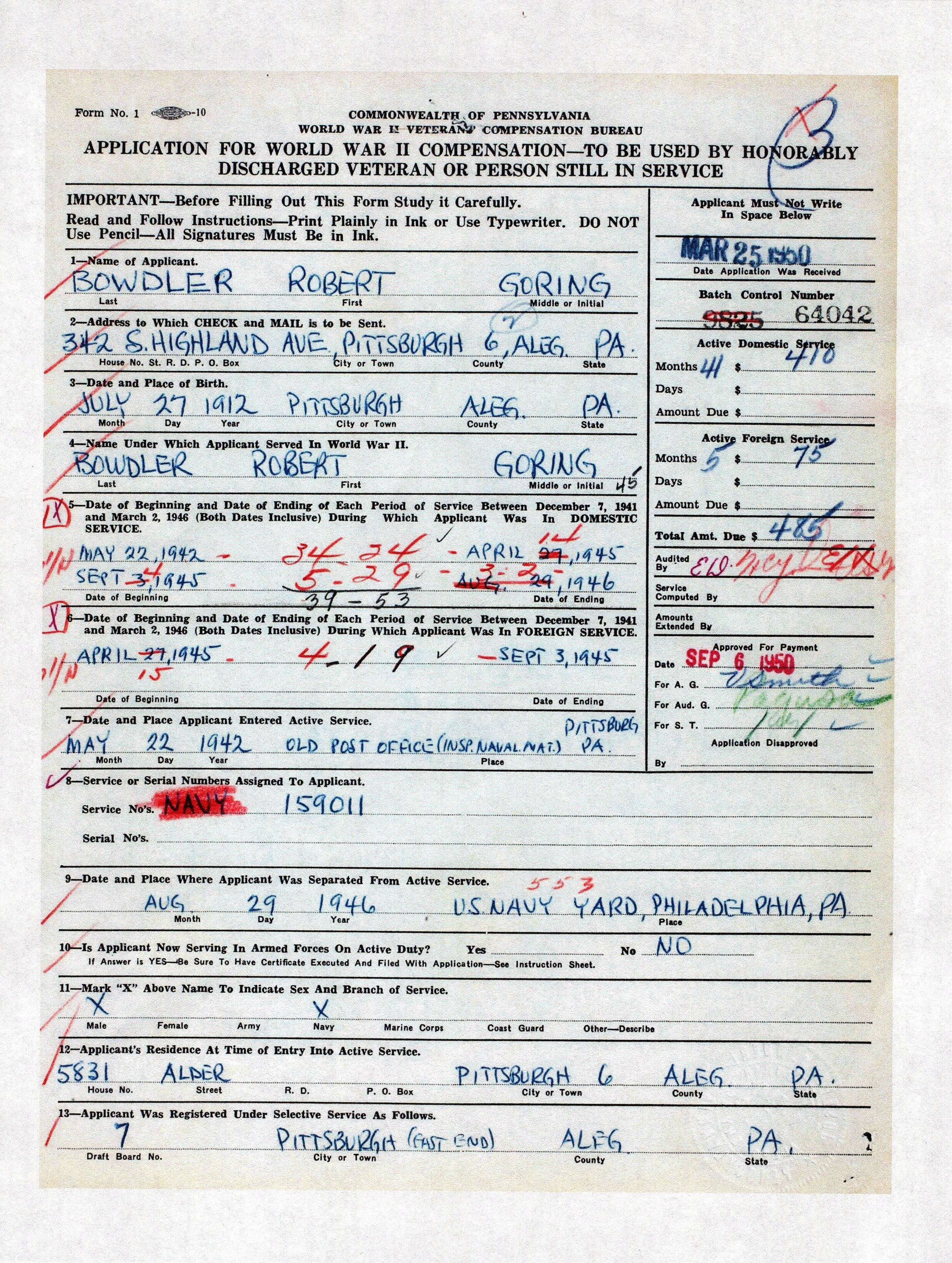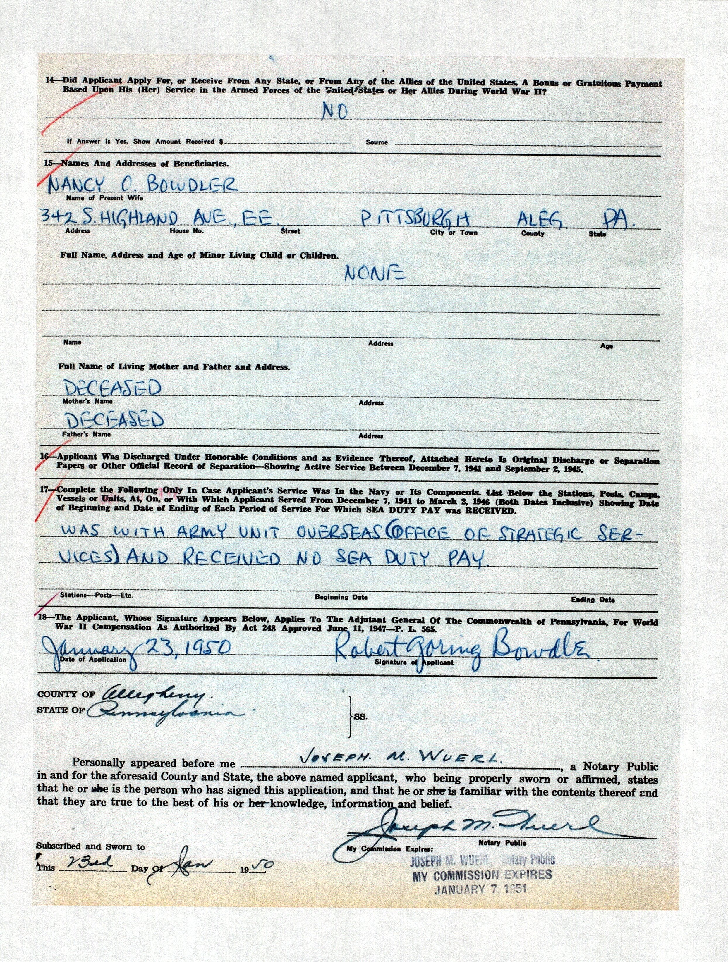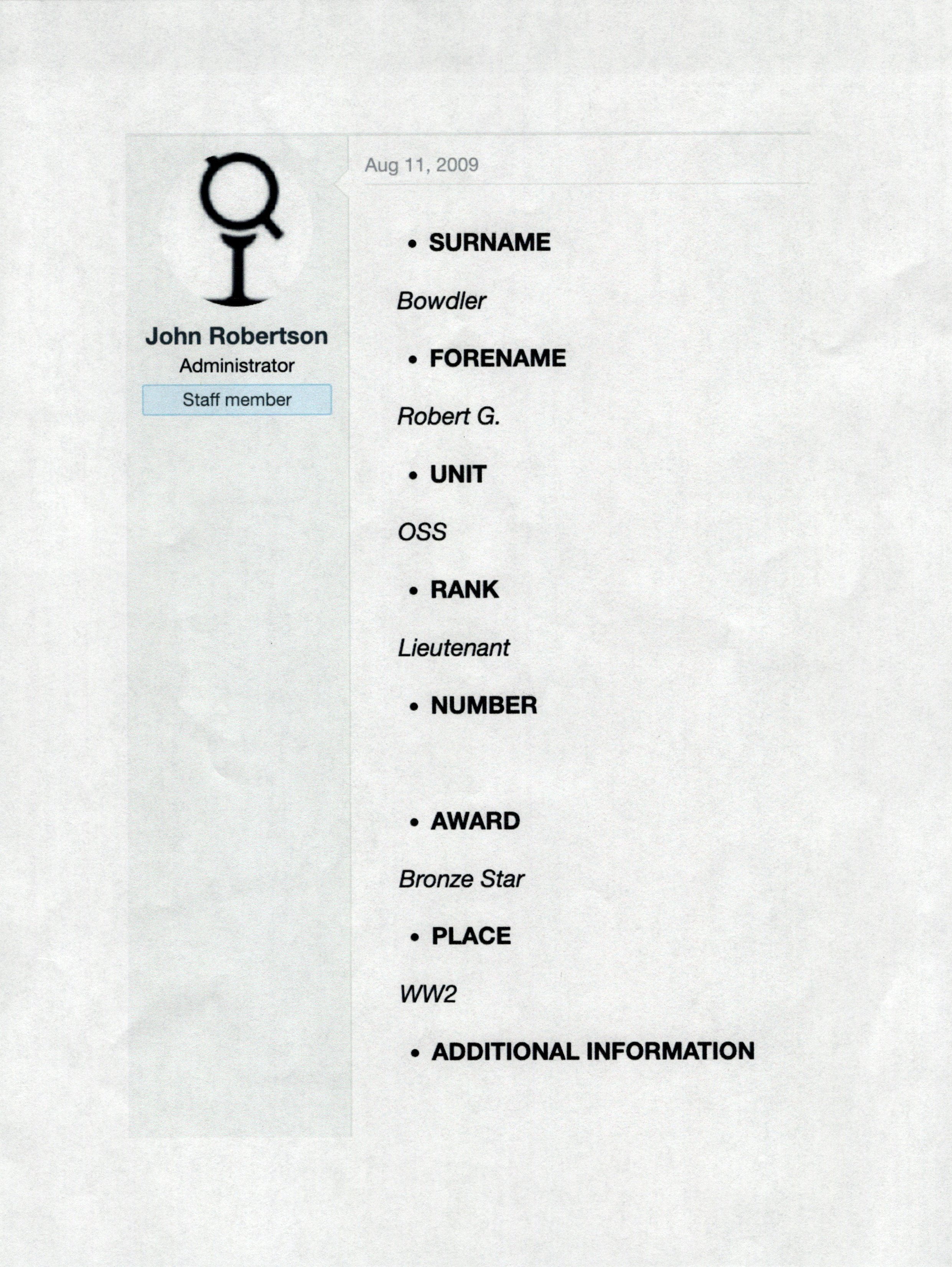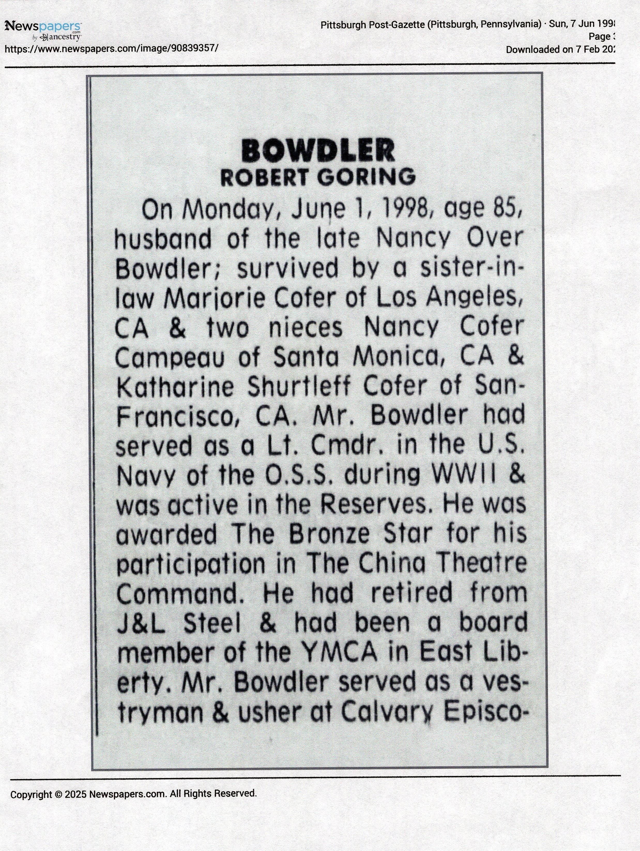 This is the engraved Bronze Star Medal of Navy Lieutenant Commander Robert Goring Bowdler. Bowdler was awarded the Bronze Star for his participation in the China Theatre Command during the war.
