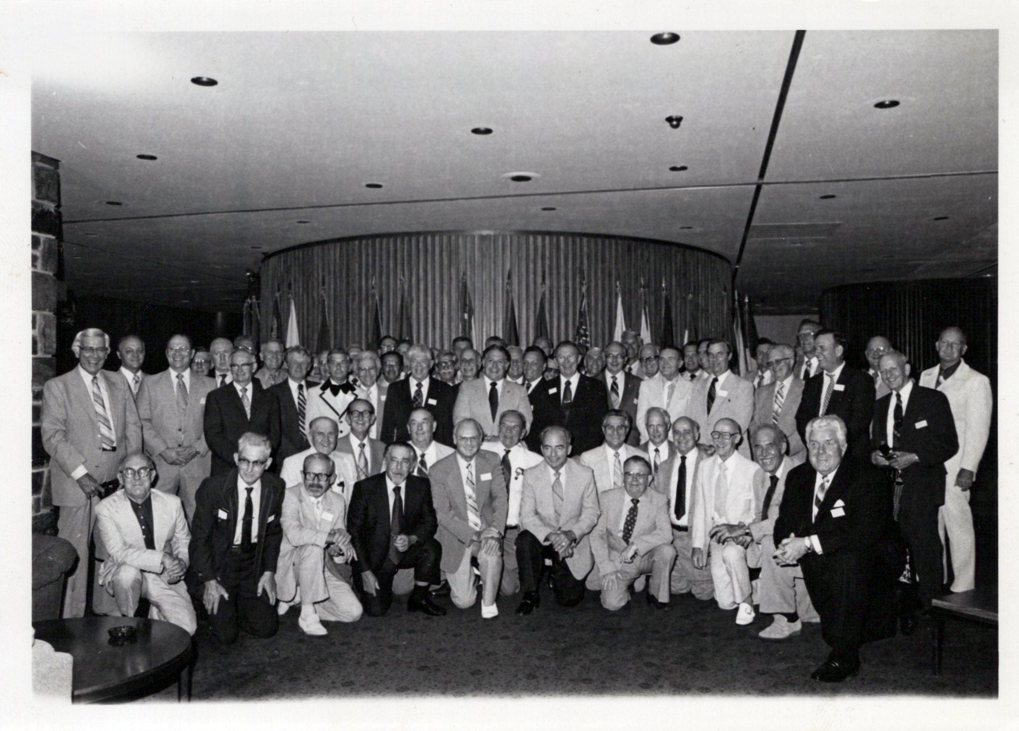 -Unsigned photograph of the Enola Gay crew decades later at a reunion. 5 x 7”.