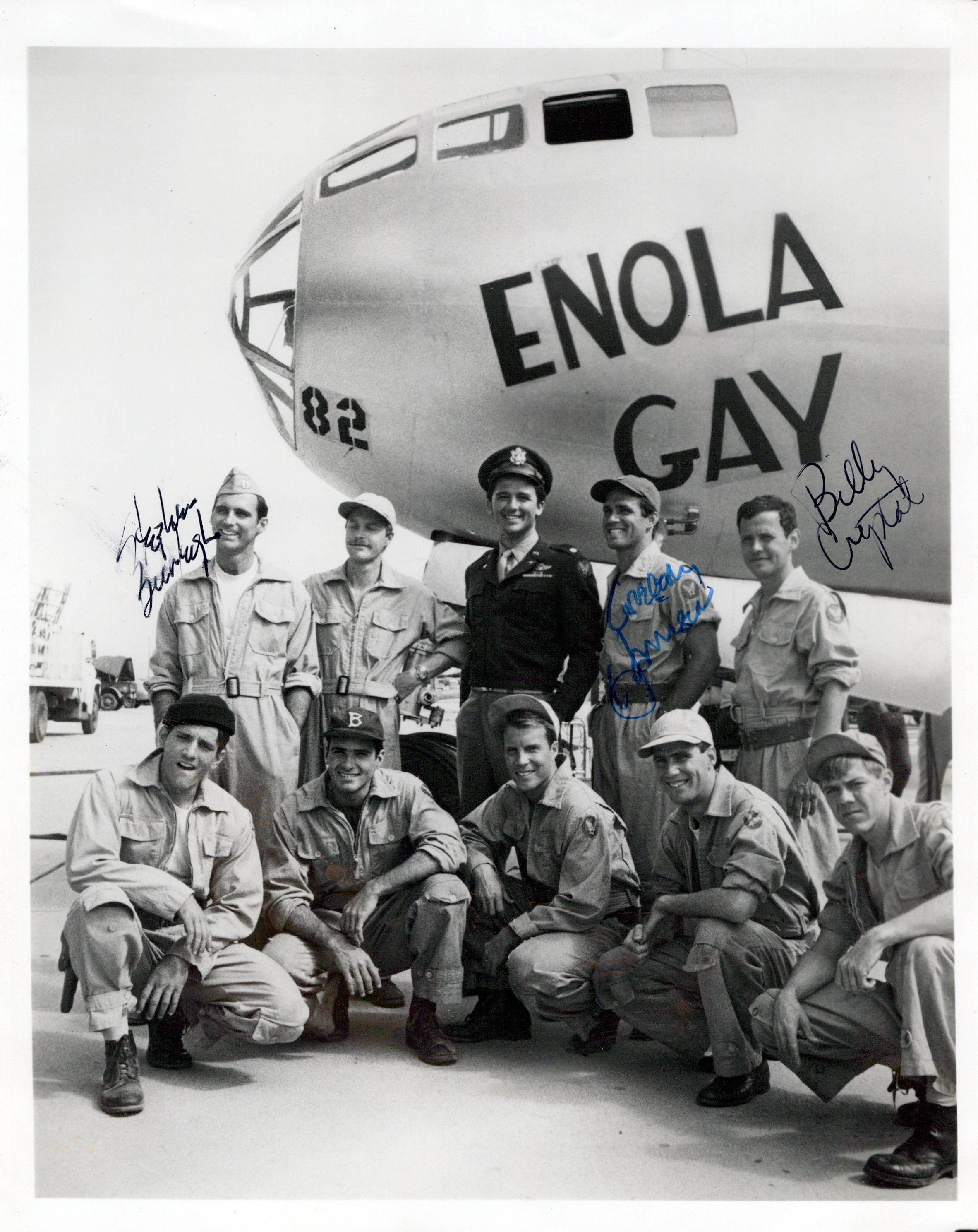 -Movie photo - Crew of Enola Gay with three signatures of men who played the roles of the soldiers in Enola Gay: The Men, the Mission, the Atomic Bomb, including Billy Crystal who played Lieutenant Jacob Beser, Stephen Burleigh who played Captain Theodore "Dutch" Van Kirk, and Gregory Harrison who played Captain Bob Lewis. 8 x 10”.