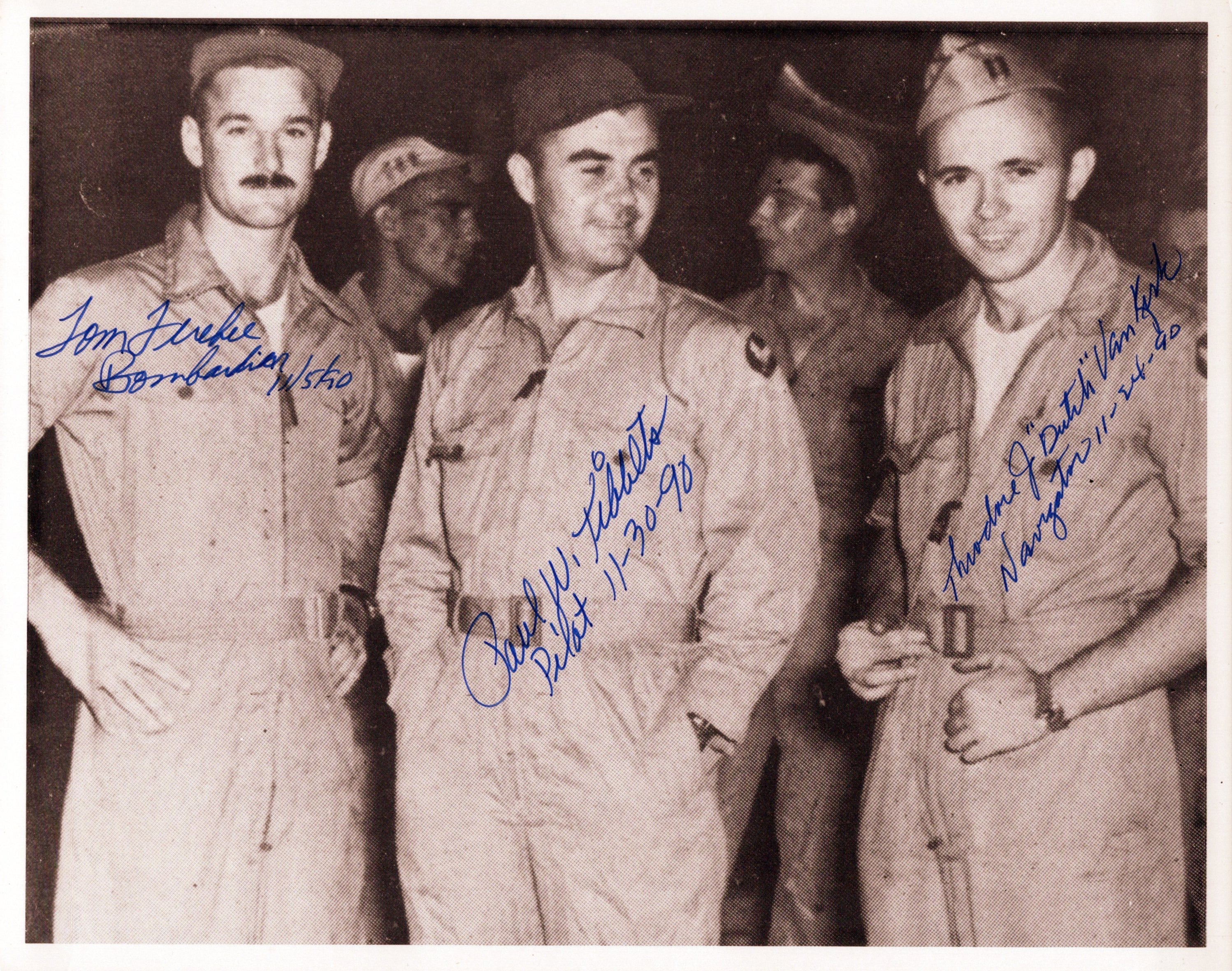 -Photo of Thomas Ferebee (11/5/90), Paul Tibbets (11-30-90), and Theodore "Dutch" Van Kirk (11-24-90) with all three men having signed the photograph with dates. Measures 8 x 10”. Identical to the previous photo besides having dates.