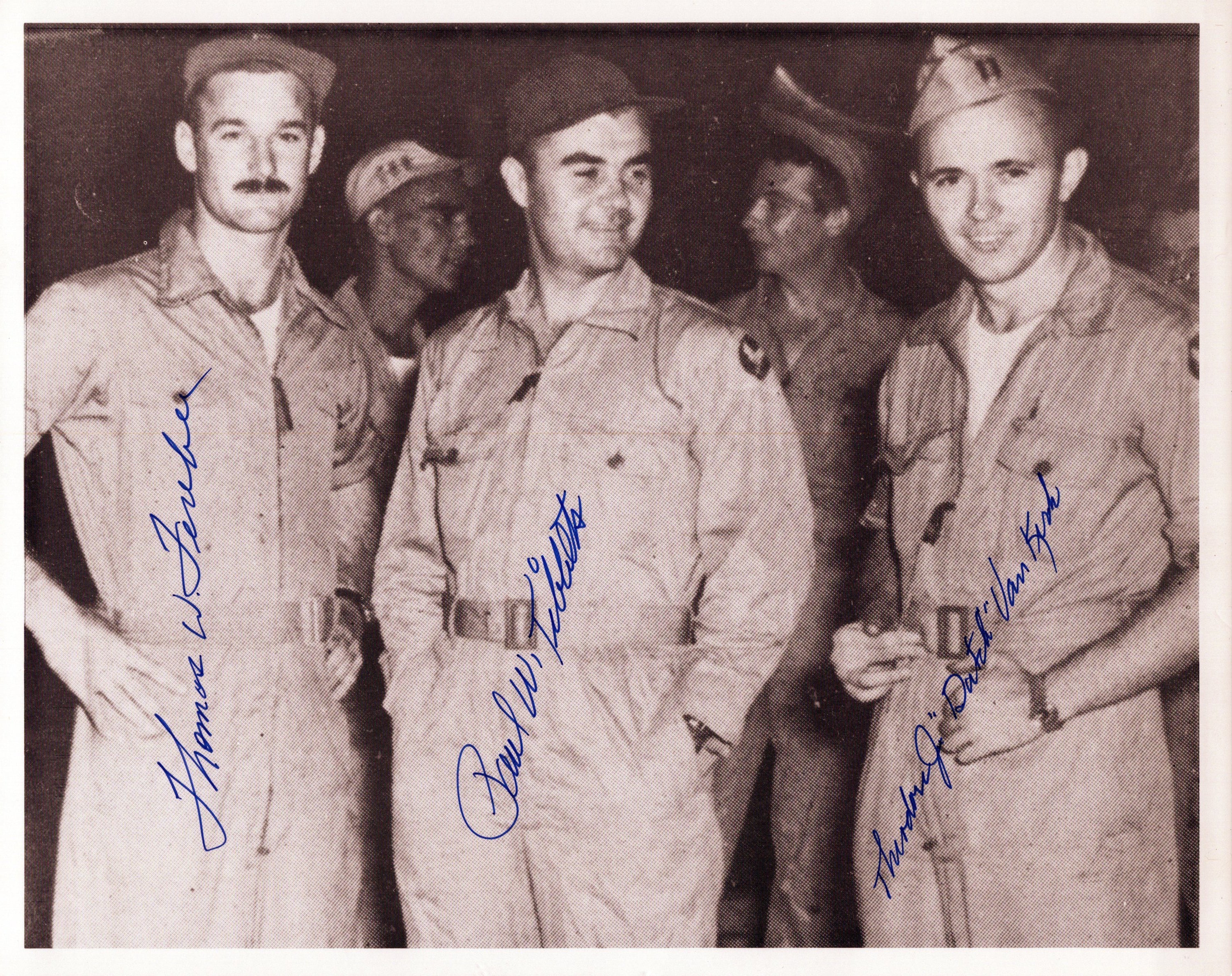 -Photo of Thomas Ferebee, Paul Tibbets, and Theodore "Dutch" Van Kirk with all three men having signed the photograph. Measures 8 x 10”.